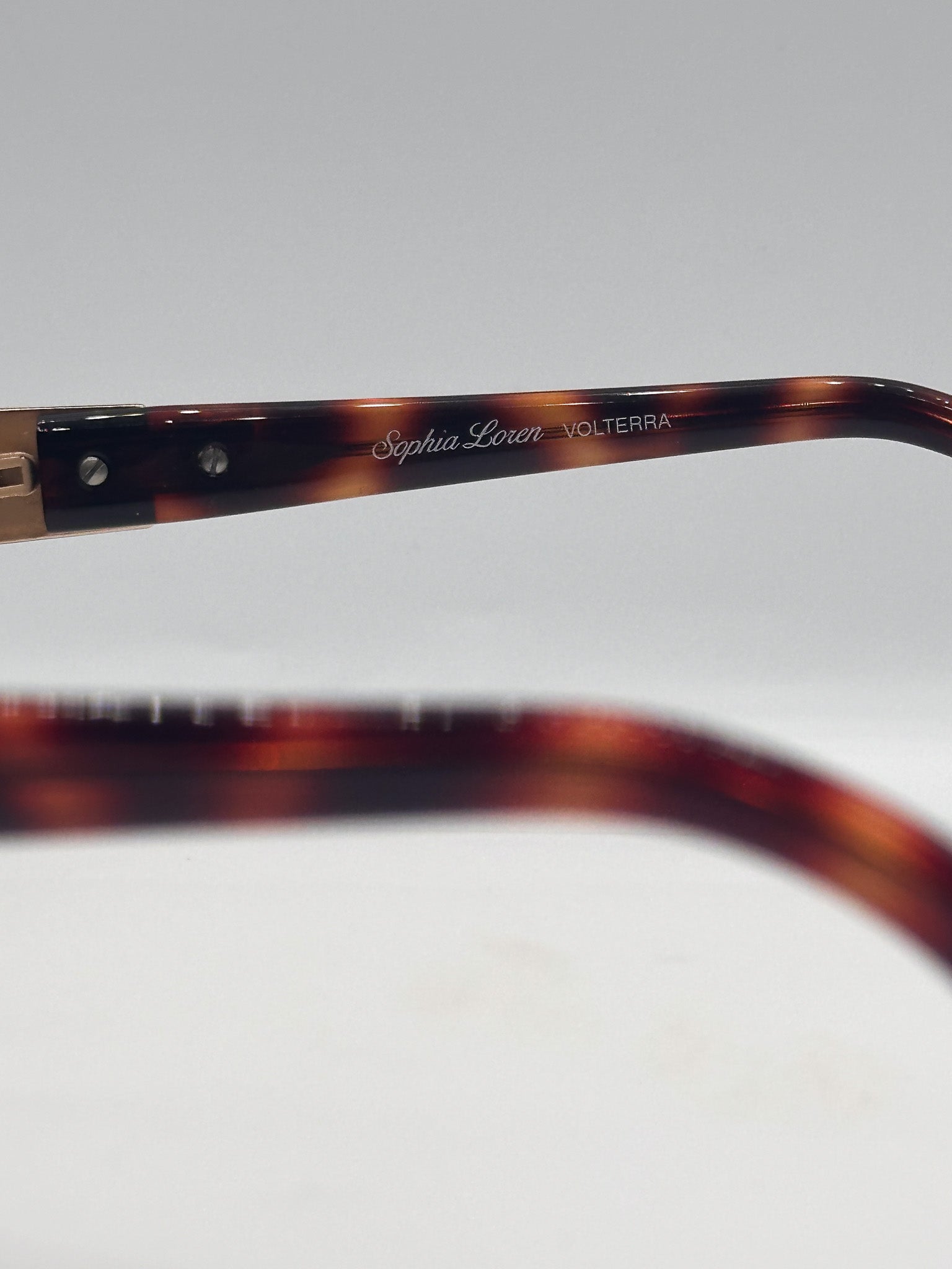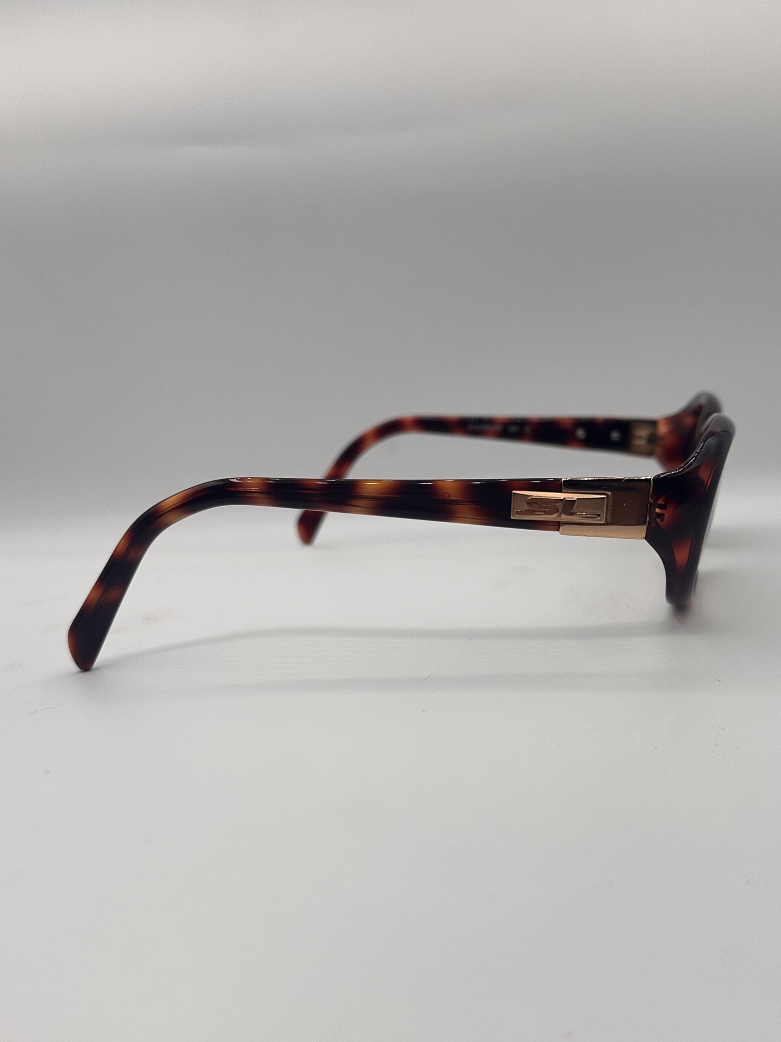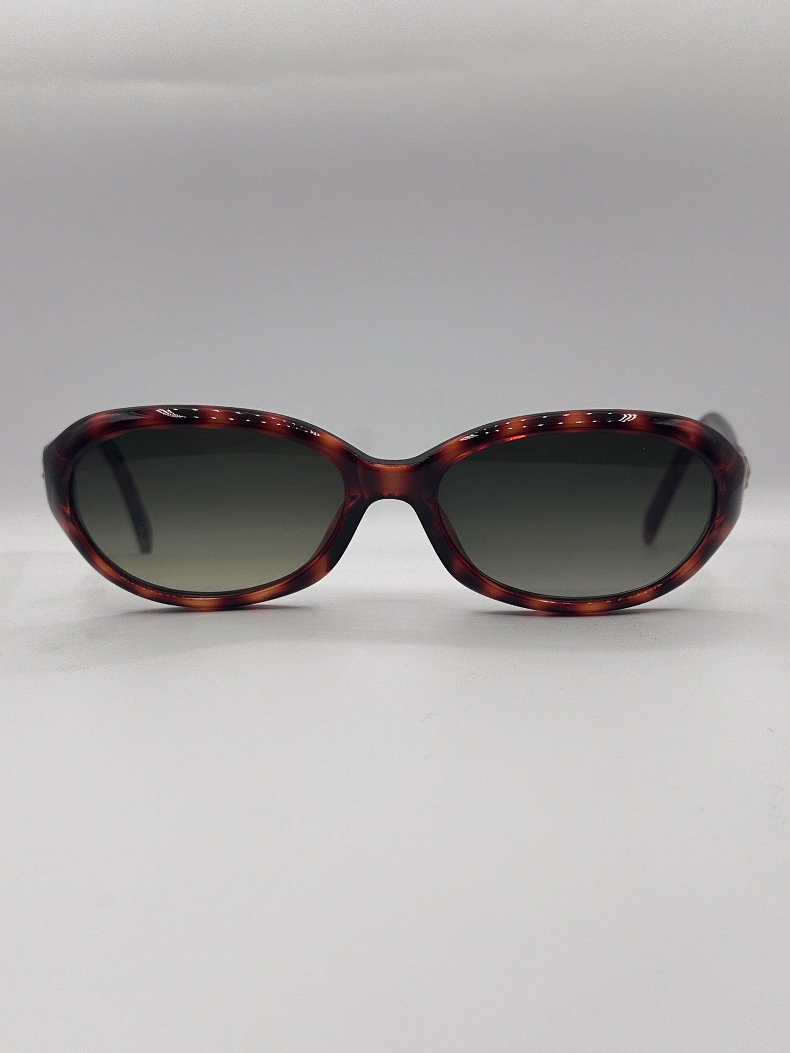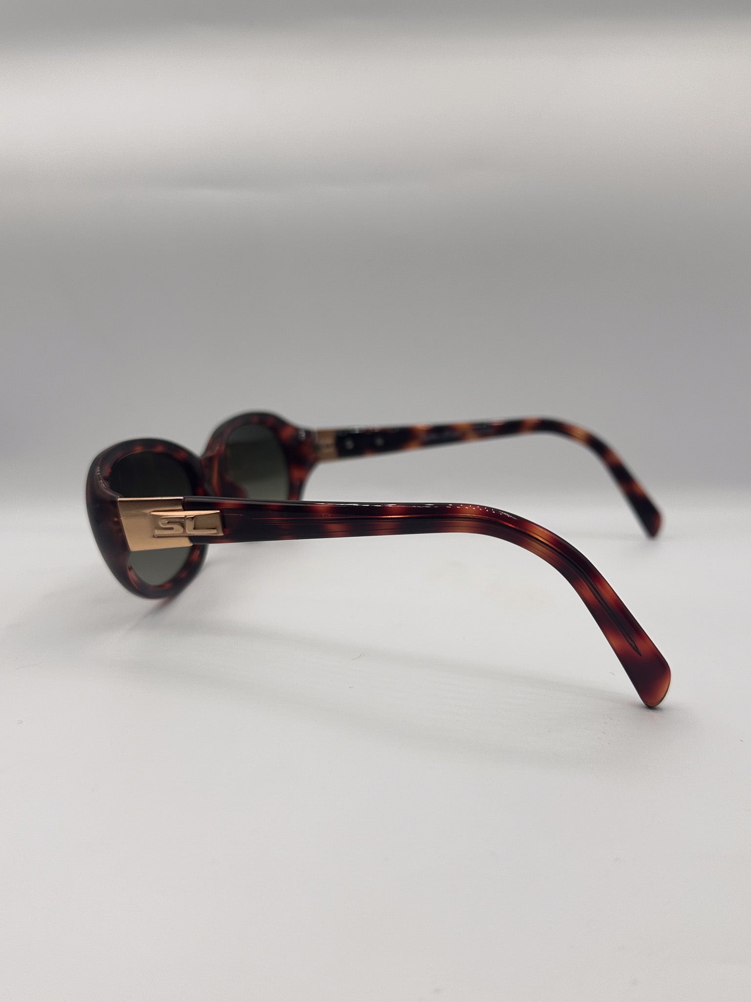 Stunning vintage oval, acetate sunglasses with a tortoise design and gold "SL" detailing at each ear hinge. Brand new UVA-protected green gradient lenses.
