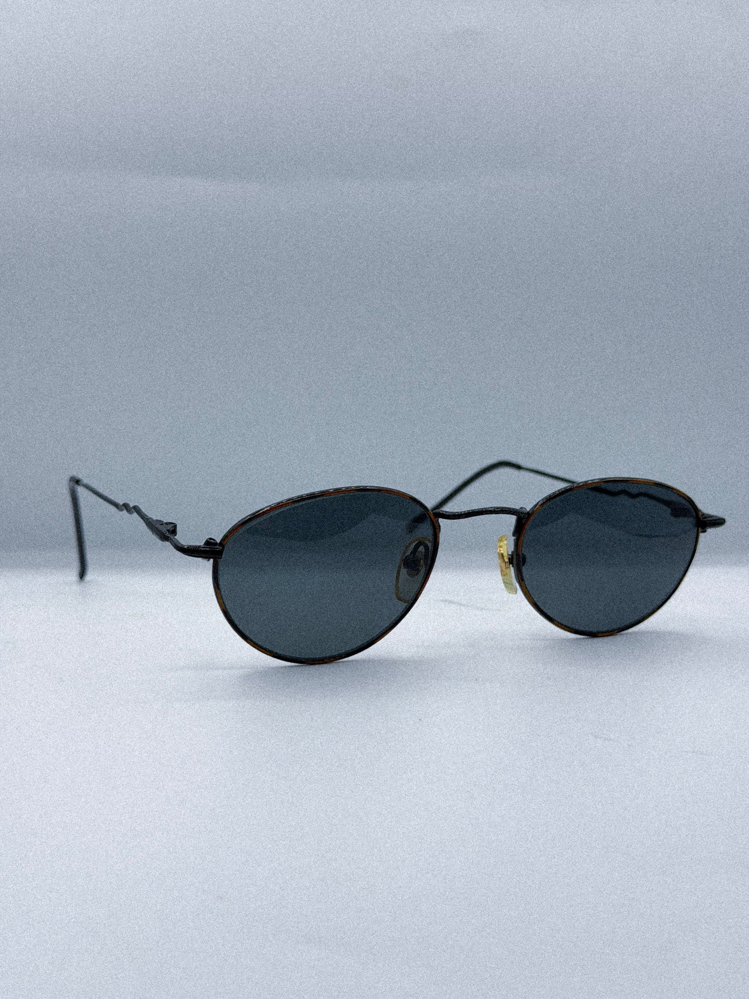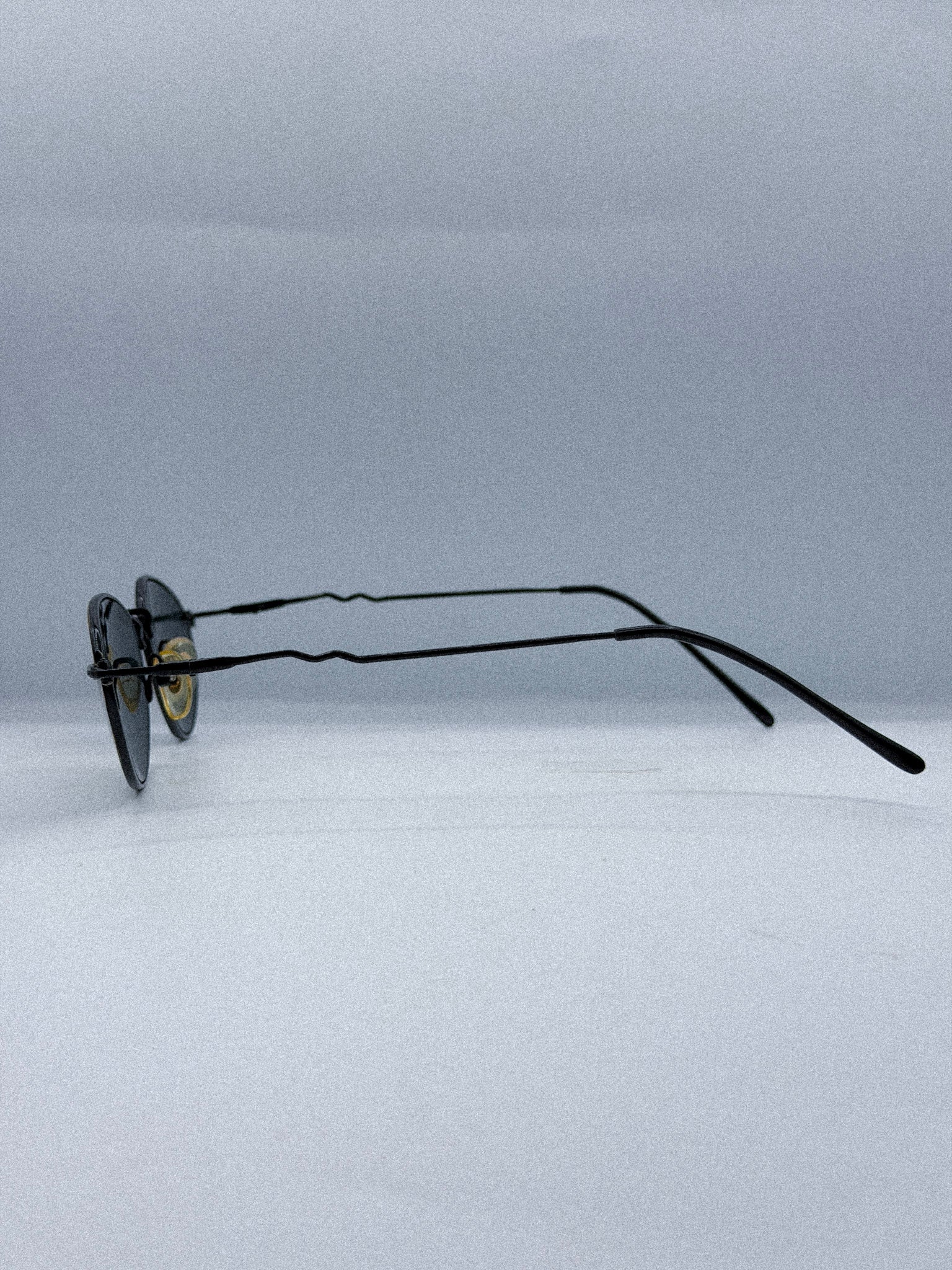 A quiet study in 1990s minimalism, this unbranded oval frame lets proportion and tone speak for themselves. The slim dark metal construction traces a restrained silhouette, paired with grey polarized lenses that offer a cool, composed clarity.