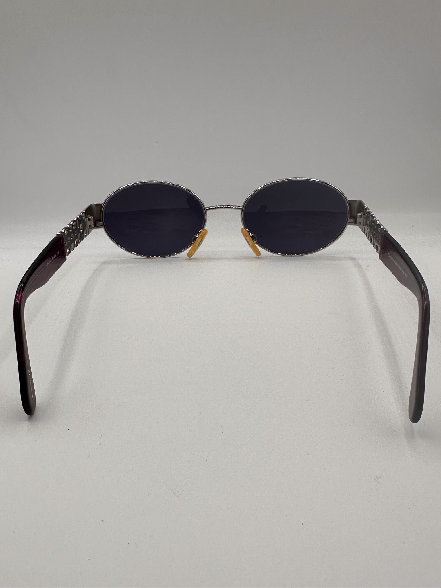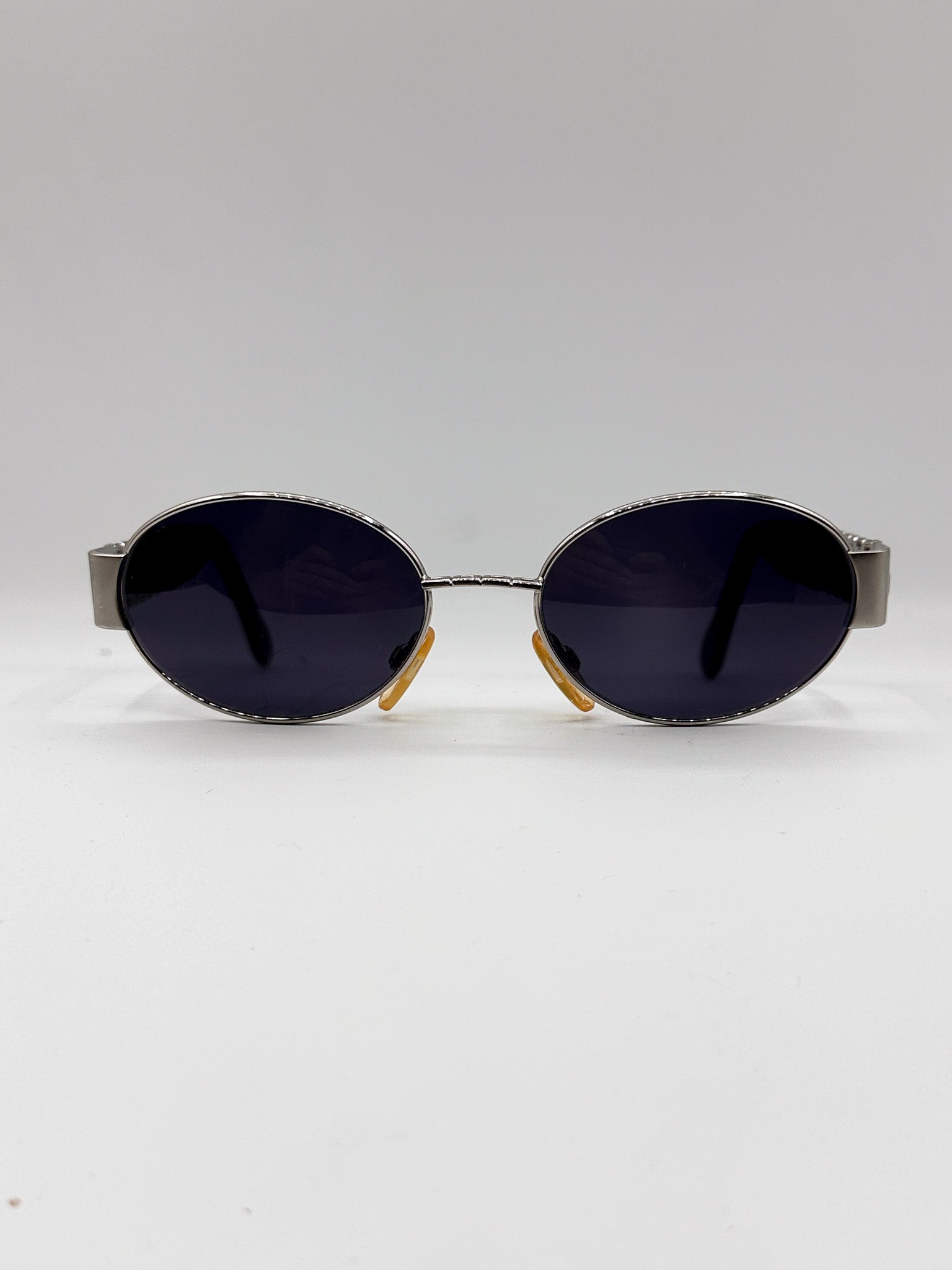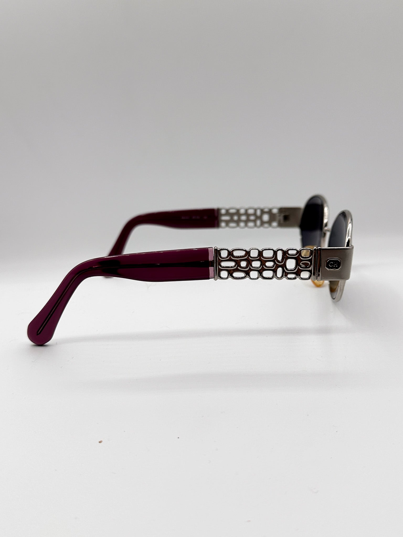 Introducing a masterpiece for your eyes - the round black sunglasses with silver square artistic design at the ear hinges, created by renowned designer Carolina Herrera. Every detail of these sunglasses has been carefully conceived and crafted, elevating them to the level of wearable art. Made in Spain in the 1990s.