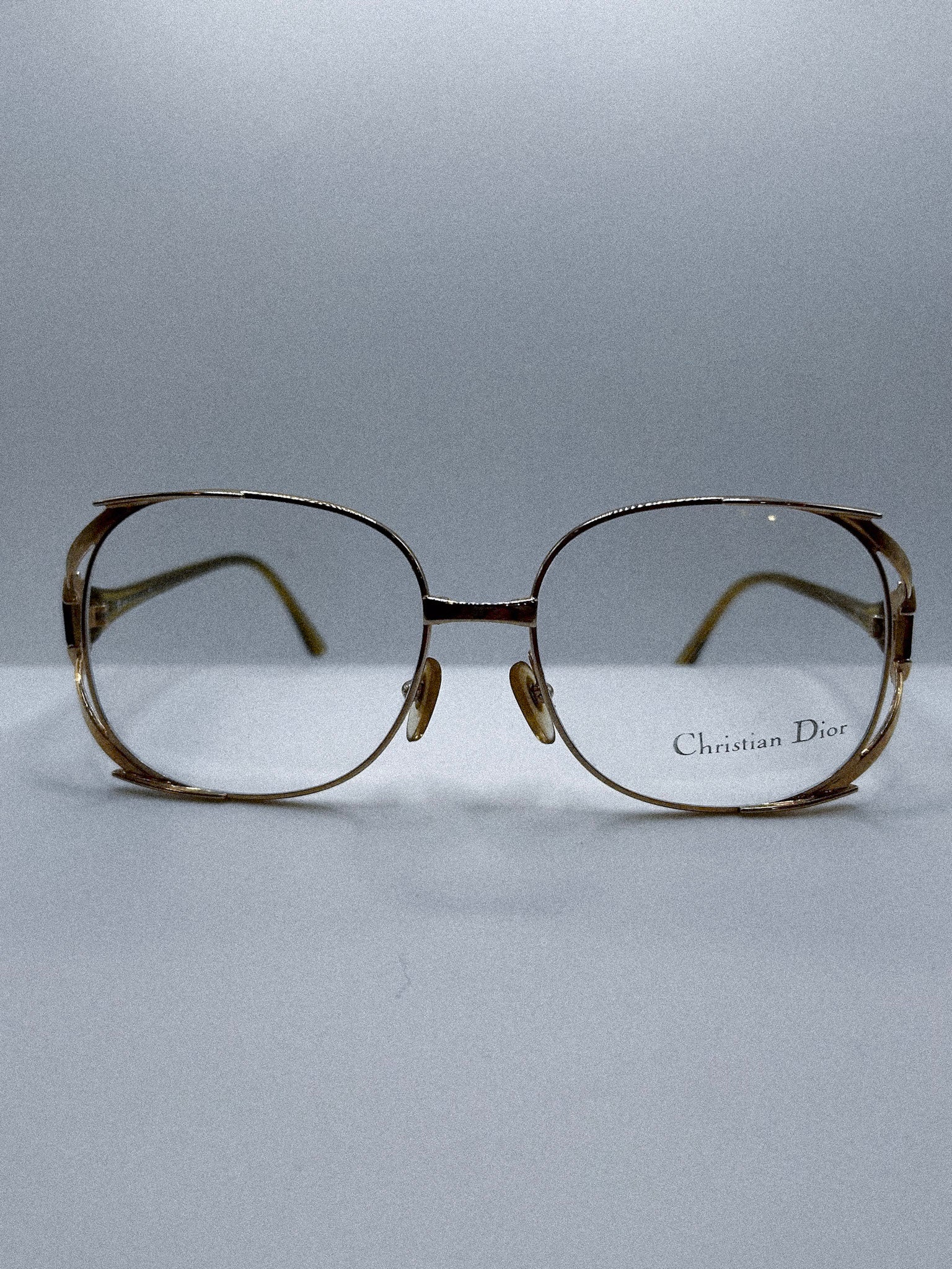 These Christian Dior 2713 frames embody the graceful precision of 1970s European couture eyewear. Their softly squared lenses sit within a thin gold structure that feels both delicate and intentional, with subtle sculpting along the rims that adds quiet depth. The silhouette is refined yet expressive, capturing the era's fascination with lightness and contour.