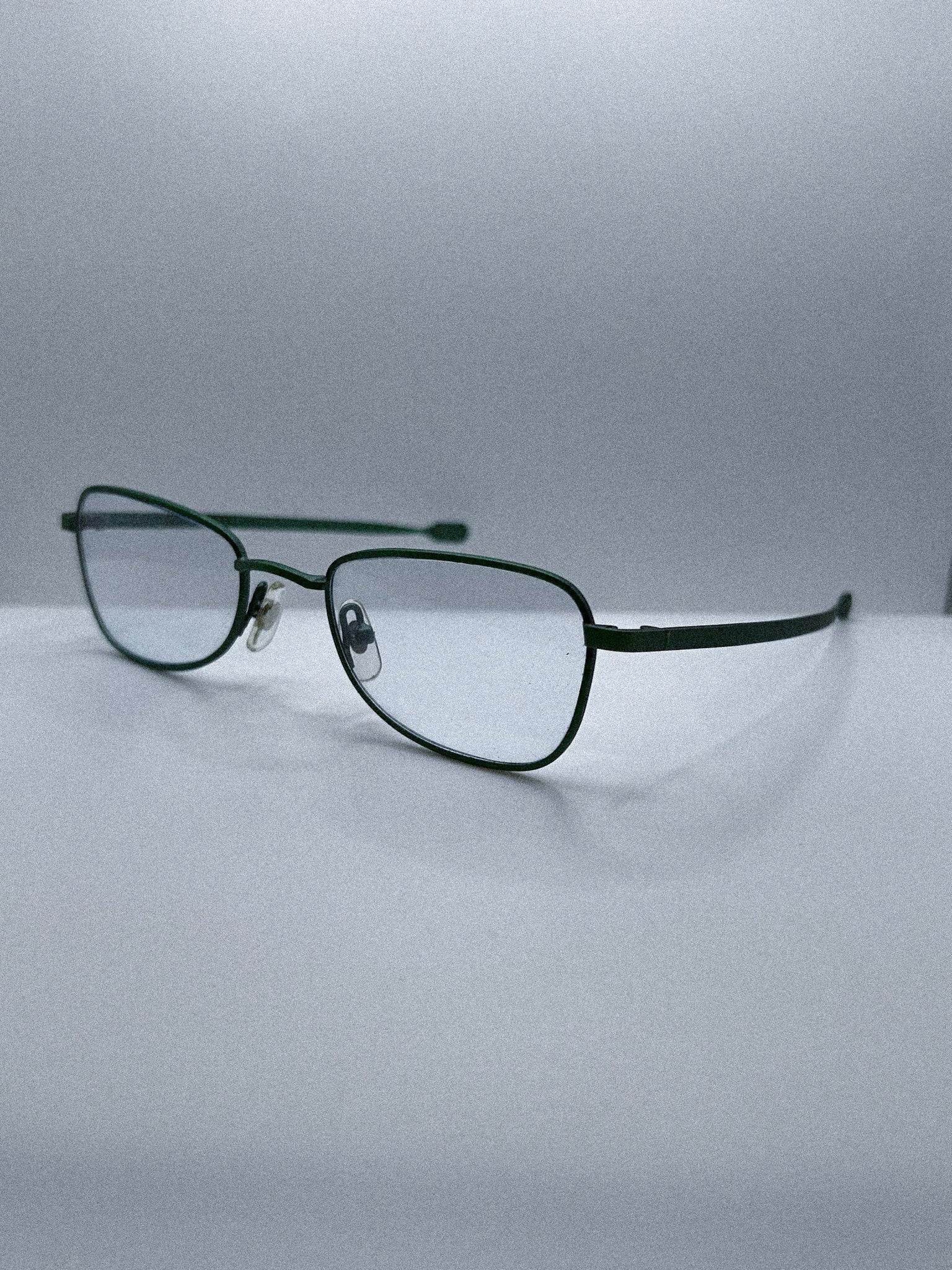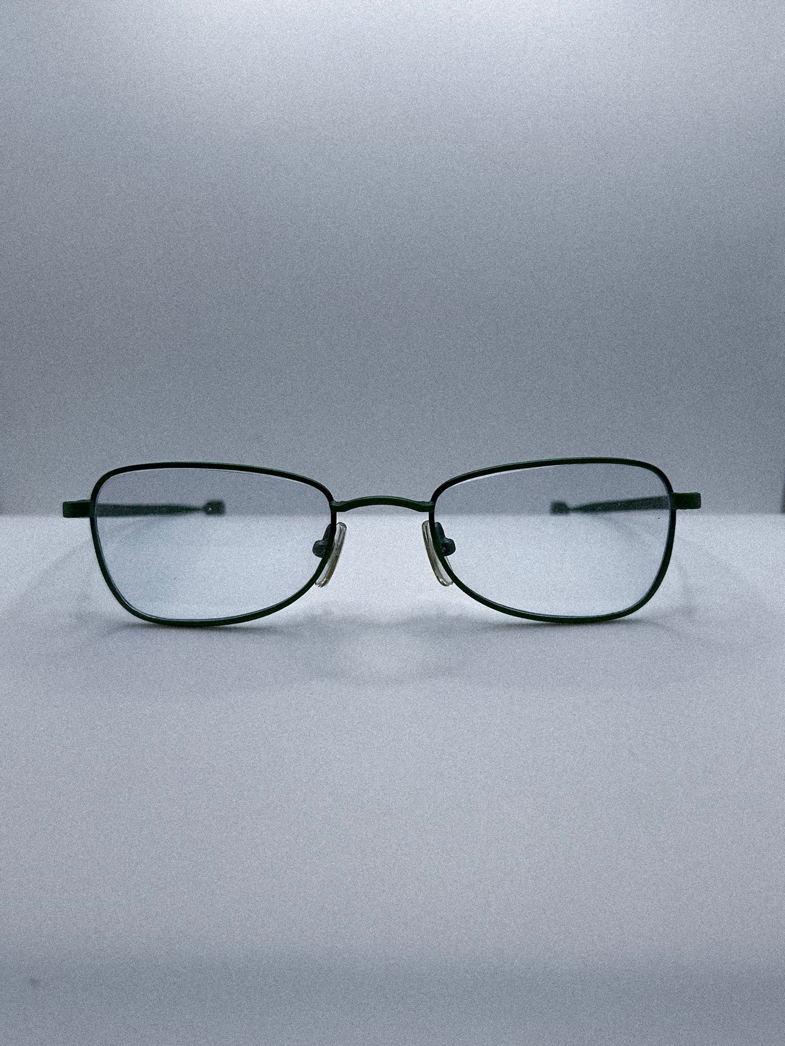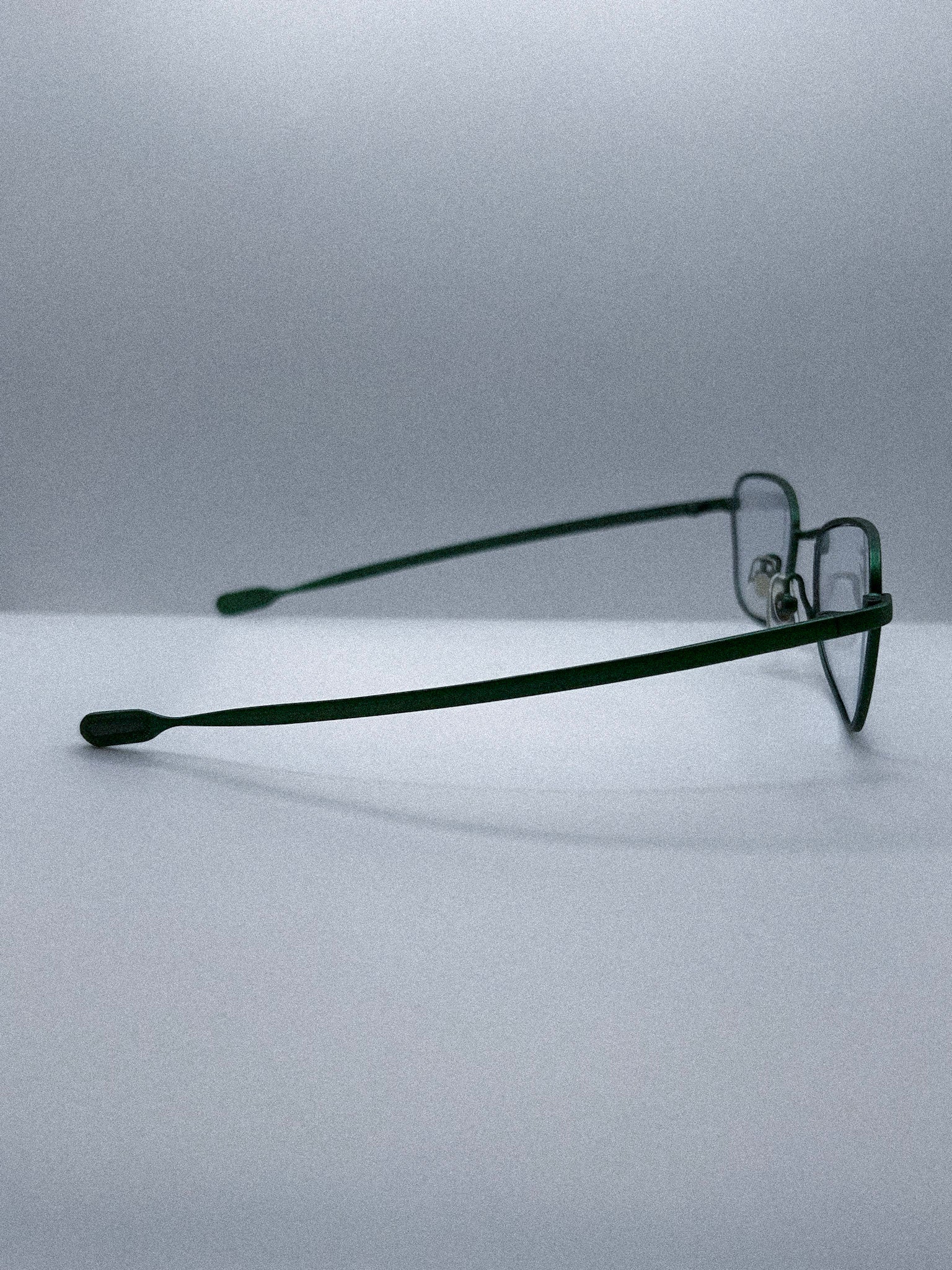 These 1990s green metal frames carry an understated clarity that feels both intellectual and quietly expressive. The soft rectangular shape is balanced by rounded edges, giving the silhouette a calm, measured presence. The matte green finish adds a subtle wash of color, offering personality without overwhelming the minimalist structure.