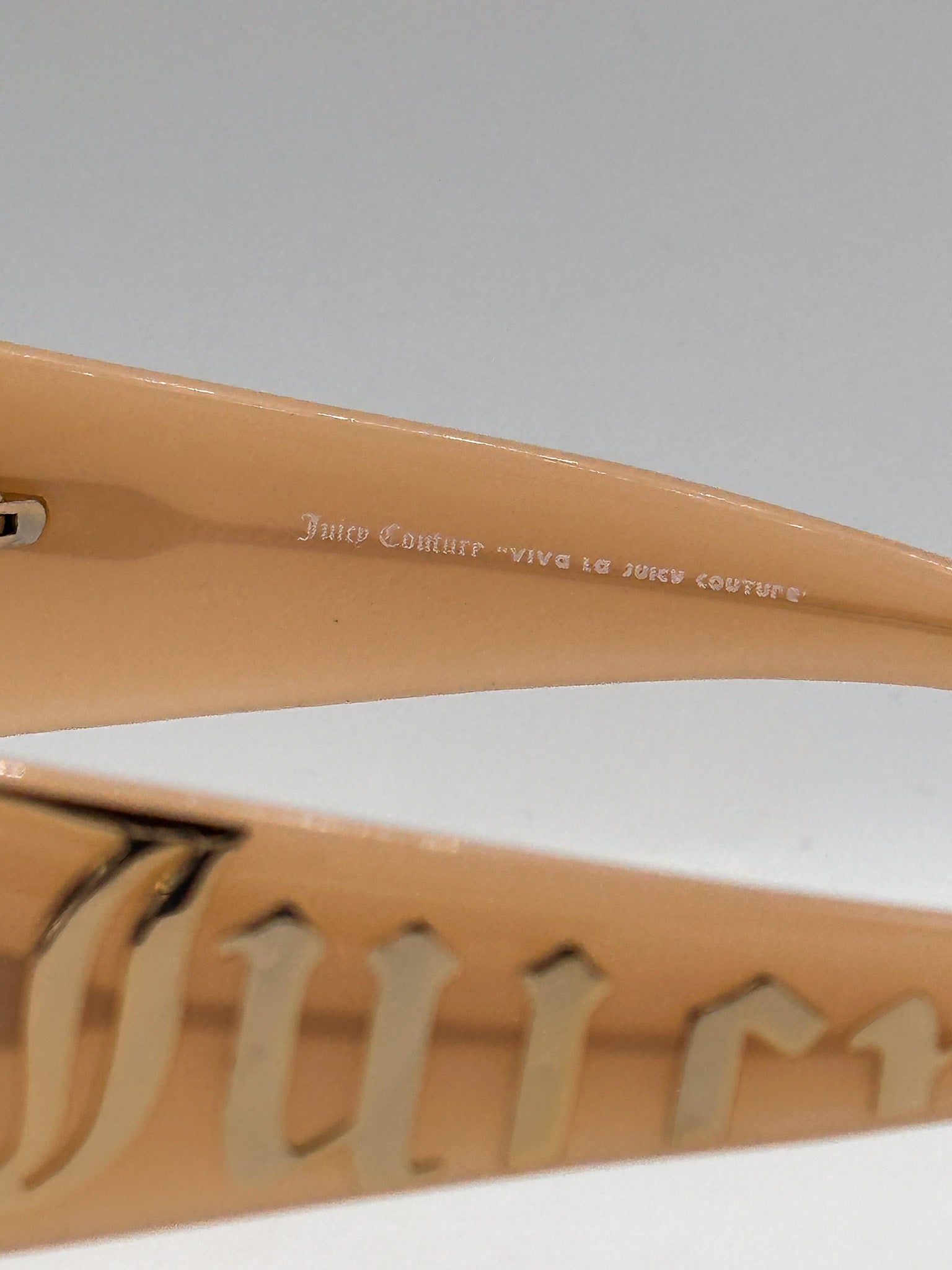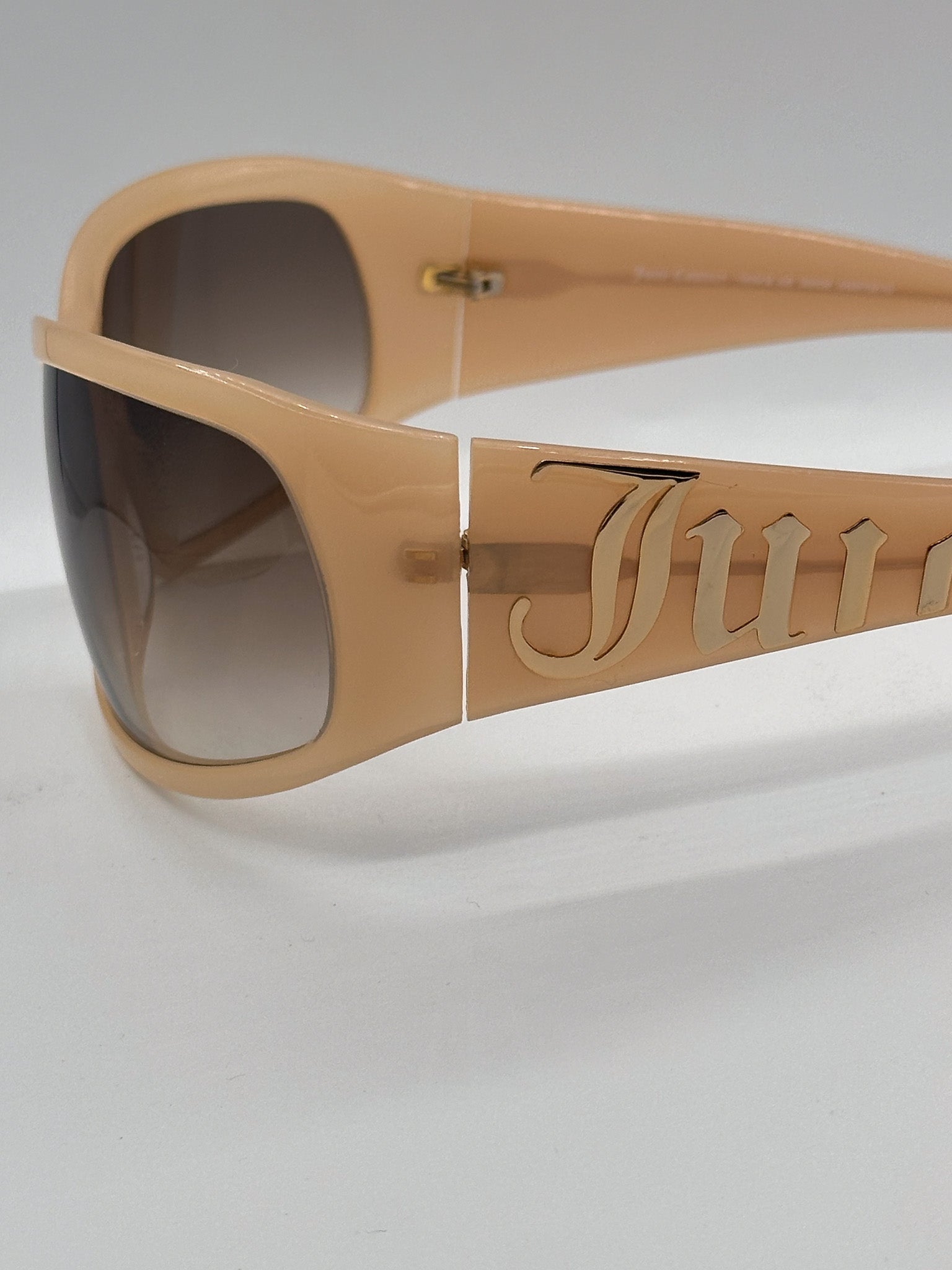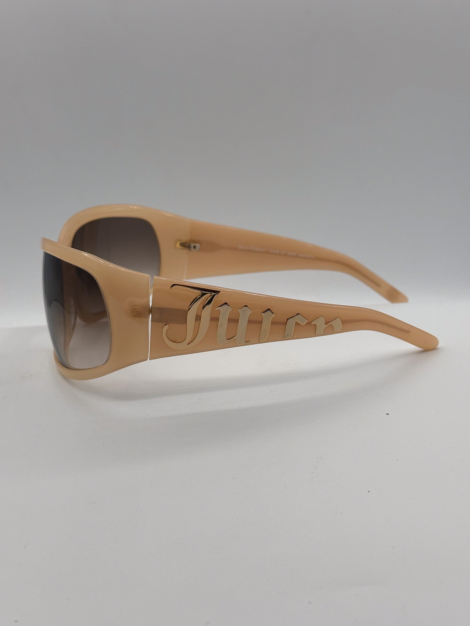 Wrap-around Juicy Couture beige frame with rounded full-face lenses. Acetate frame with polarized brown lenses. Made in Italy.
