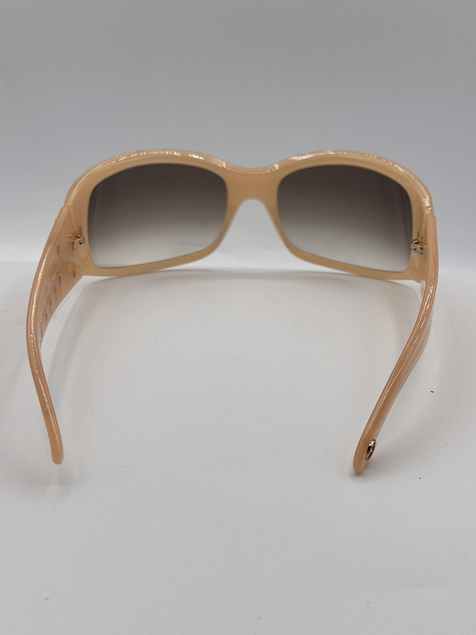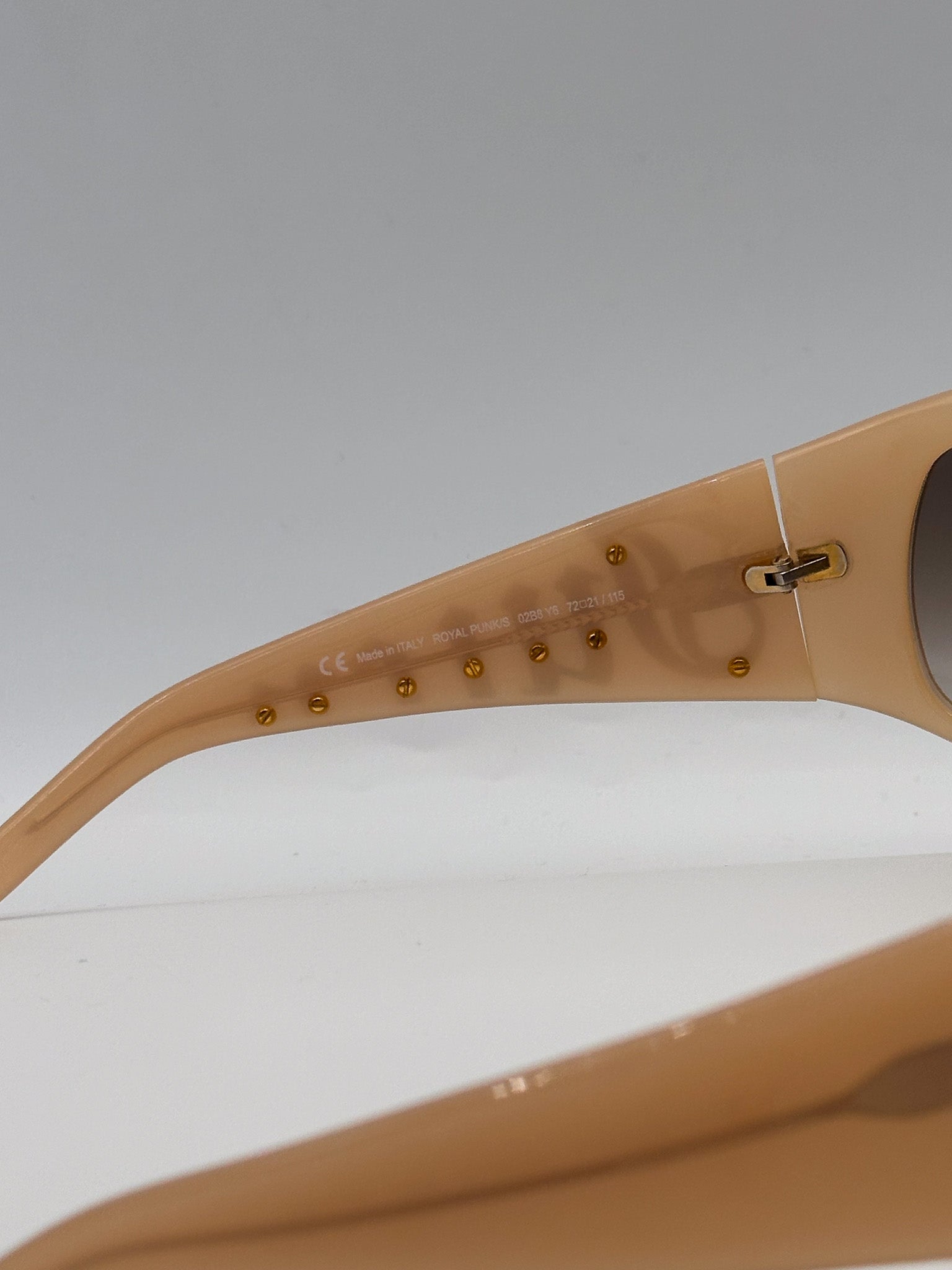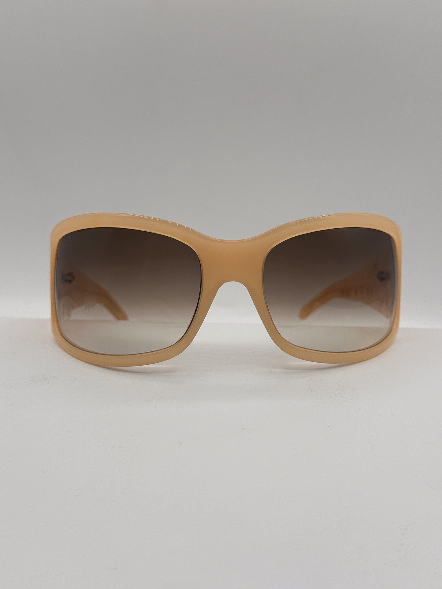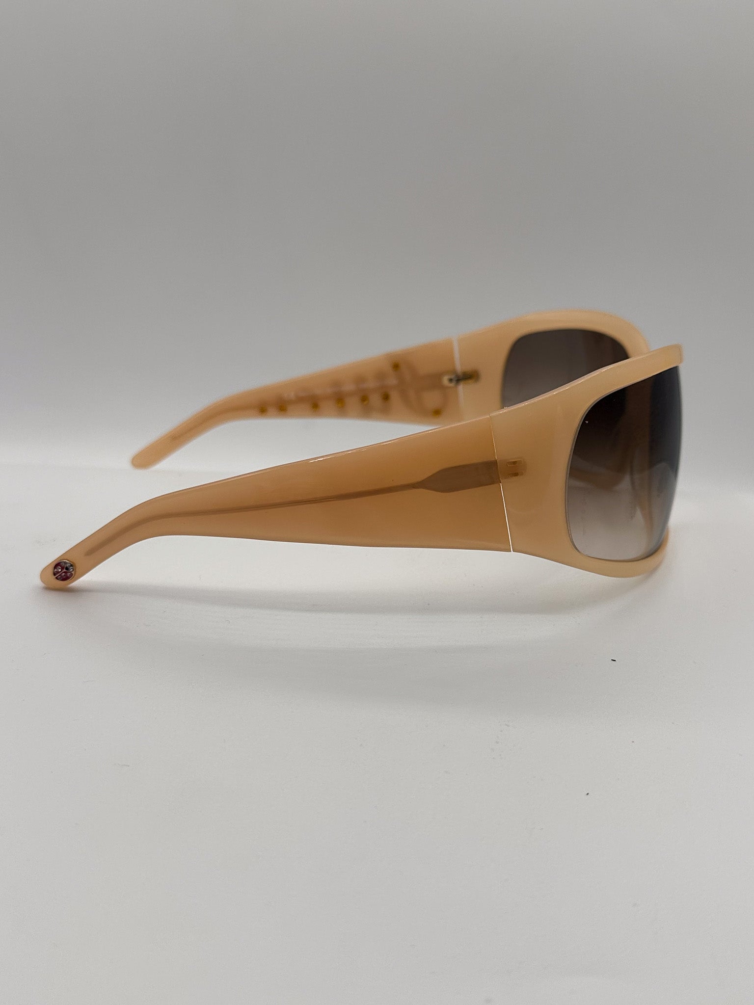 Wrap-around Juicy Couture beige frame with rounded full-face lenses. Acetate frame with polarized brown lenses. Made in Italy.