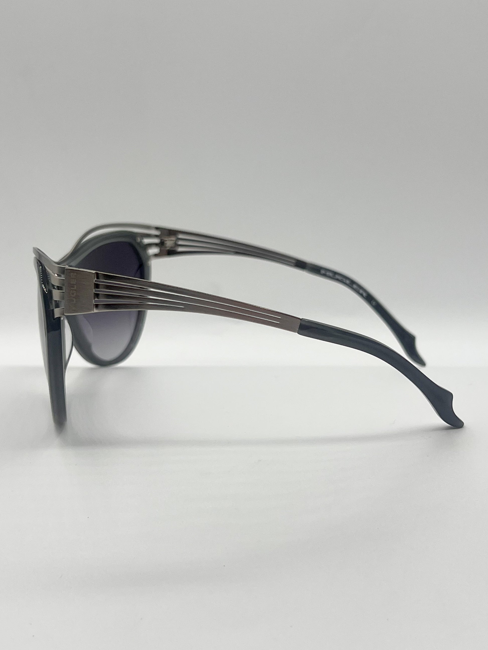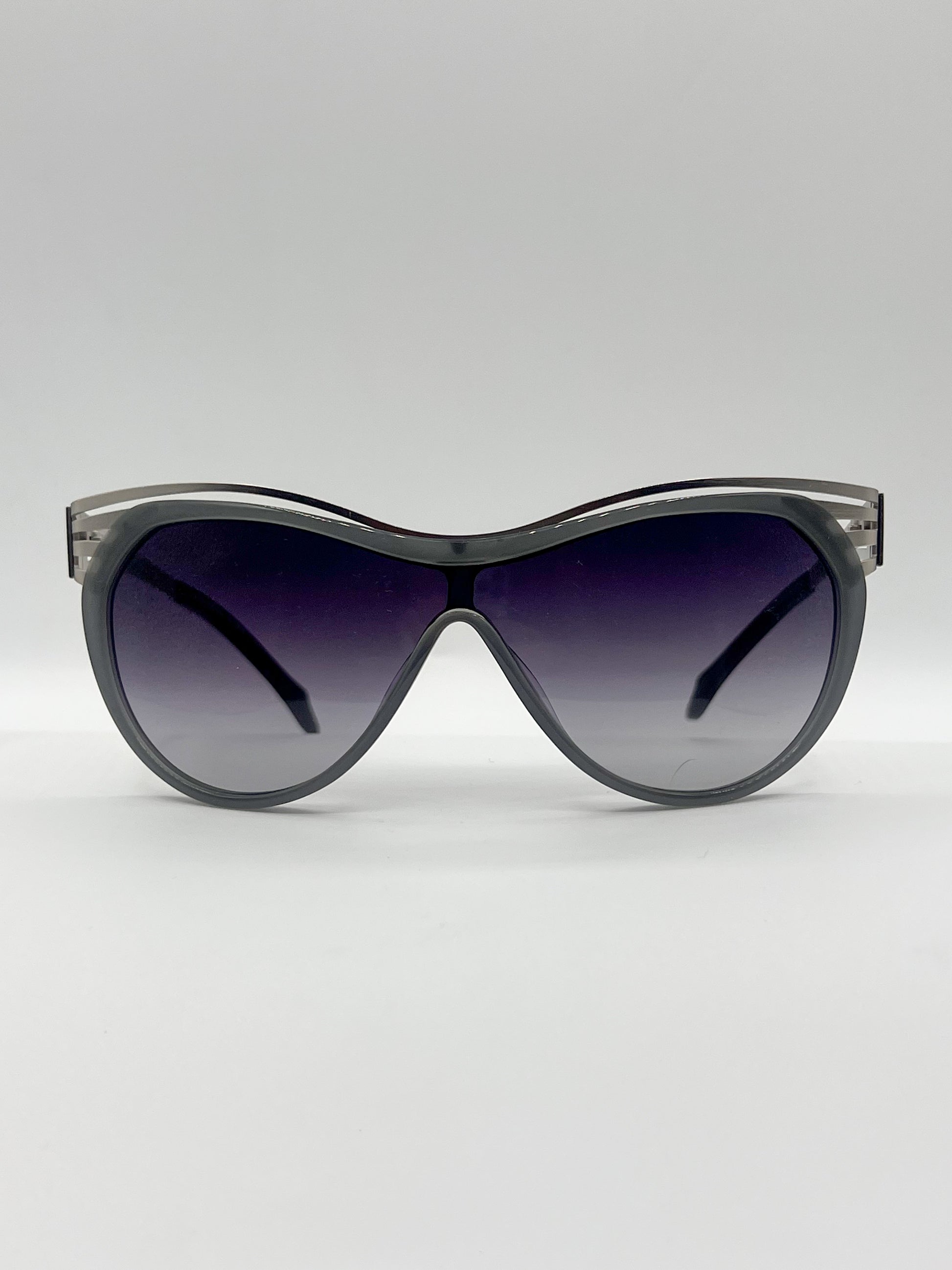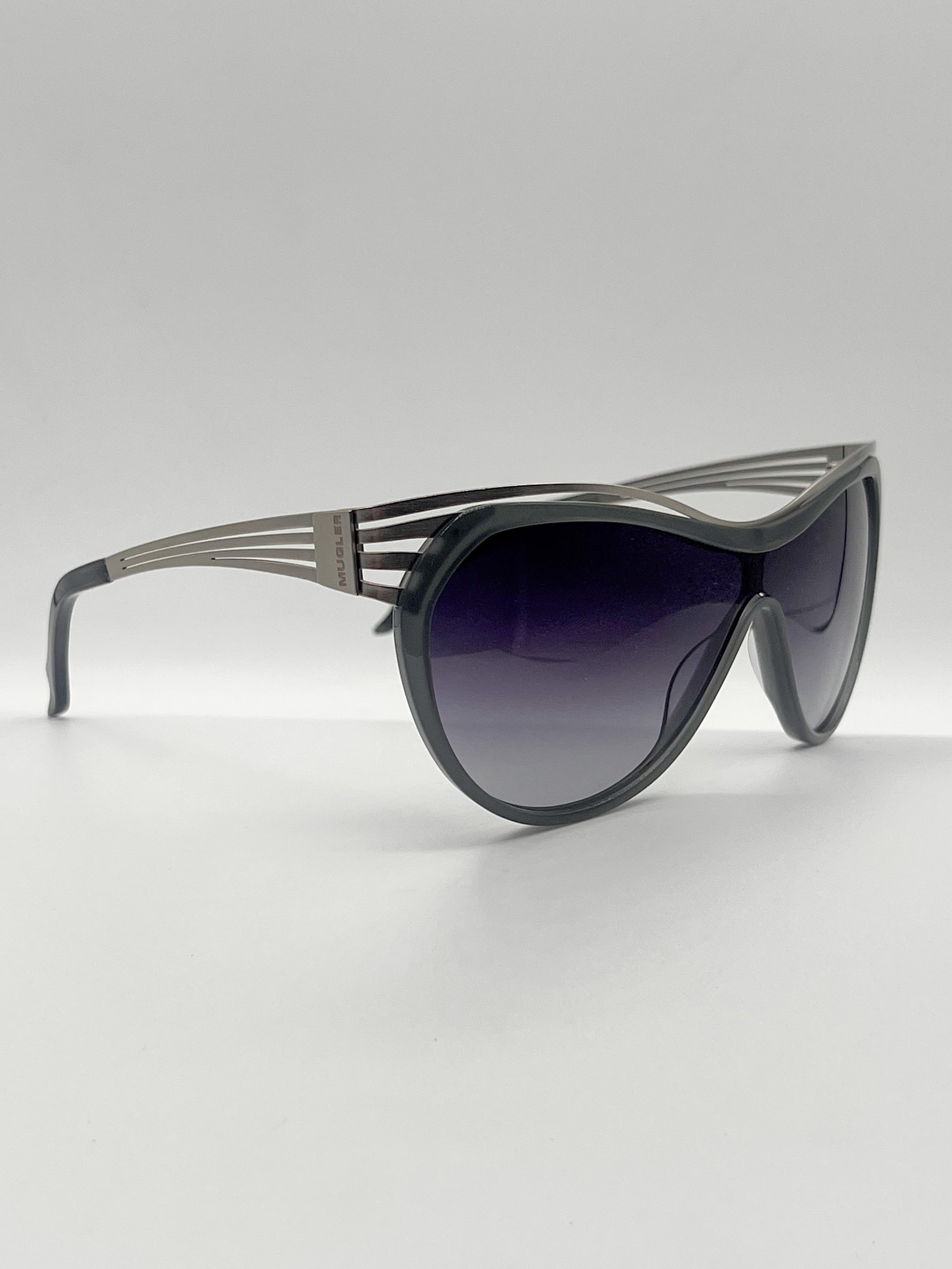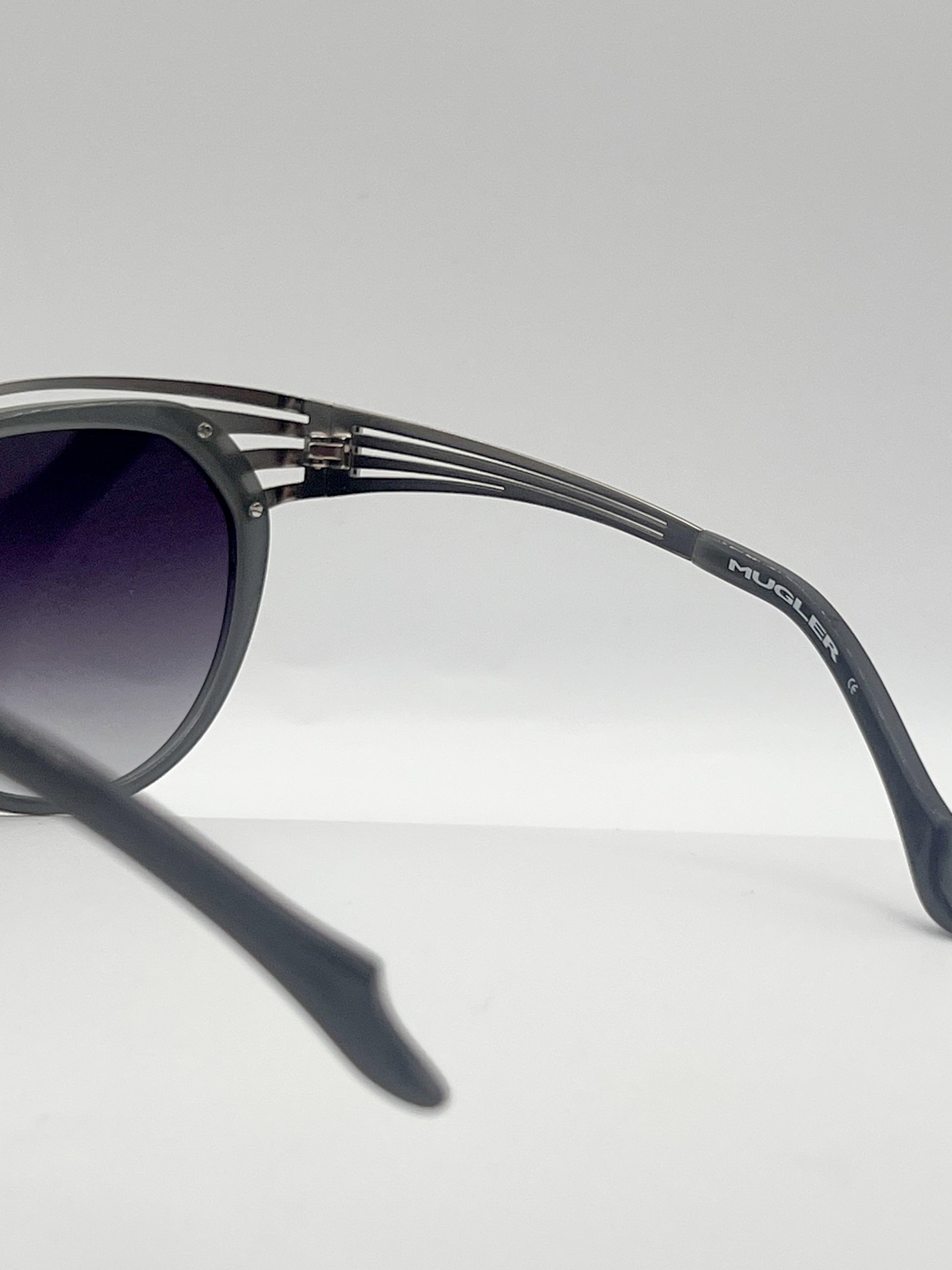 Early 2000s Mugler frames - a quite unique shape. Take a shield, add a cat eye, butterfly and then give it a true Mugler twist with metal-stacked ear pieces. Polarized lenses. Made in France.