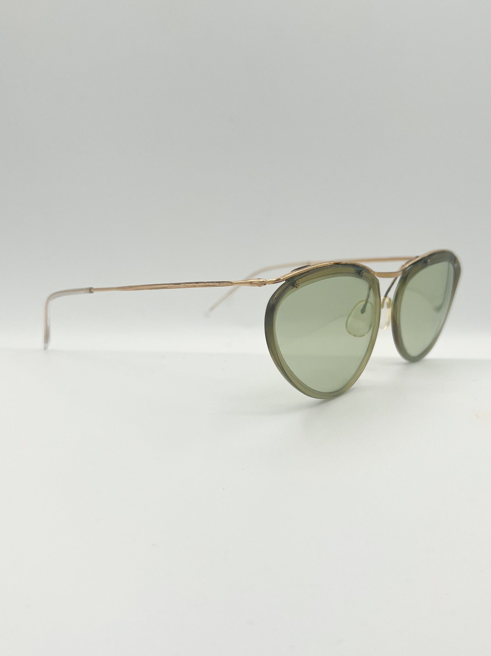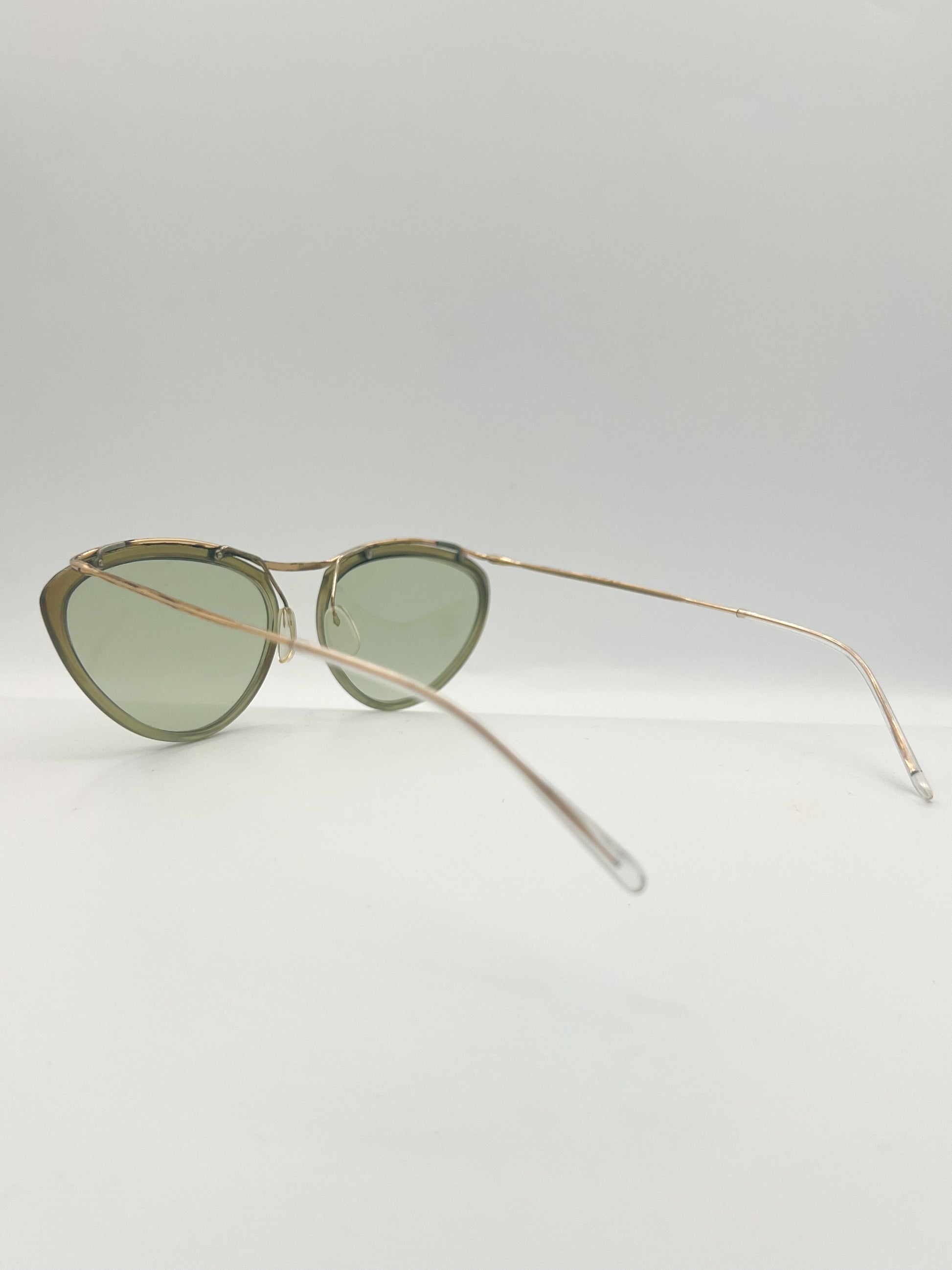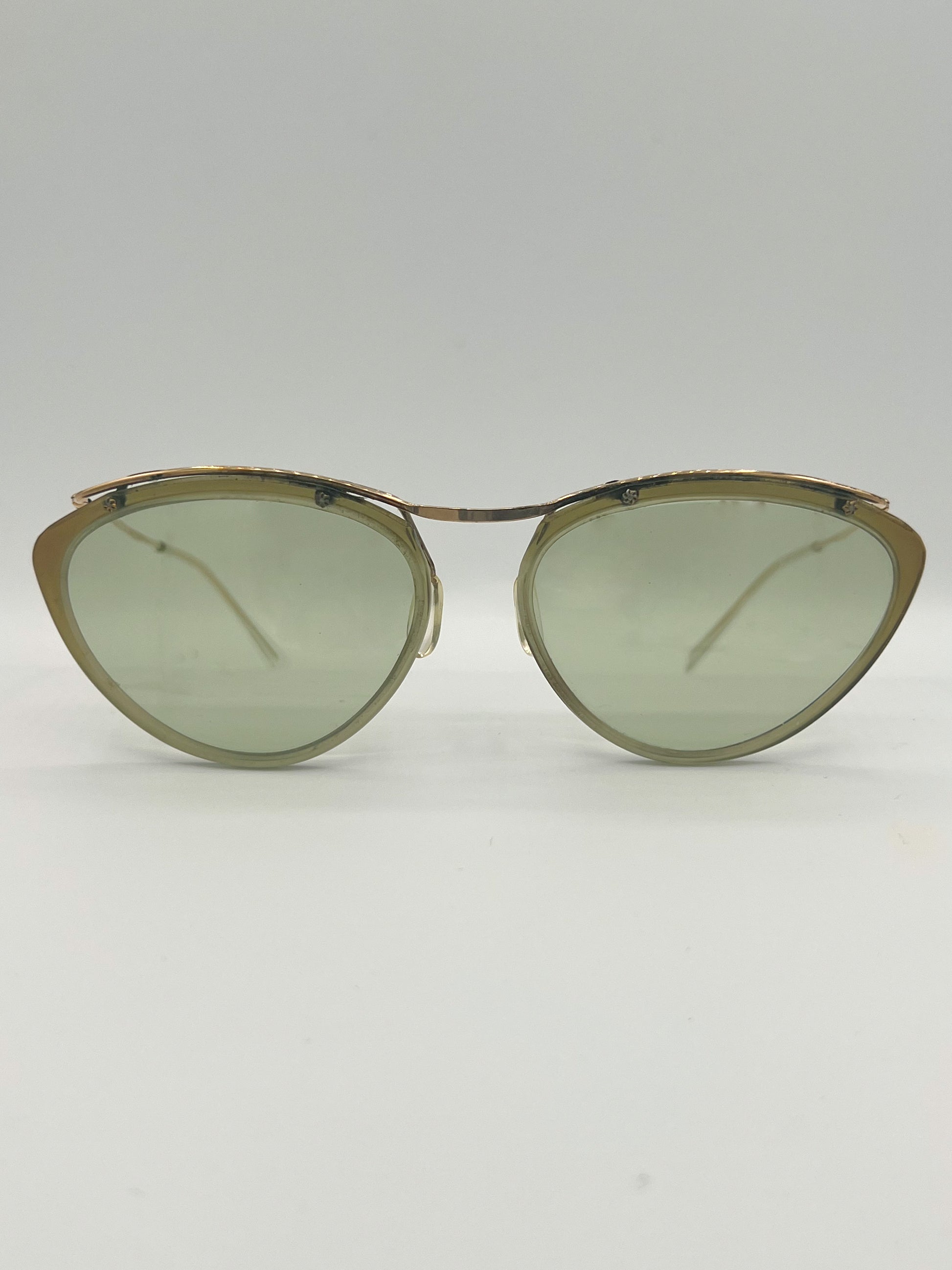 14kt gold plated wire frame with light green geometric lenses. Made in France. Original glass lenses, 70 years old. Slight signs of wear on frame, overall good condition.