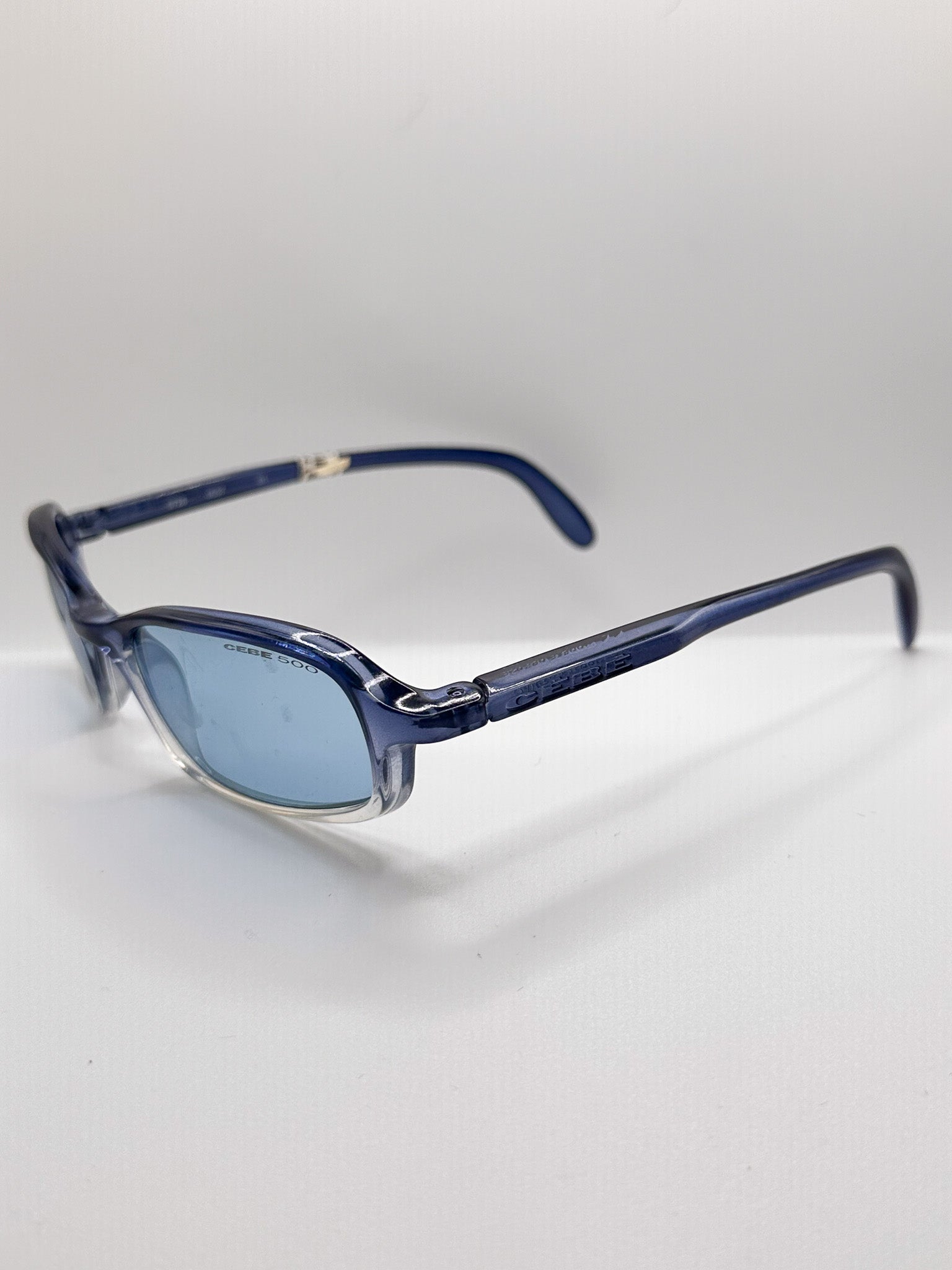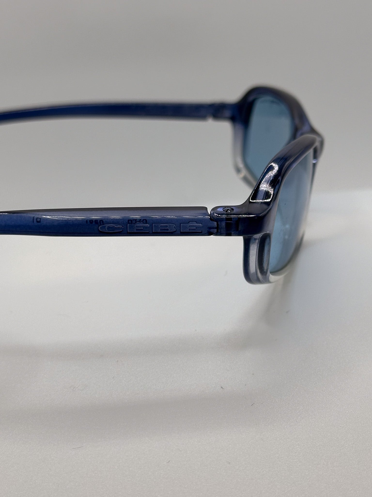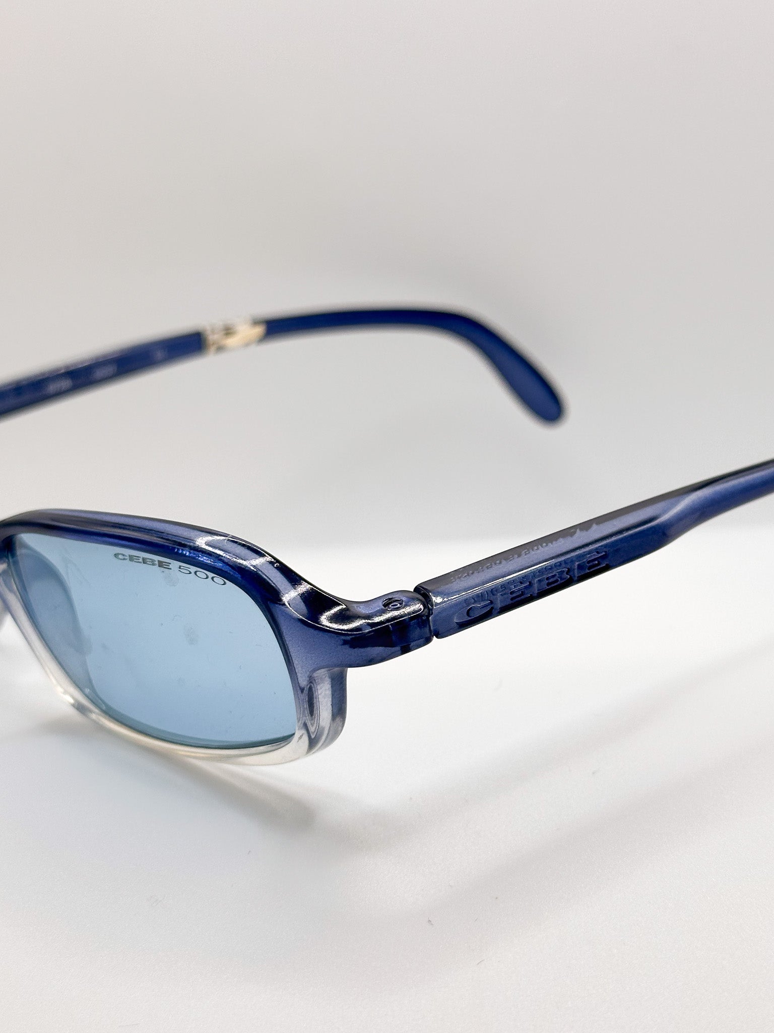 Cebe rectangle sunglasses with a blue/clear gradient frame and blue lenses. Made in France.