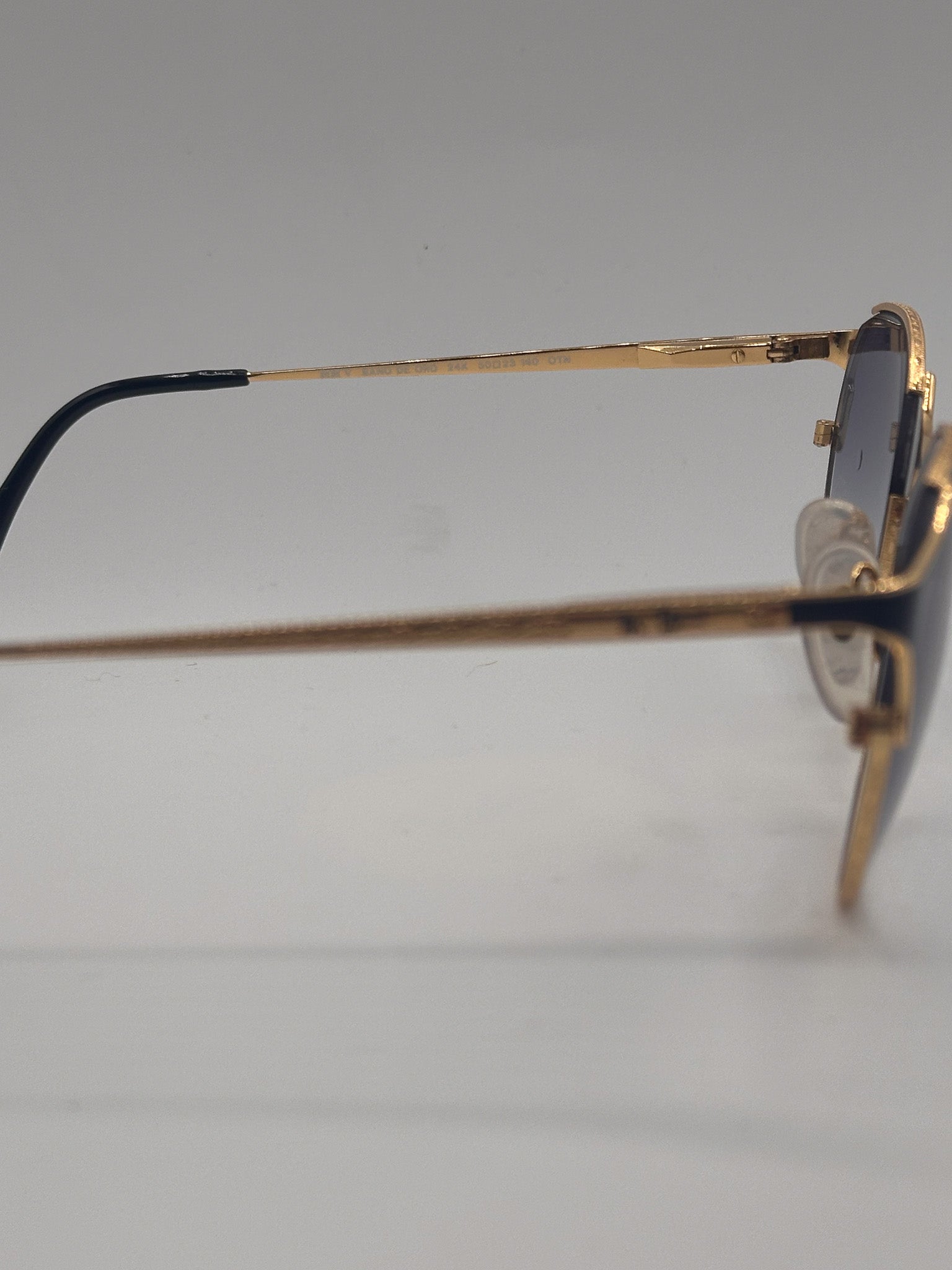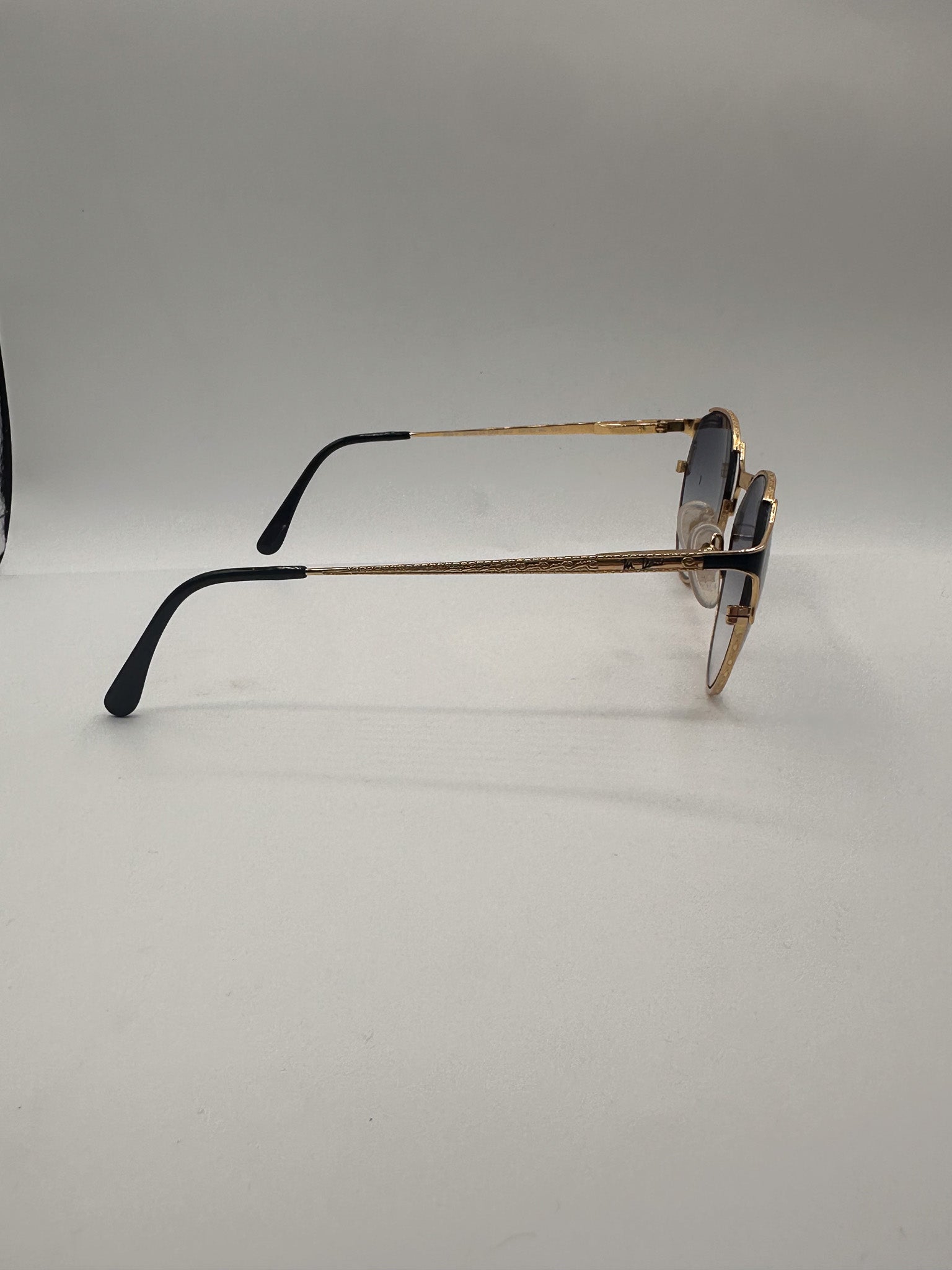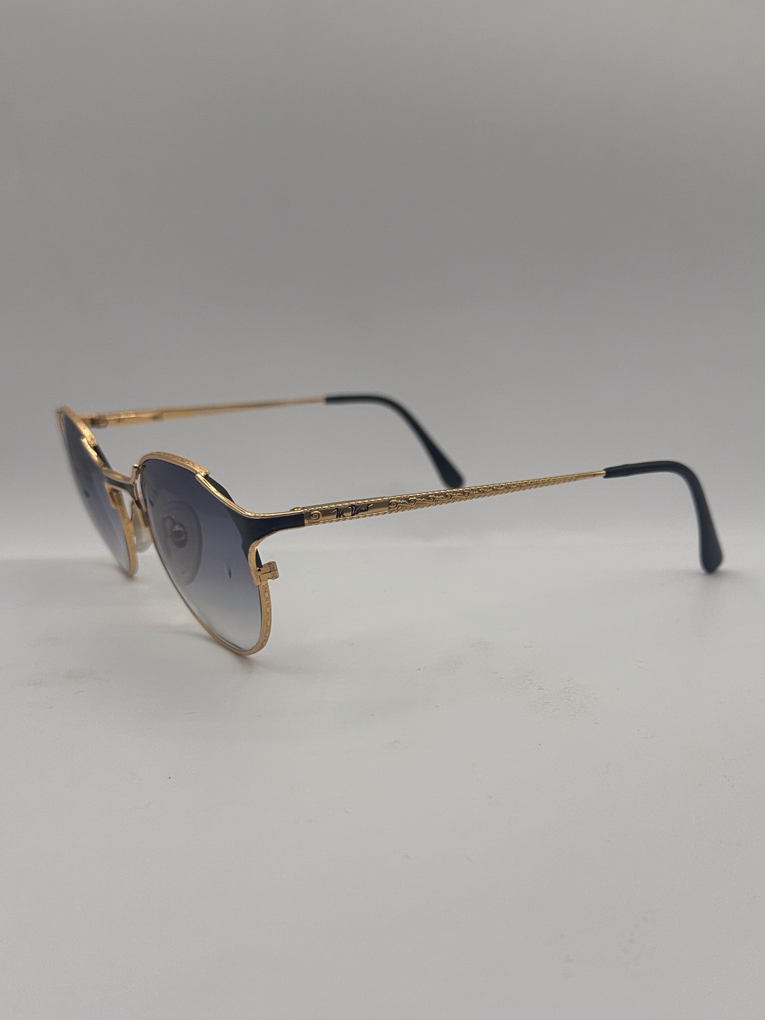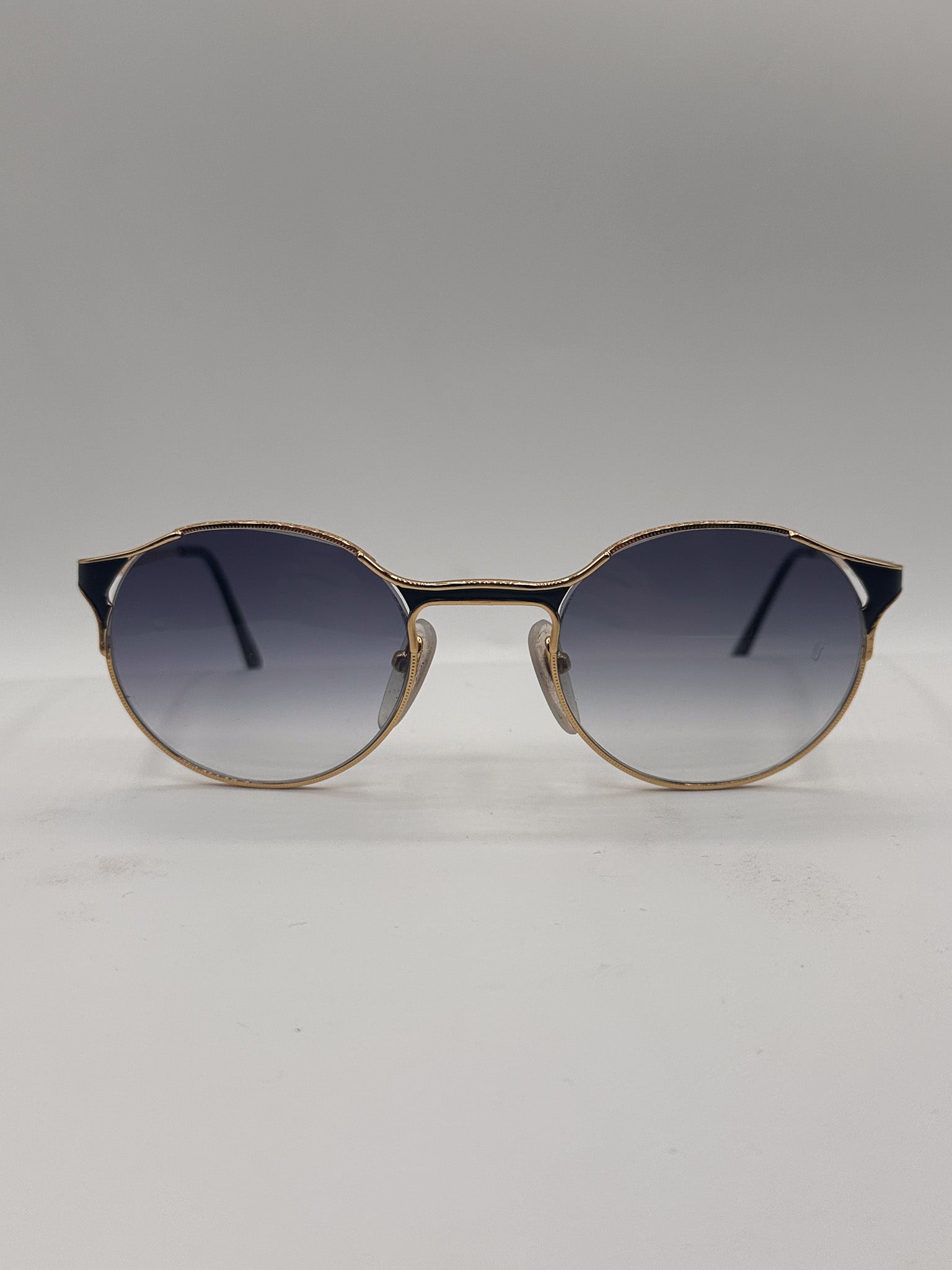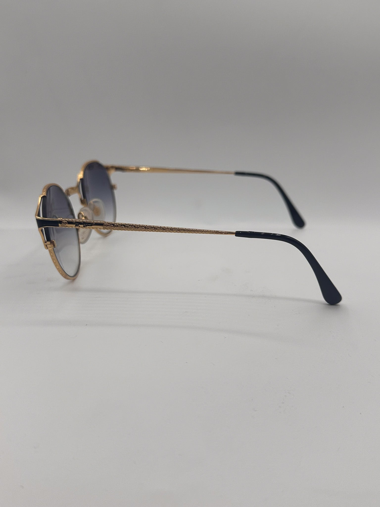 Lightweight gold/black round frame with pronounced corners. Black gradient lenses on a gold round titanium frame. Made in Japan in the 1990s.