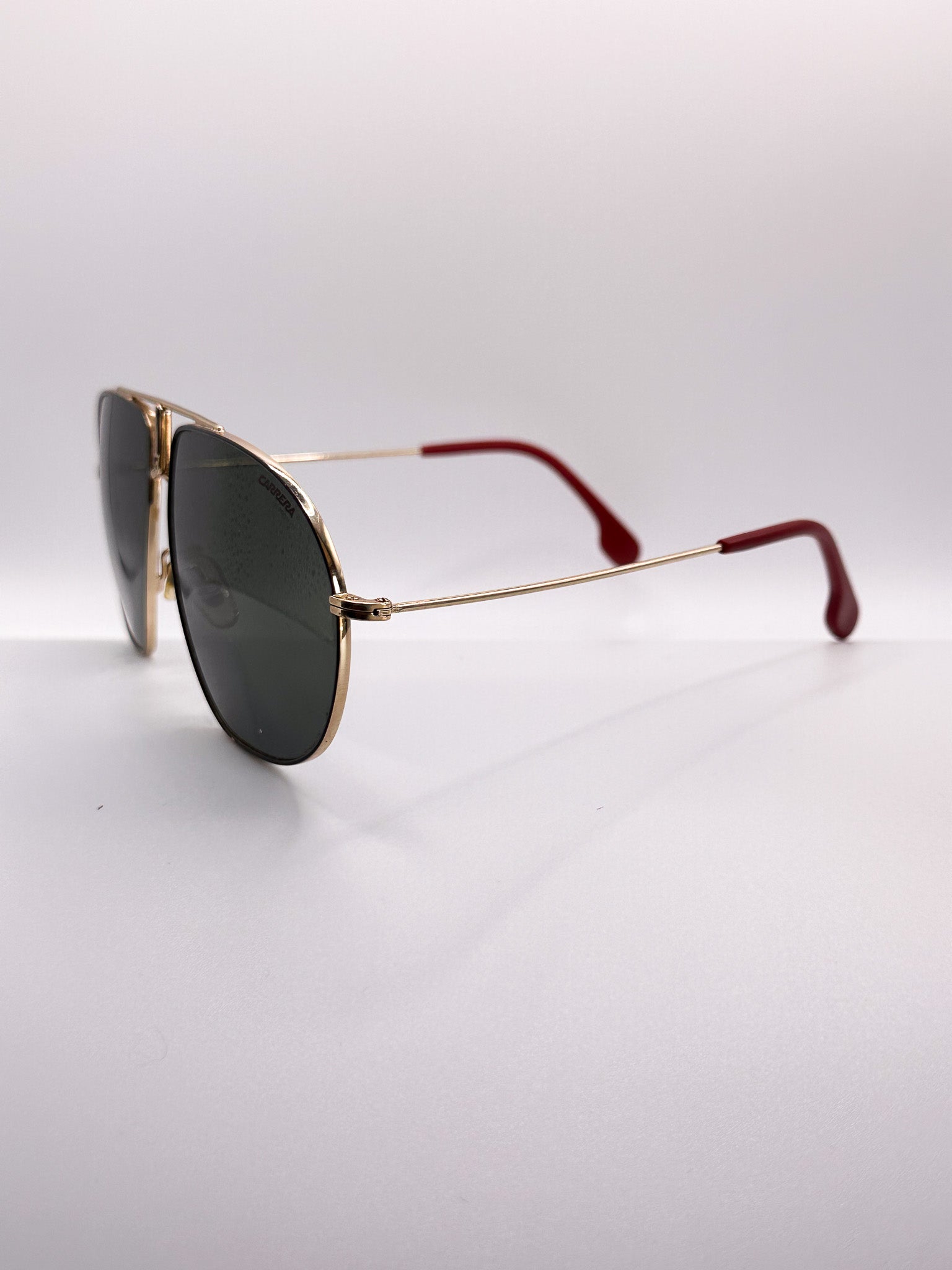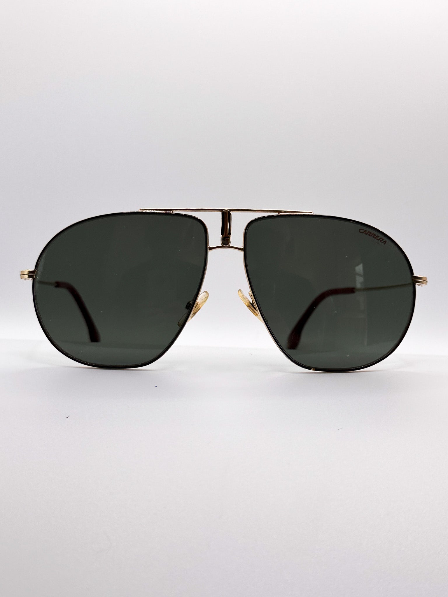 Unique shape on aviators - large lenses with deep V above nose. 1980s Carrera, made in Italy & Sourced in Barcelona. "C" details in nose piece and ear hinge.. Polarized lenses.