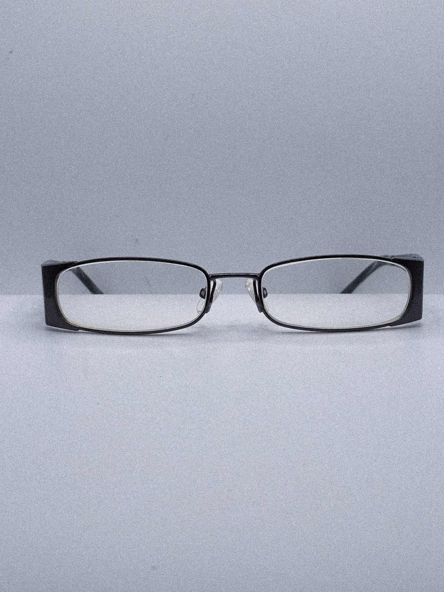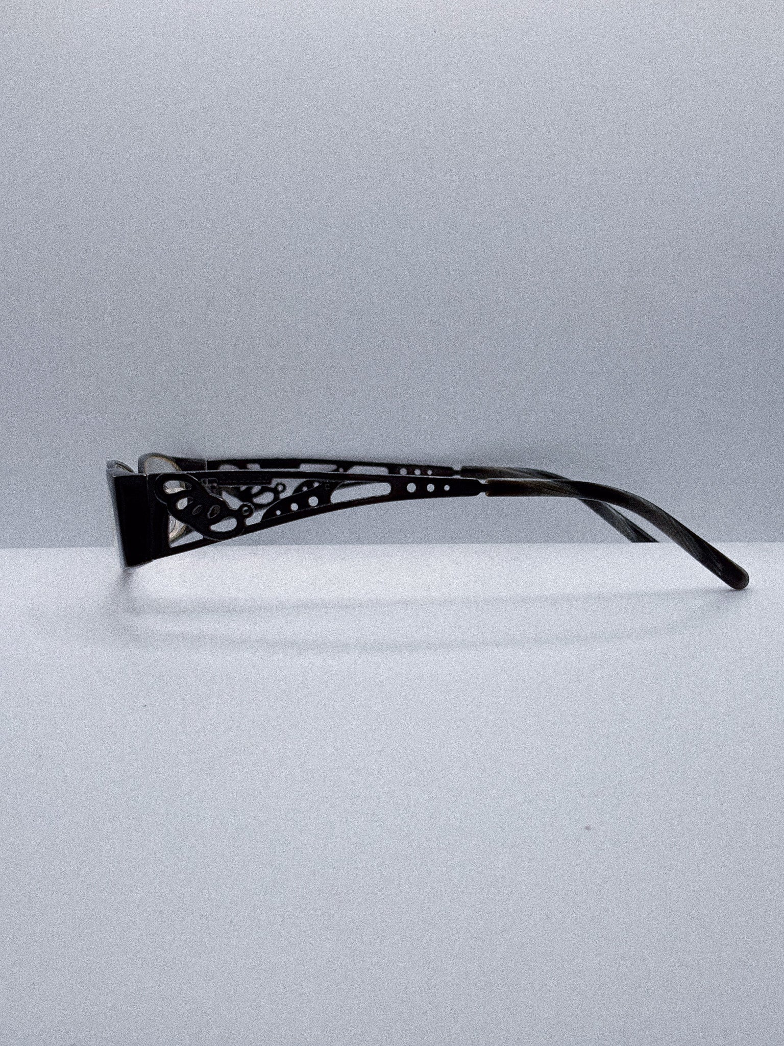 These 1990s Jean Paul Gaultier eyeglasses reflect the designer’s industrial imagination and daring architectural vision. The chrome rectangular frame carries a sleek, mechanical precision, softened by the clarity of the lenses that reveal the artistry beneath the structure.