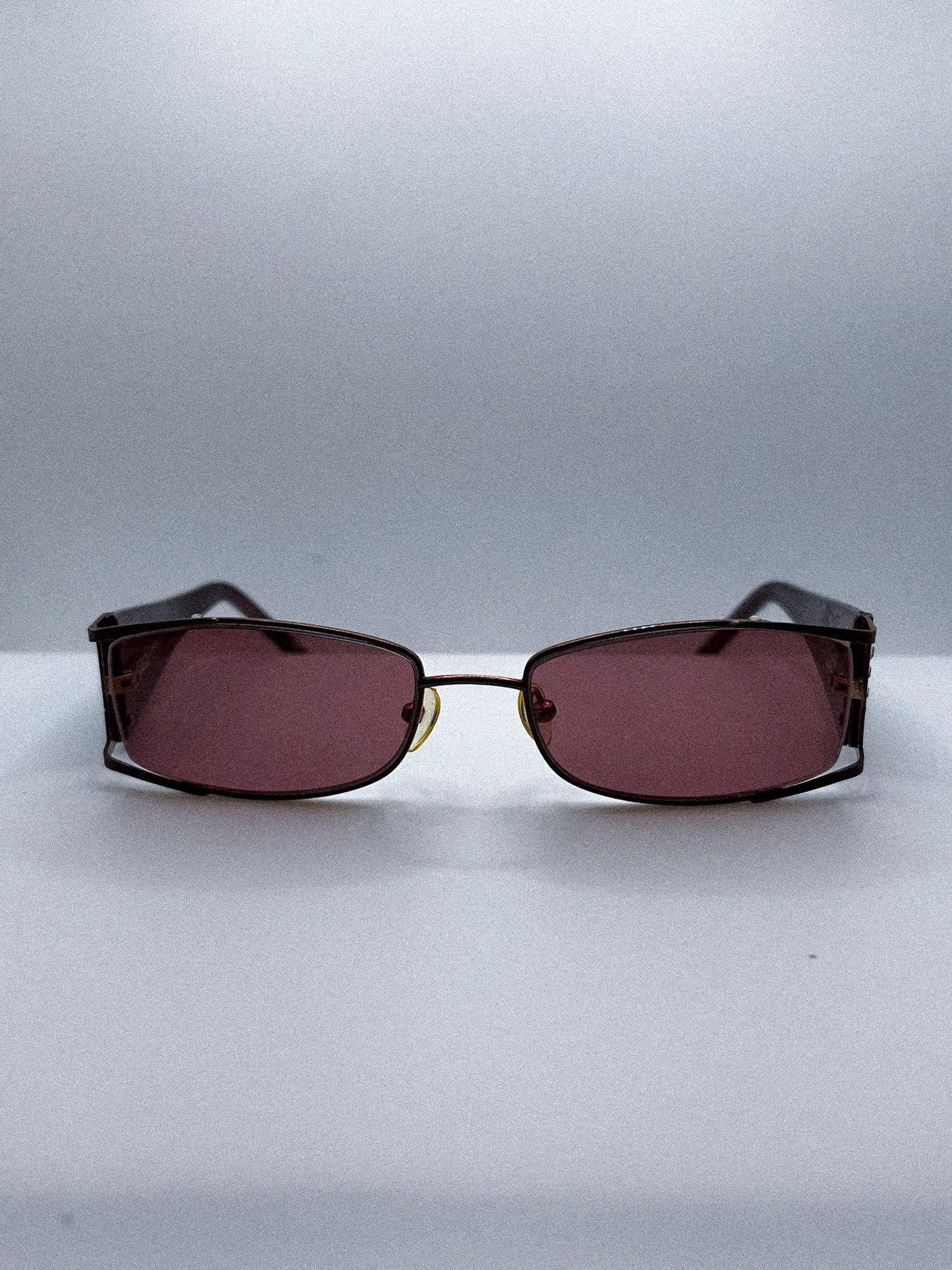 These 1990s Bellagio sunglasses channel the sleek futurism that defined Japanese eyewear of the era. The narrow rectangular lenses create a low profile, almost cinematic line across the face, while the deep brown tint adds warmth and subtle mystery.
