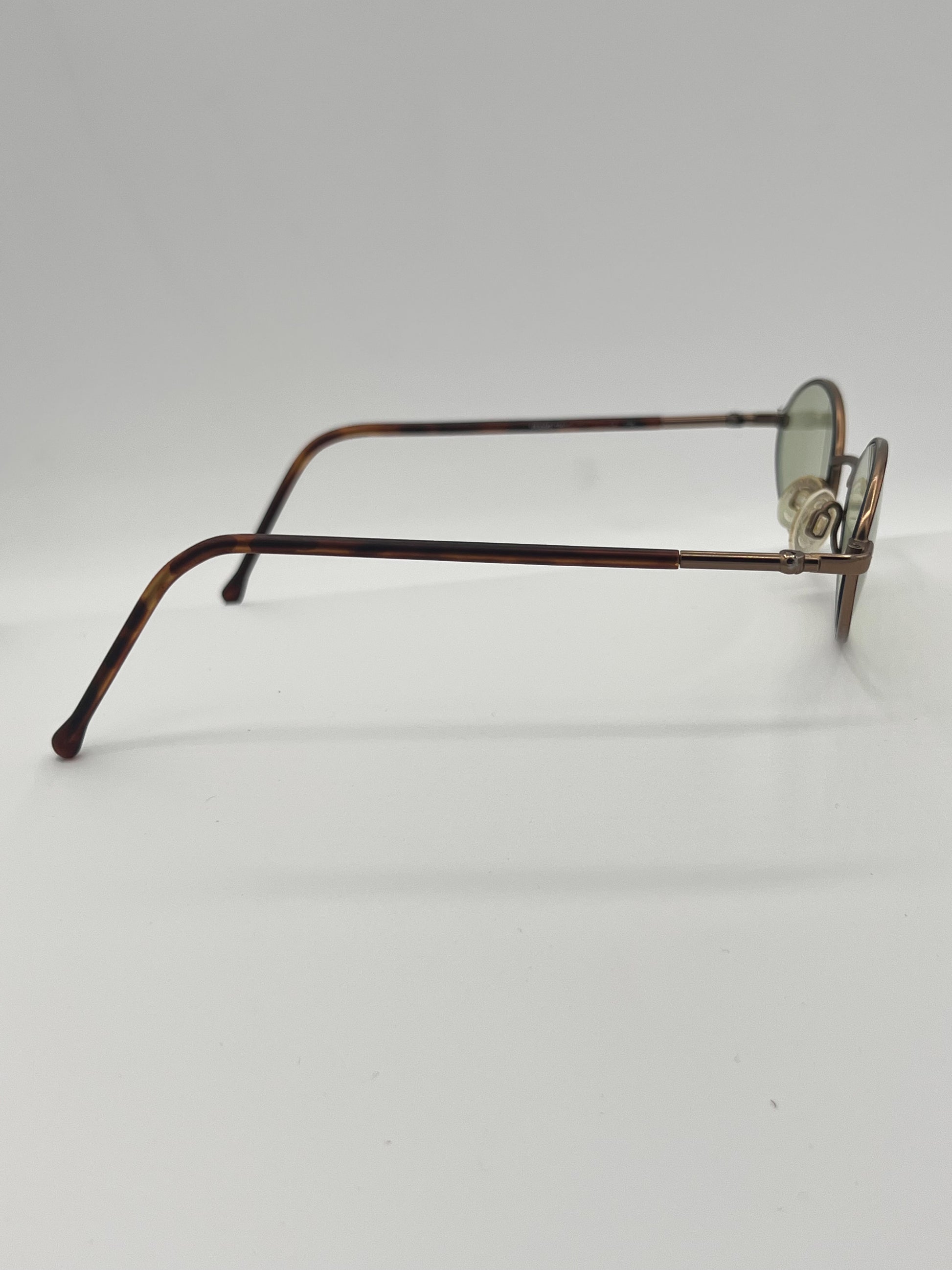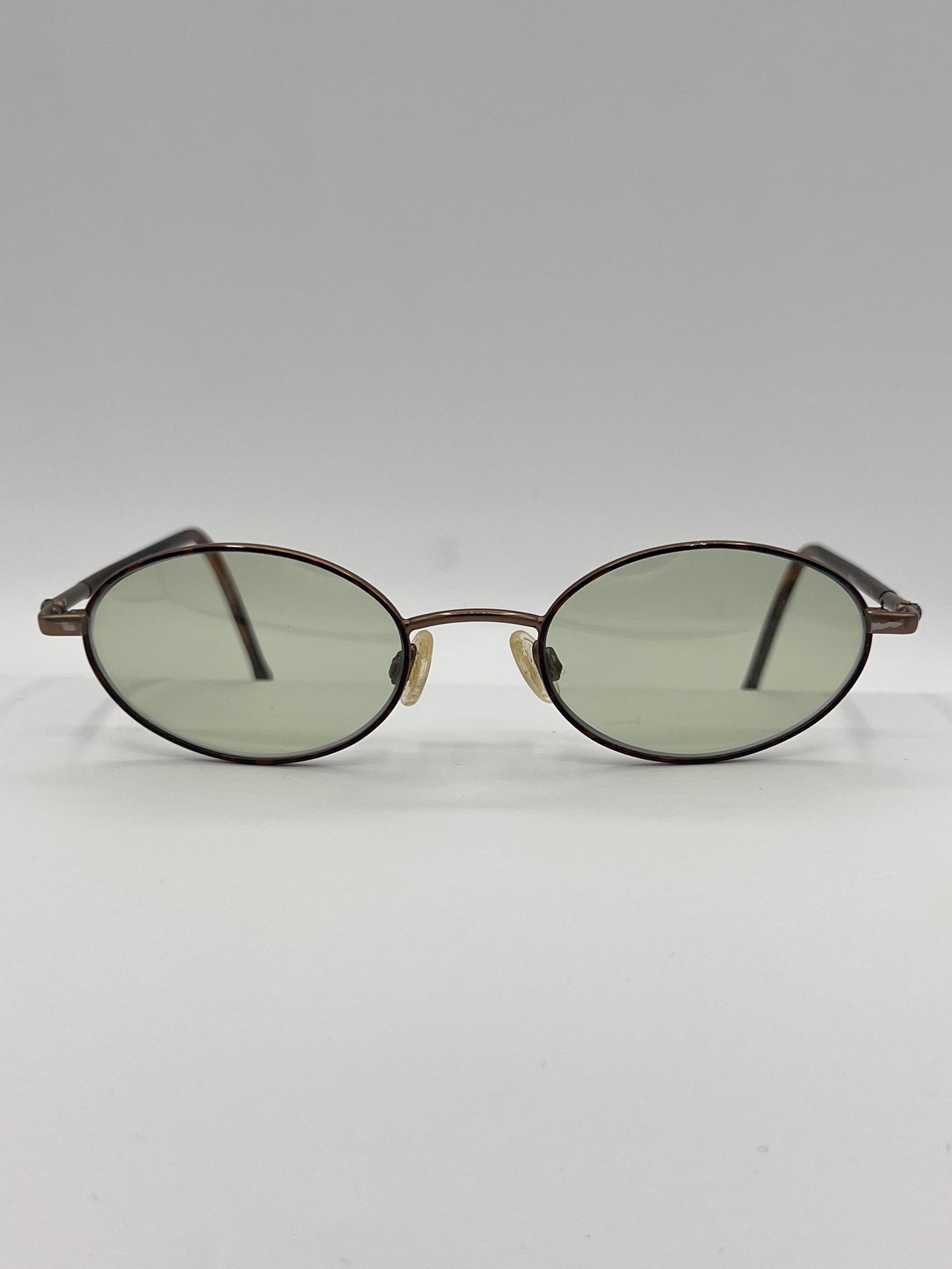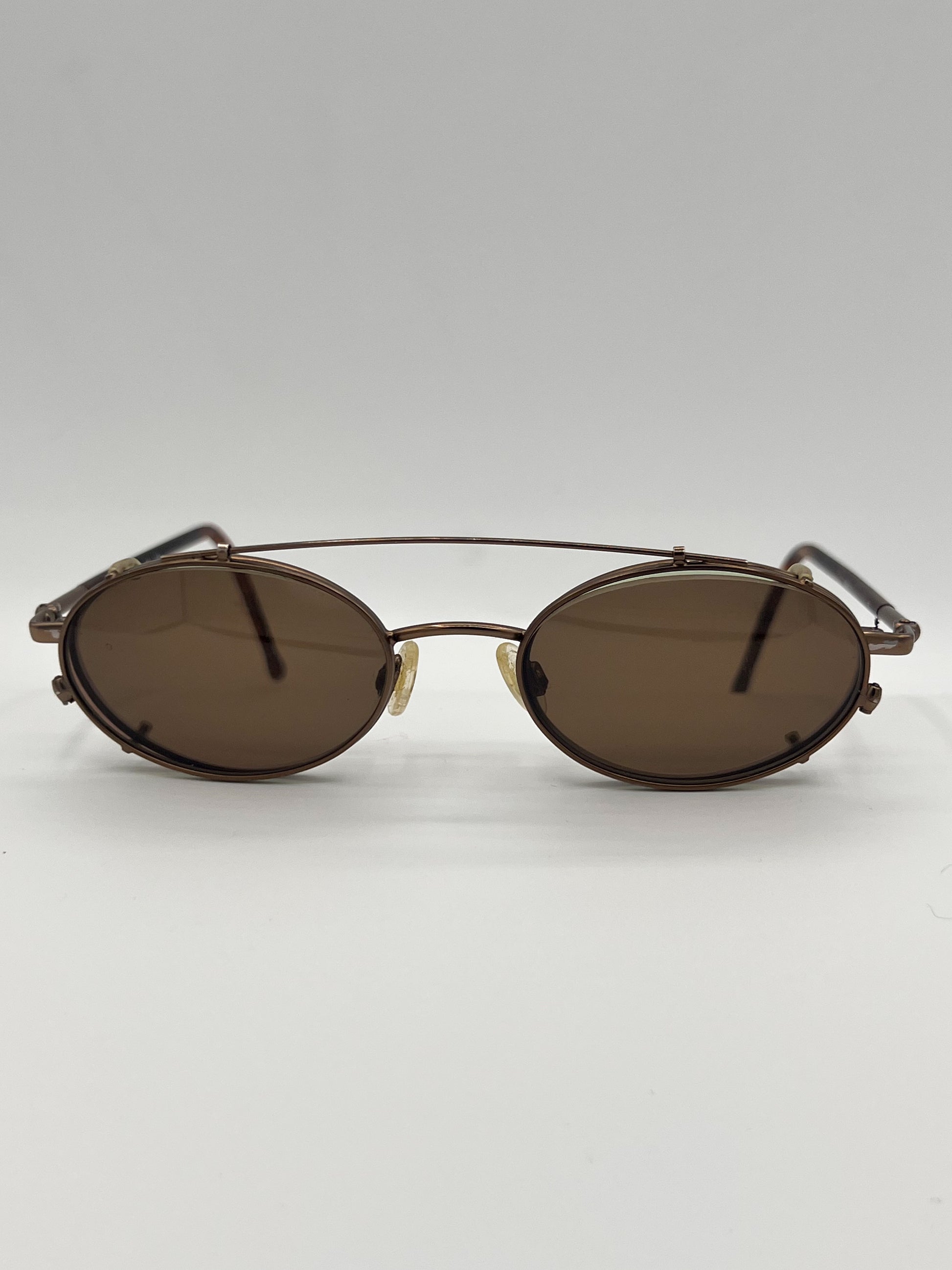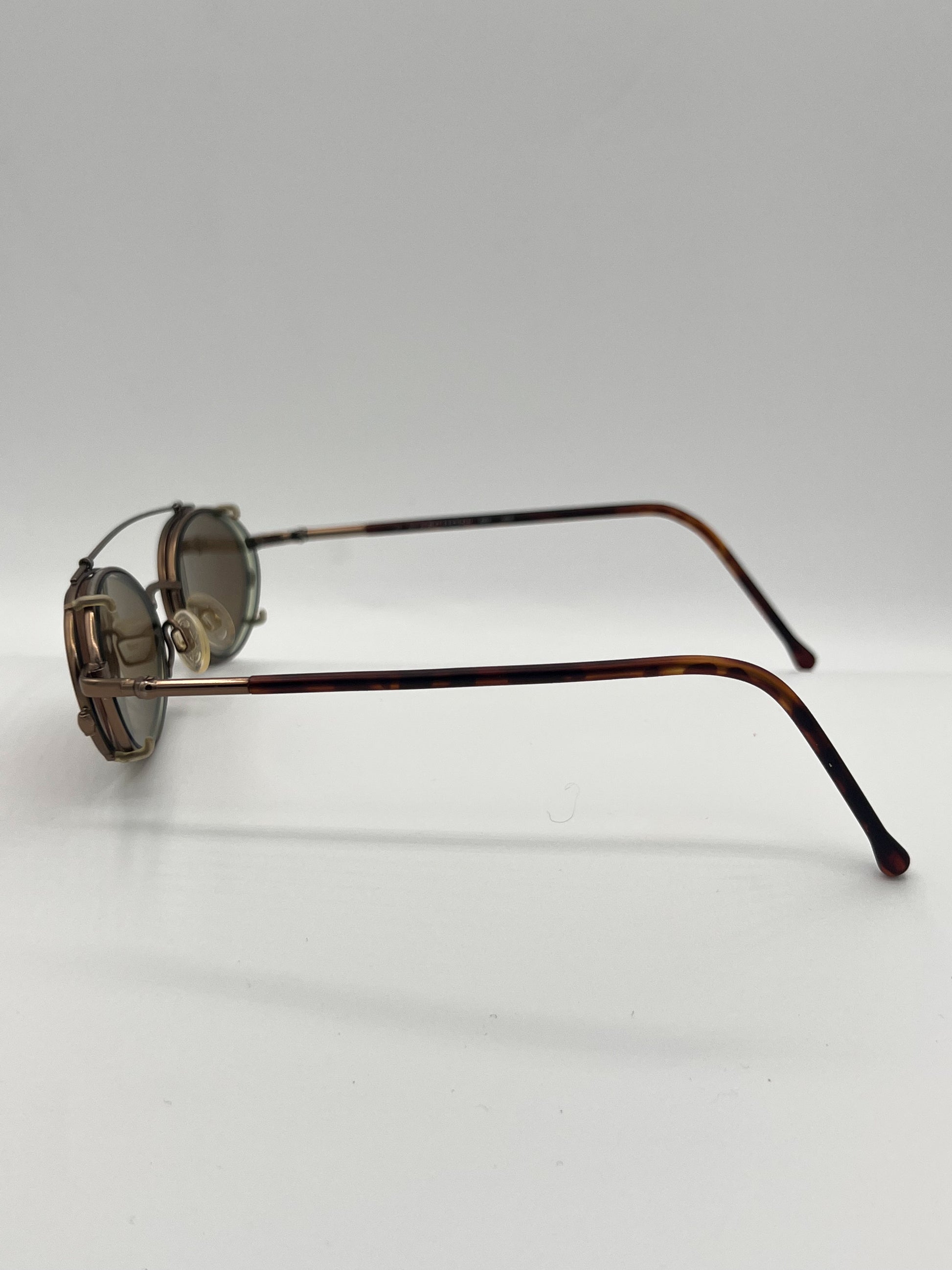 MARCHON! Wire clip-on frame with nose bridge. Brown clip, lightly tinted green oval lenses underneath. Two entirely different looks. Made in Italy, 1970s.