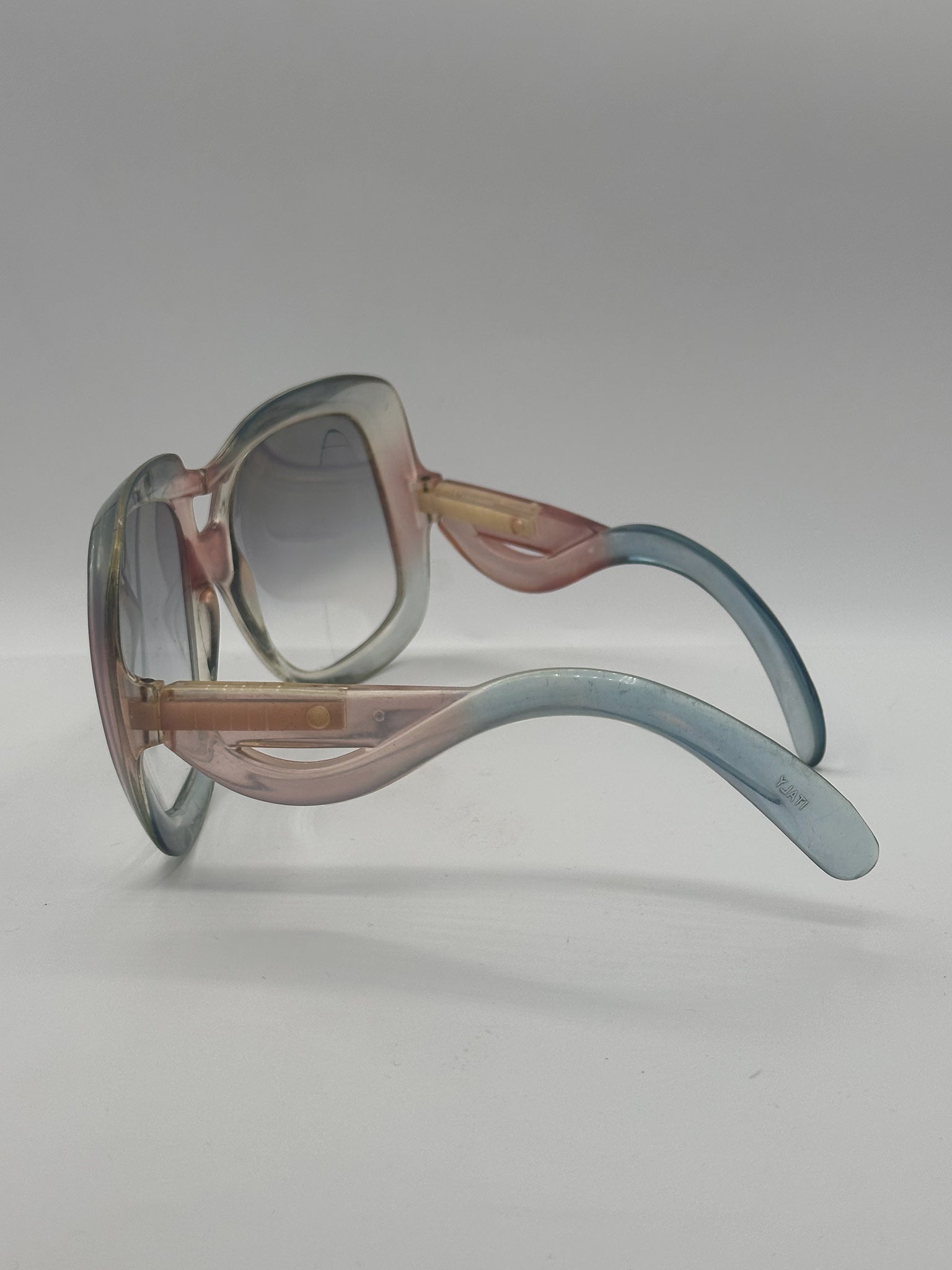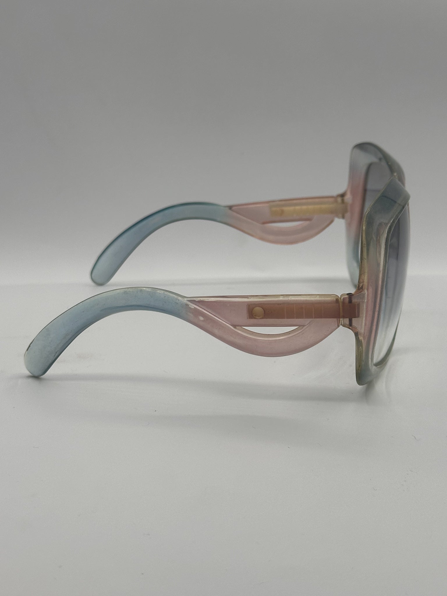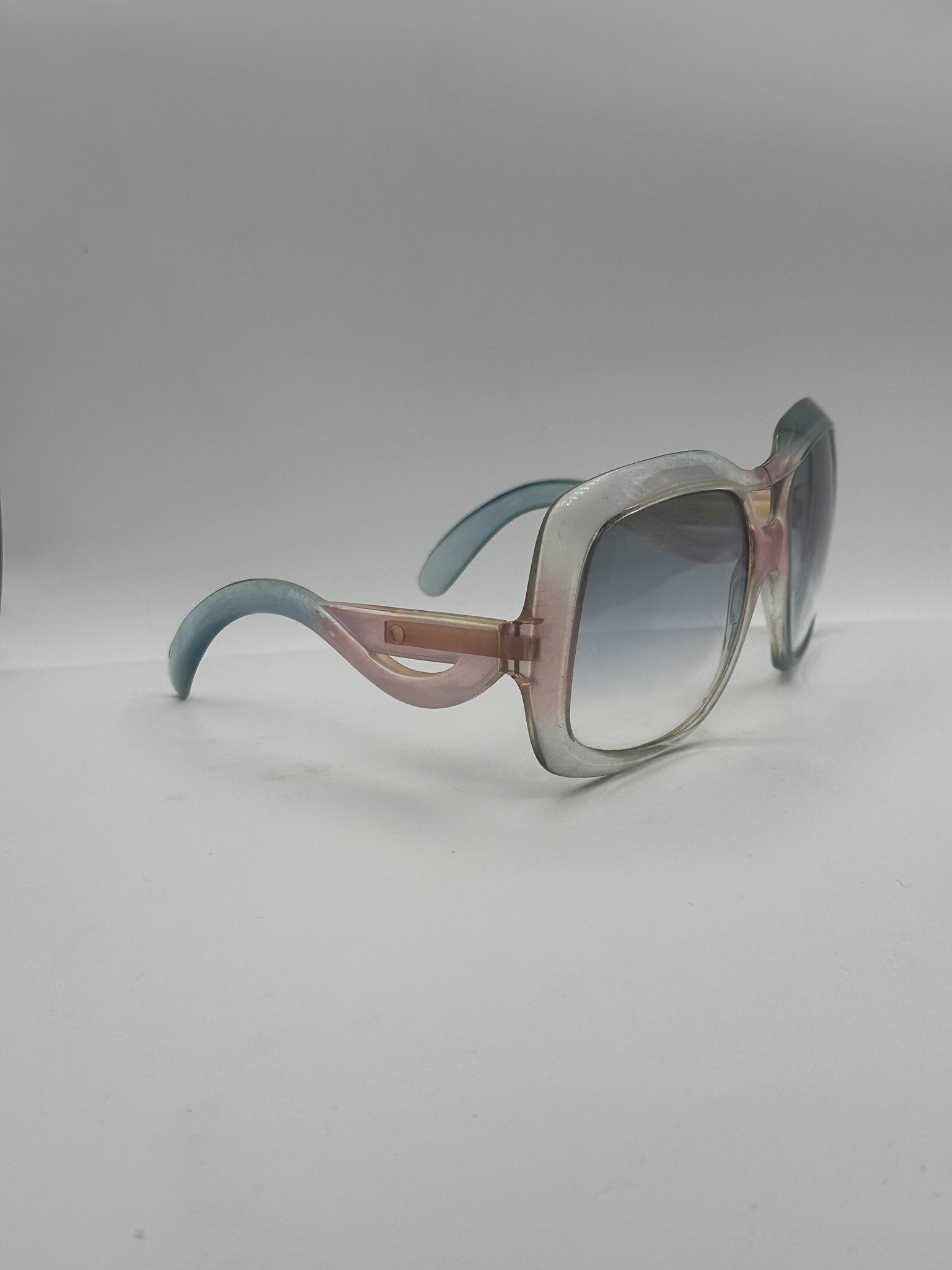 Chunky and full of personality! An array of baby blue, pink, and white with light reflective lenses. Worth noting, there is a crack in the upper bridge on this frame. Made in France.