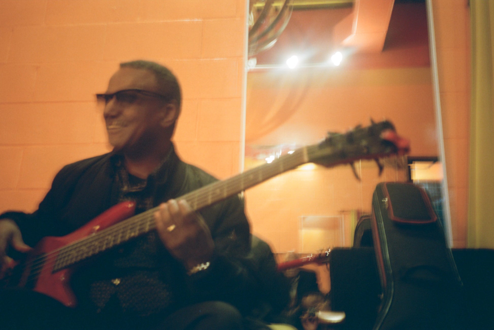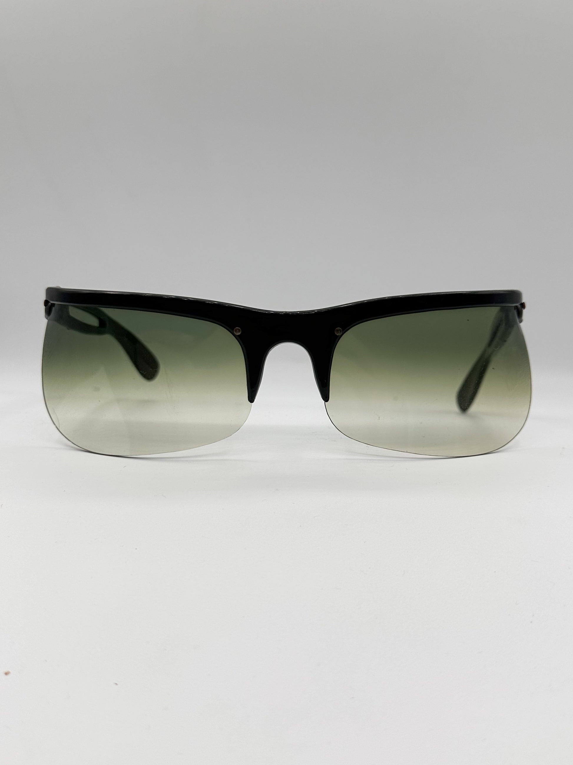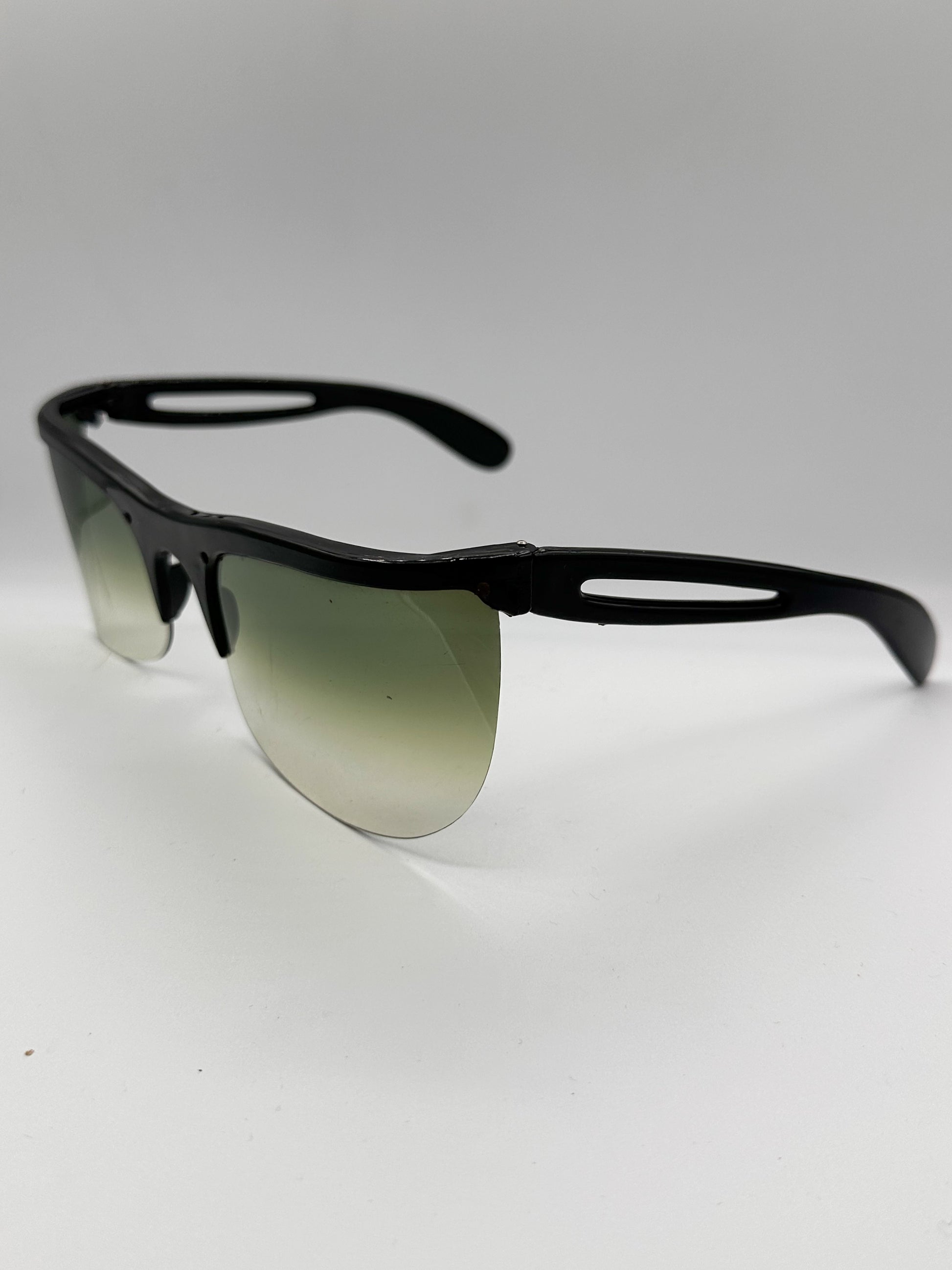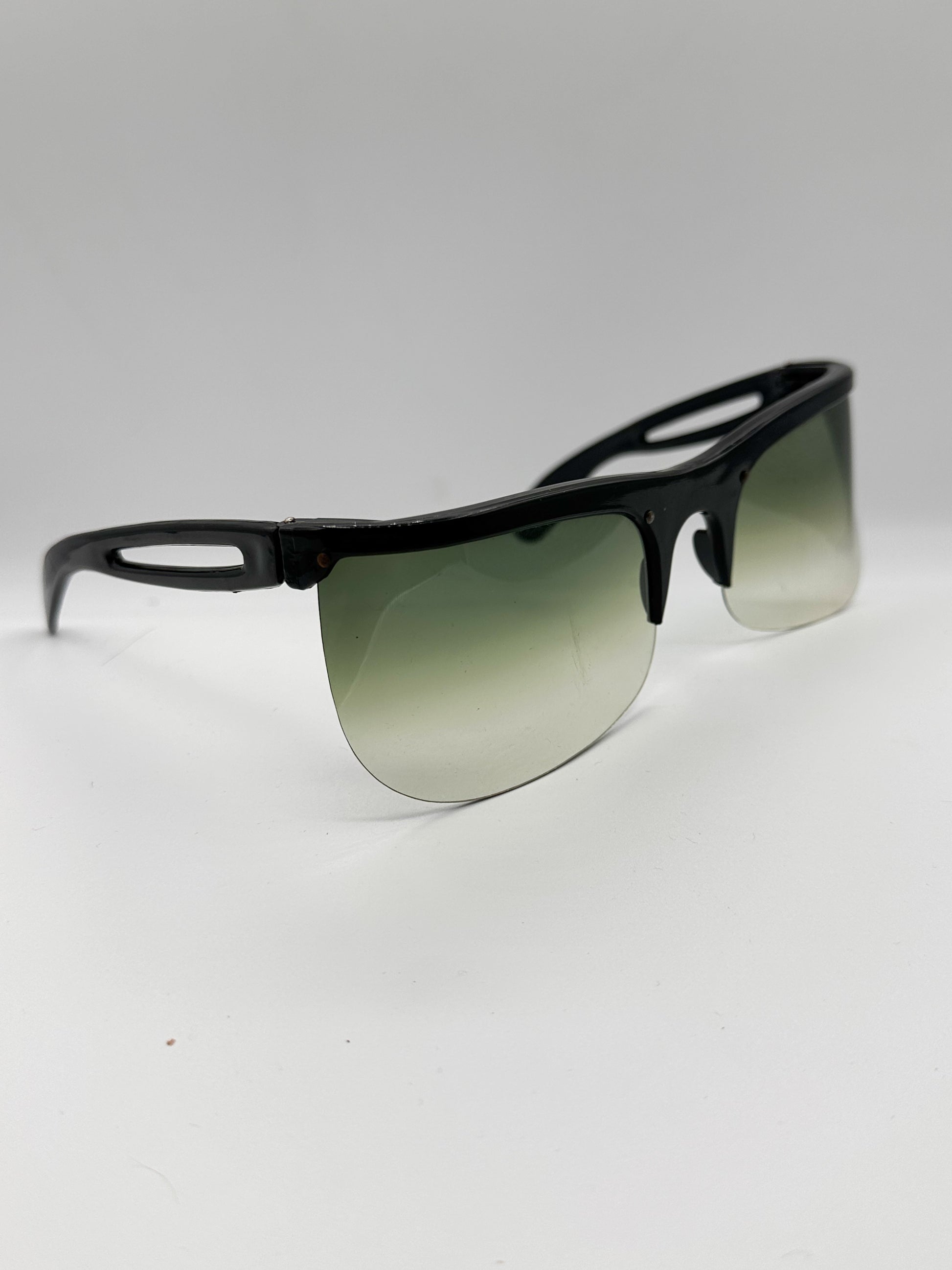 LARGE frame! Best suited for wide faces/heads. Black plastic frame with green faded lenses, also plastic.