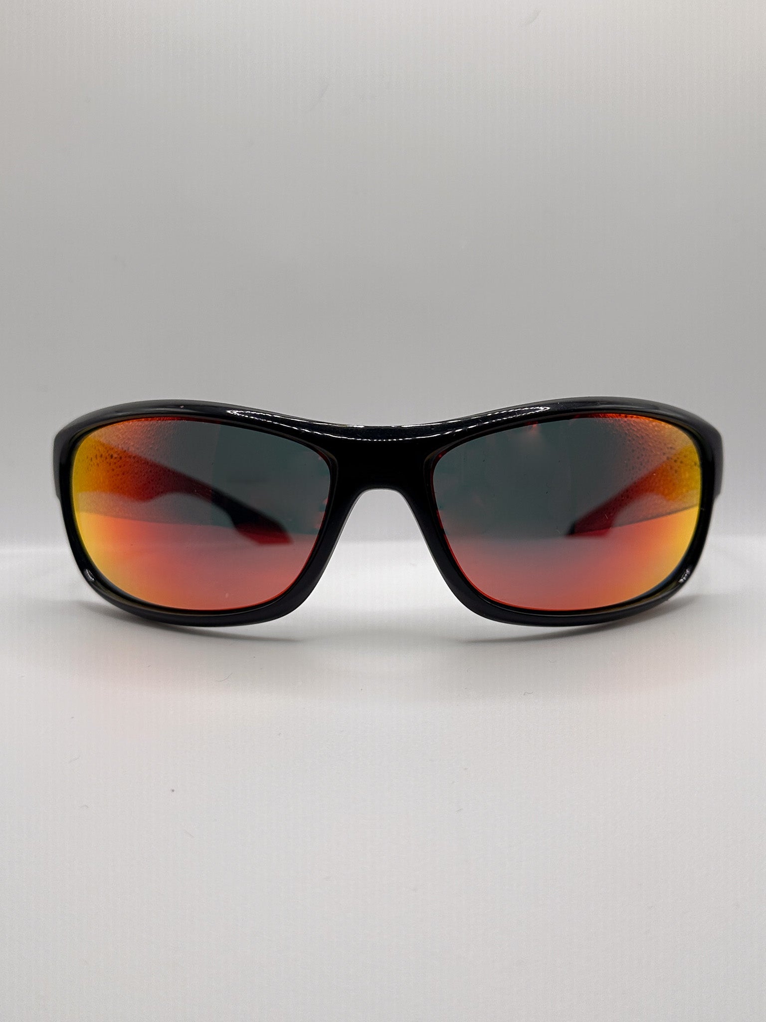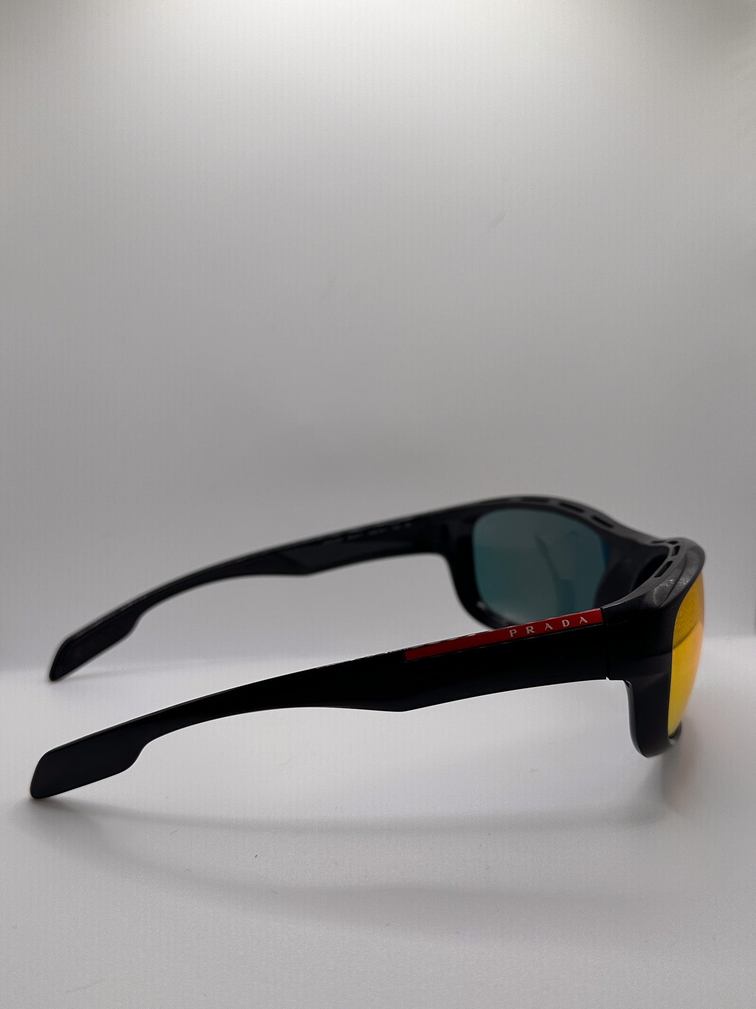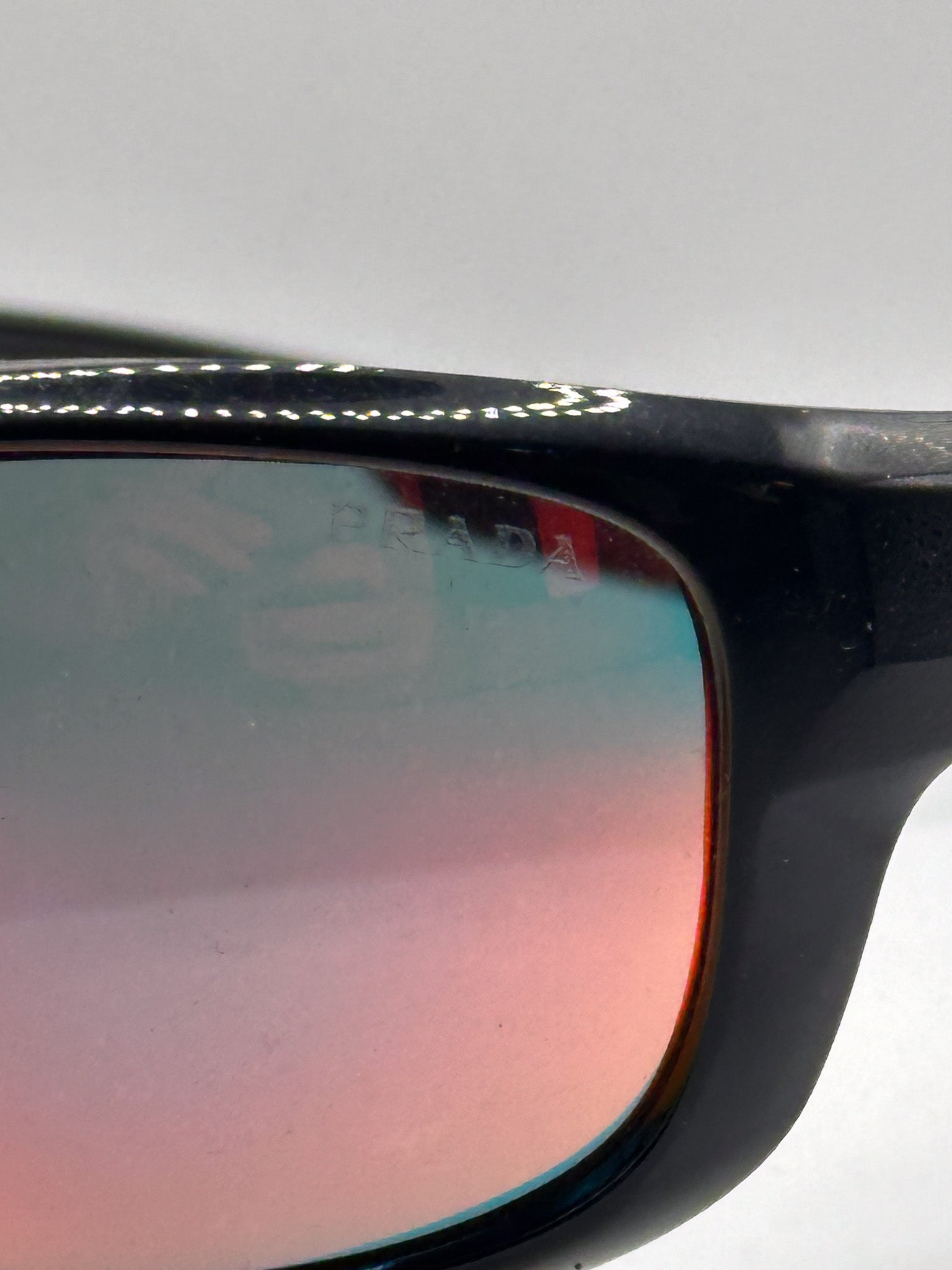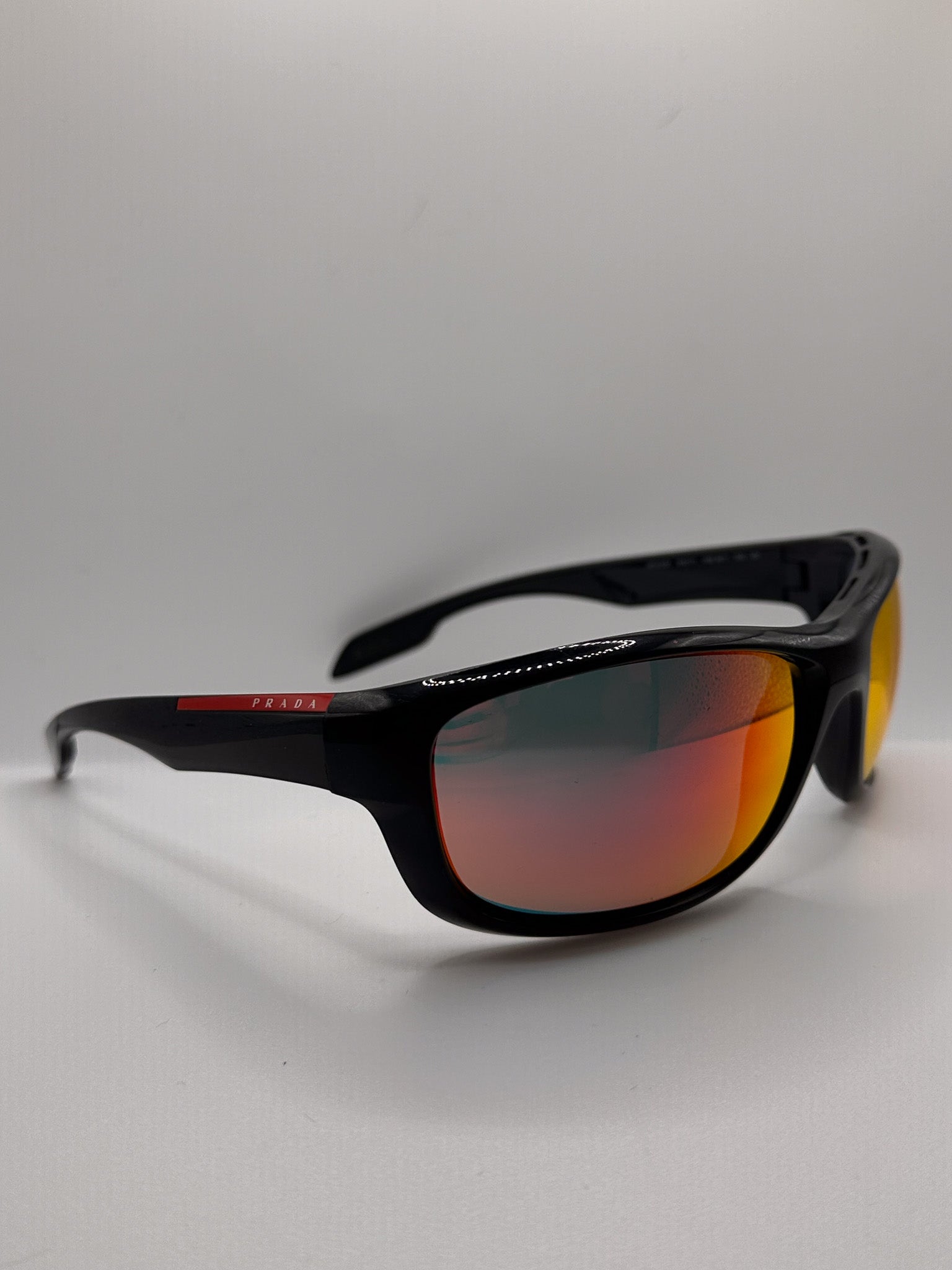 1990s Prada sunglasses with orange/red reflective lenses. Made in Italy. Wrap-around, sporty fit.