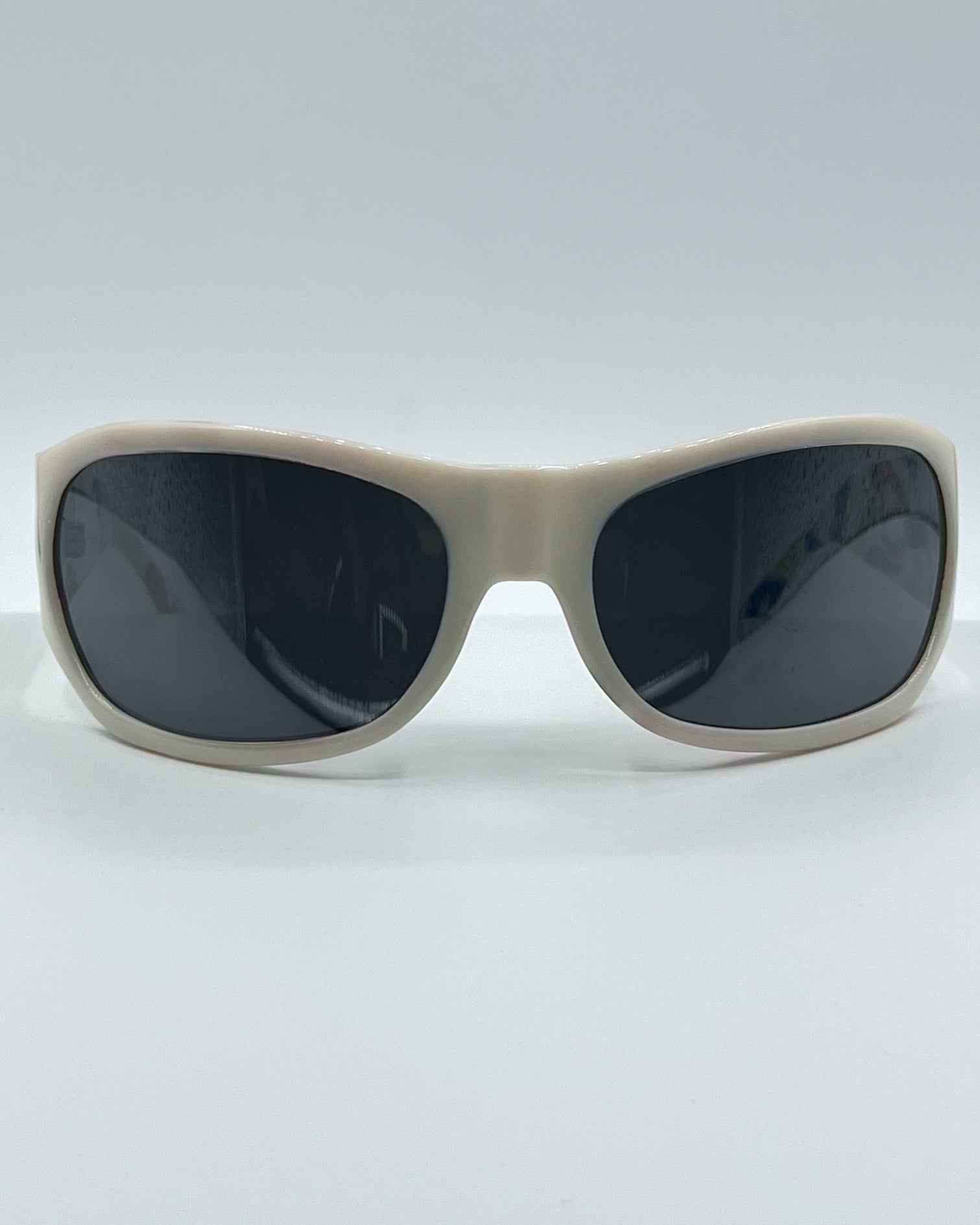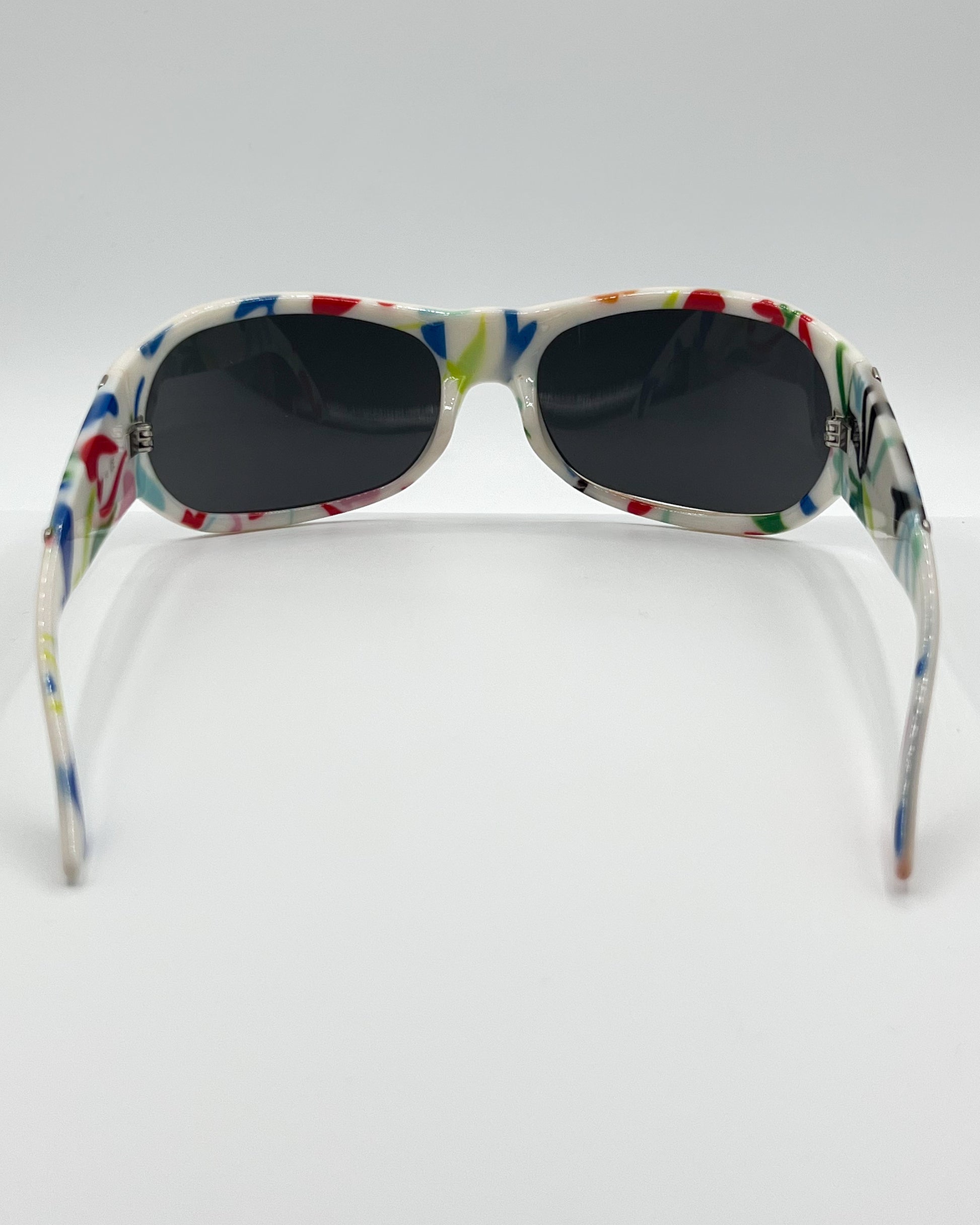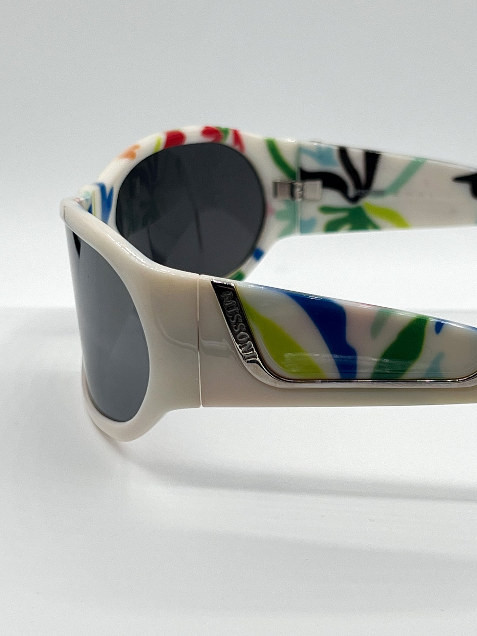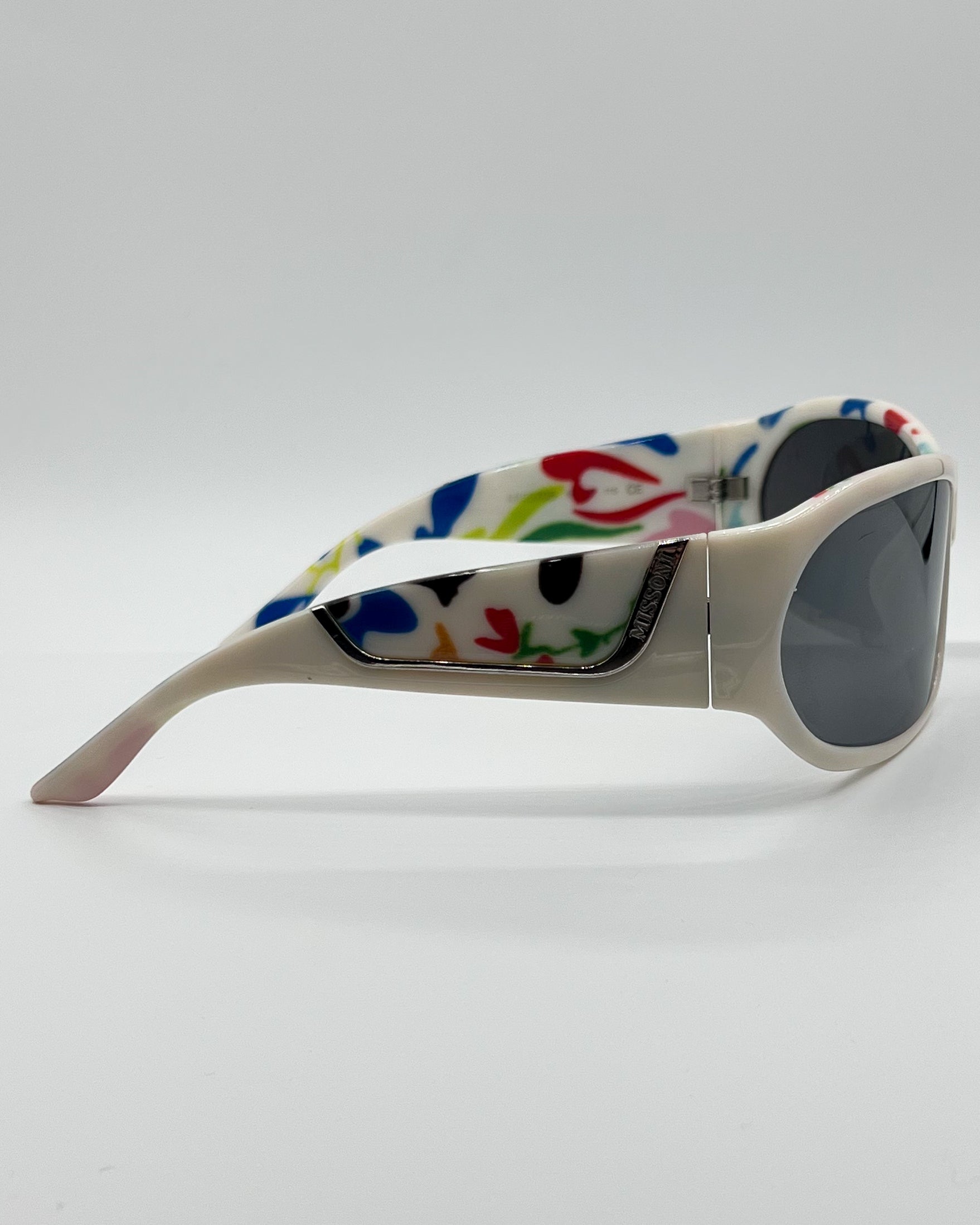ORIGINALLY MANUFACTURED IN ITALY BY MISSONI IN THE EARLY 2000S. THESE WHITE OVAL WRAP-AROUND GLASSES ARE COMPLETE WITH A BEAUTIFUL, COLORFUL ARRAY OF FLOWERS DANCING AROUND THE INTERIOR.
