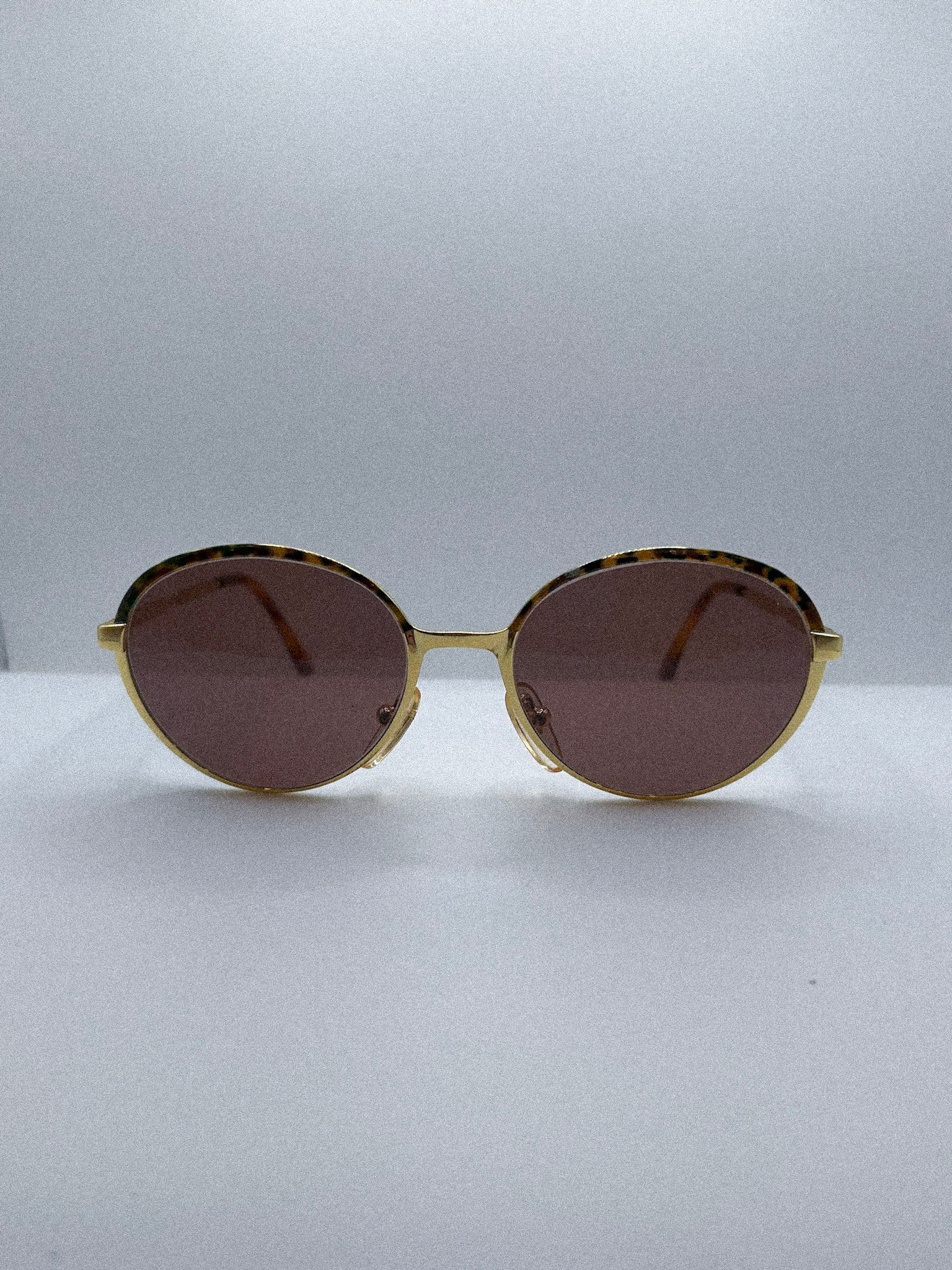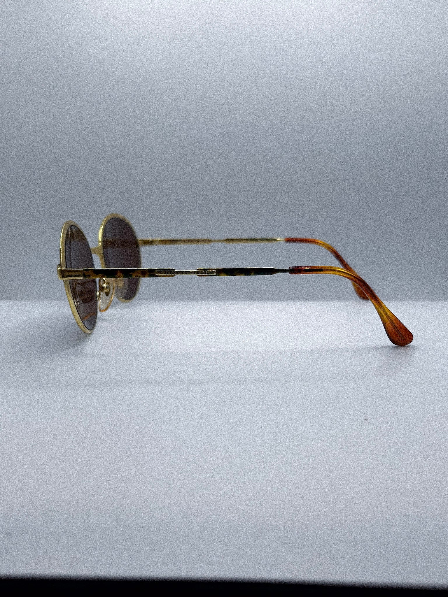 These 1990s Mariella Burani sunglasses blend Italian glamour with a touch of playful refinement. Their round silhouette is framed in warm gold, while the upper rim carries a subtle tortoiseshell accent that softens the structure and adds depth. The brown gradient lenses shift the mood into something cinematic and warm, giving the frame a quiet, nostalgic glow.