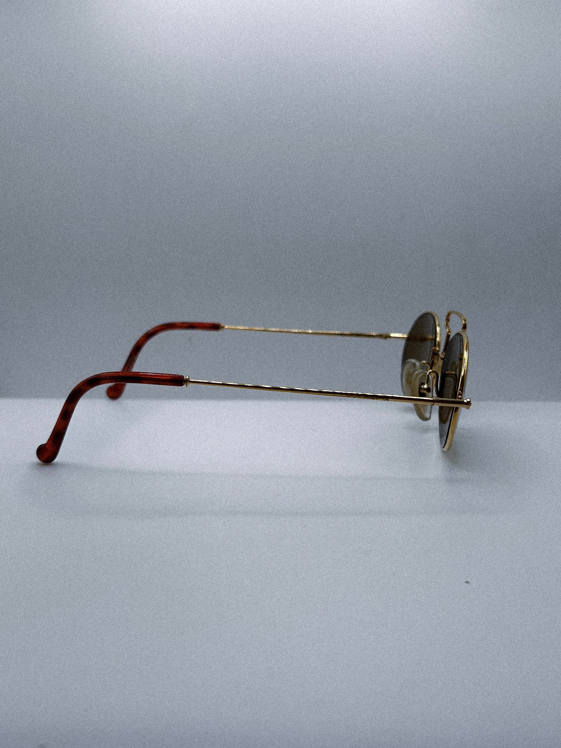These 1980s Christian Lacroix sunglasses embody the dramatic elegance that defined the designer’s early couture years. The circular gold frame is delicate yet theatrical, anchored by warm brown gradient lenses that cast everything in a soft, amber-tinted glow. The minimalist wire construction creates a refined silhouette that feels both poetic and unmistakably of its era.