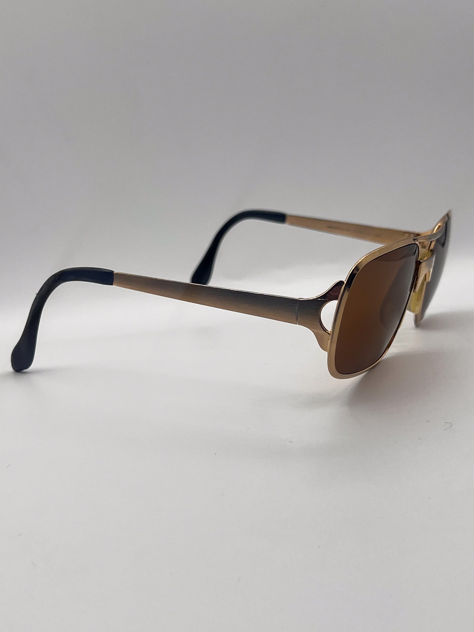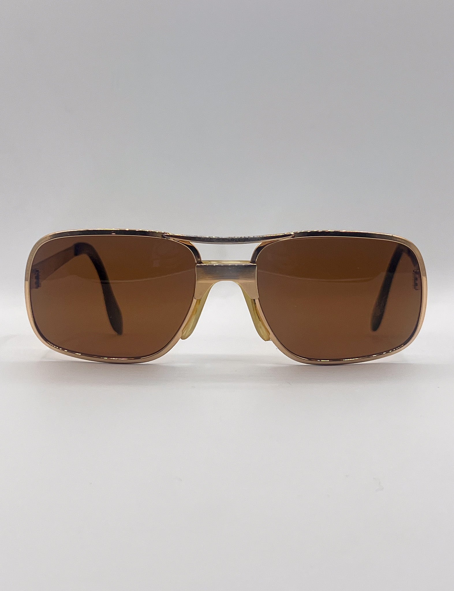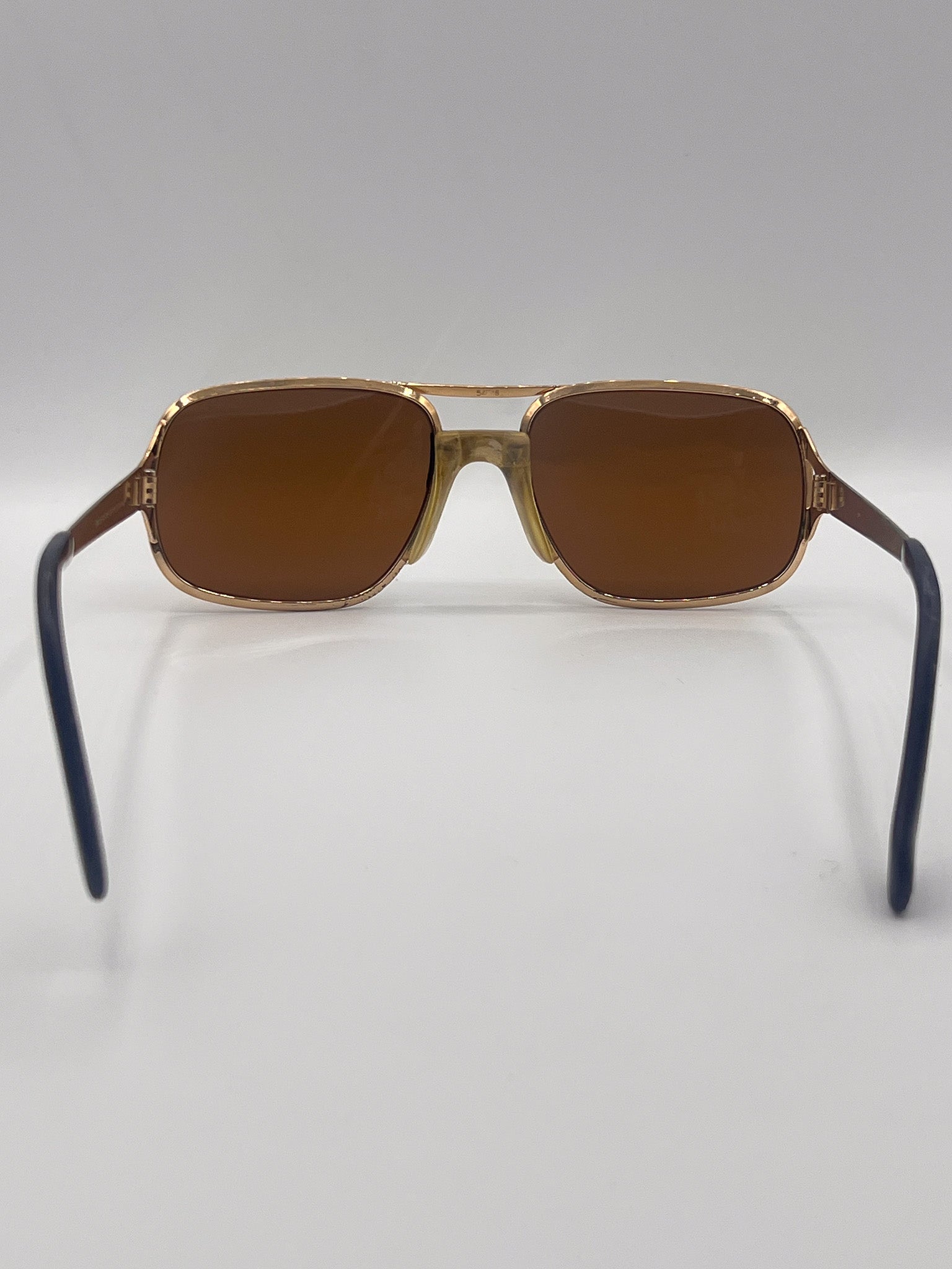 1960s gold aviator frames with NEW polarized lenses. Retro plastic nosepiece that is one overall shape. Sits comfortable on the nose, heavy-weight frame with black temple pieces.
