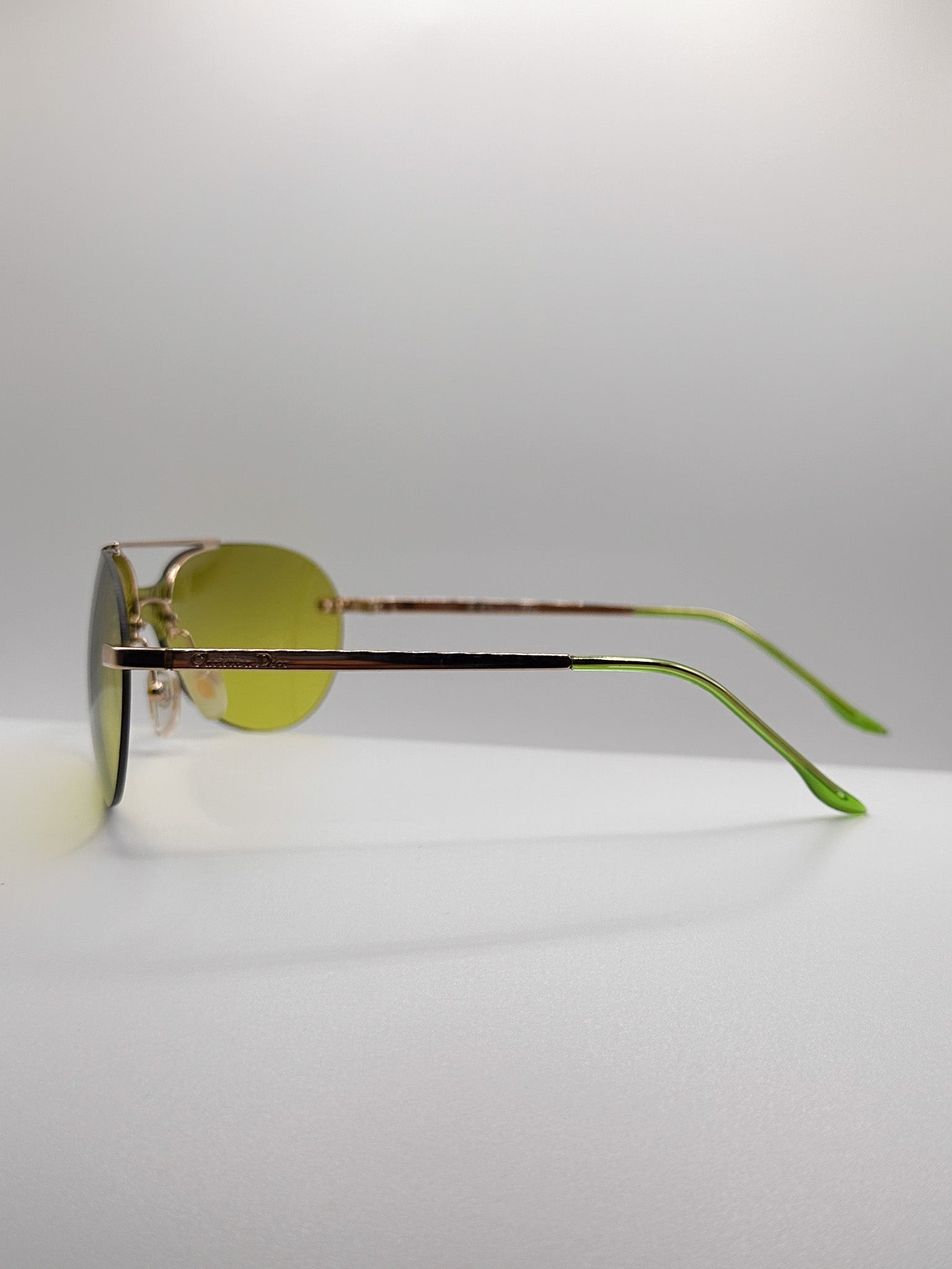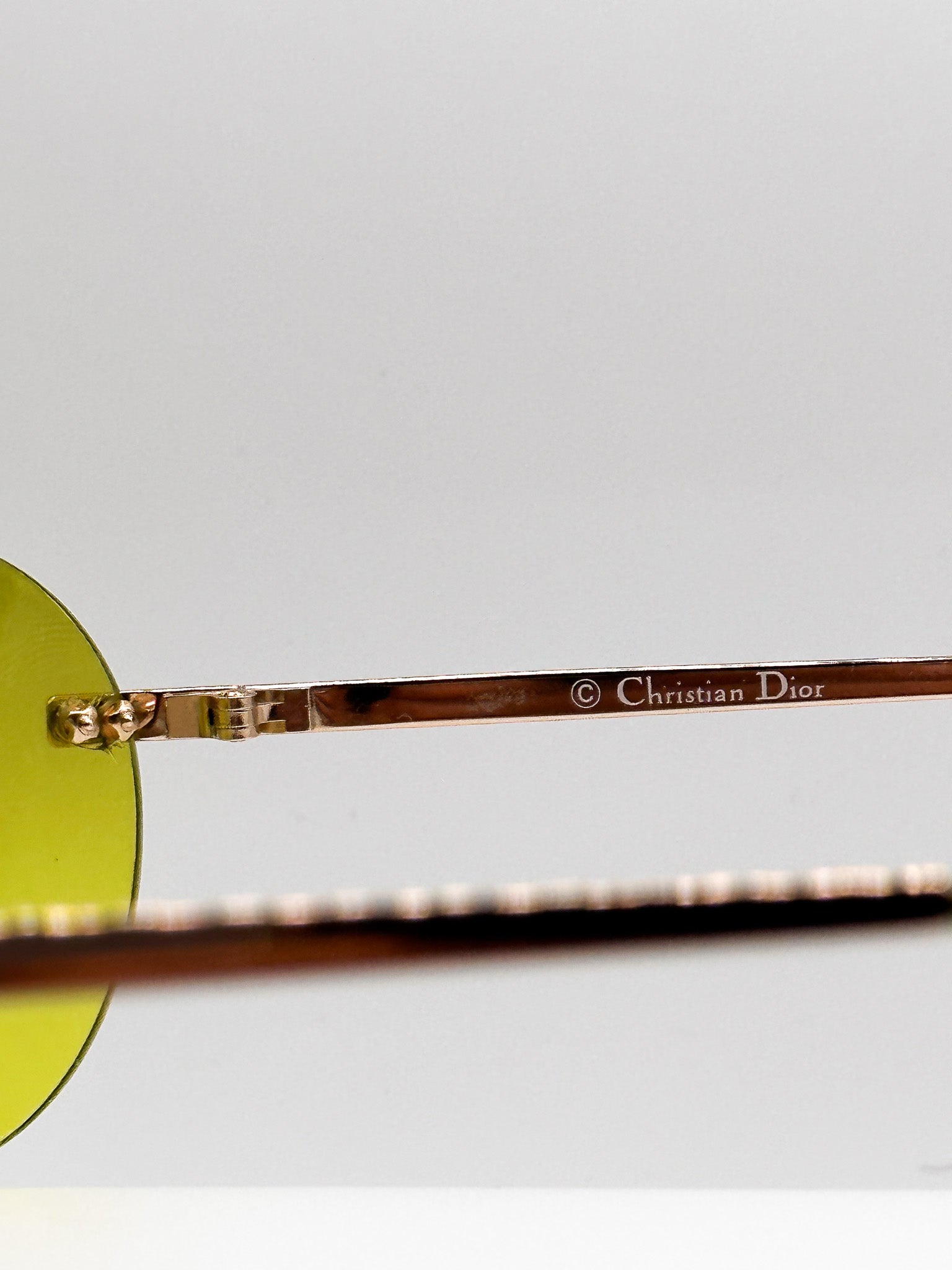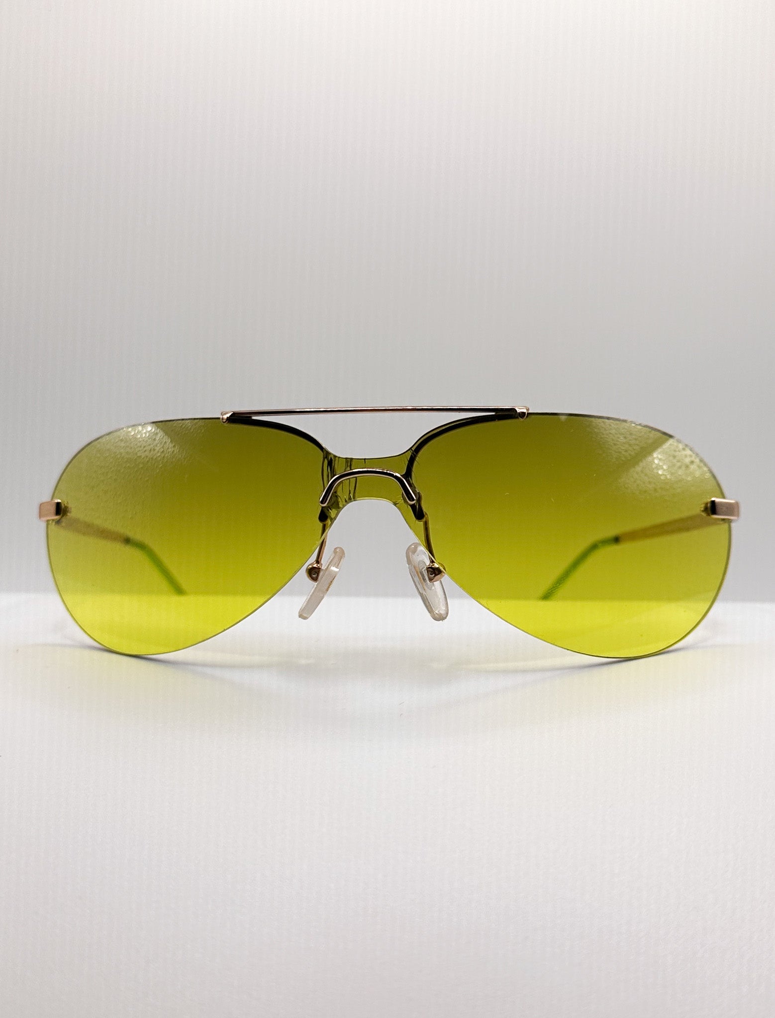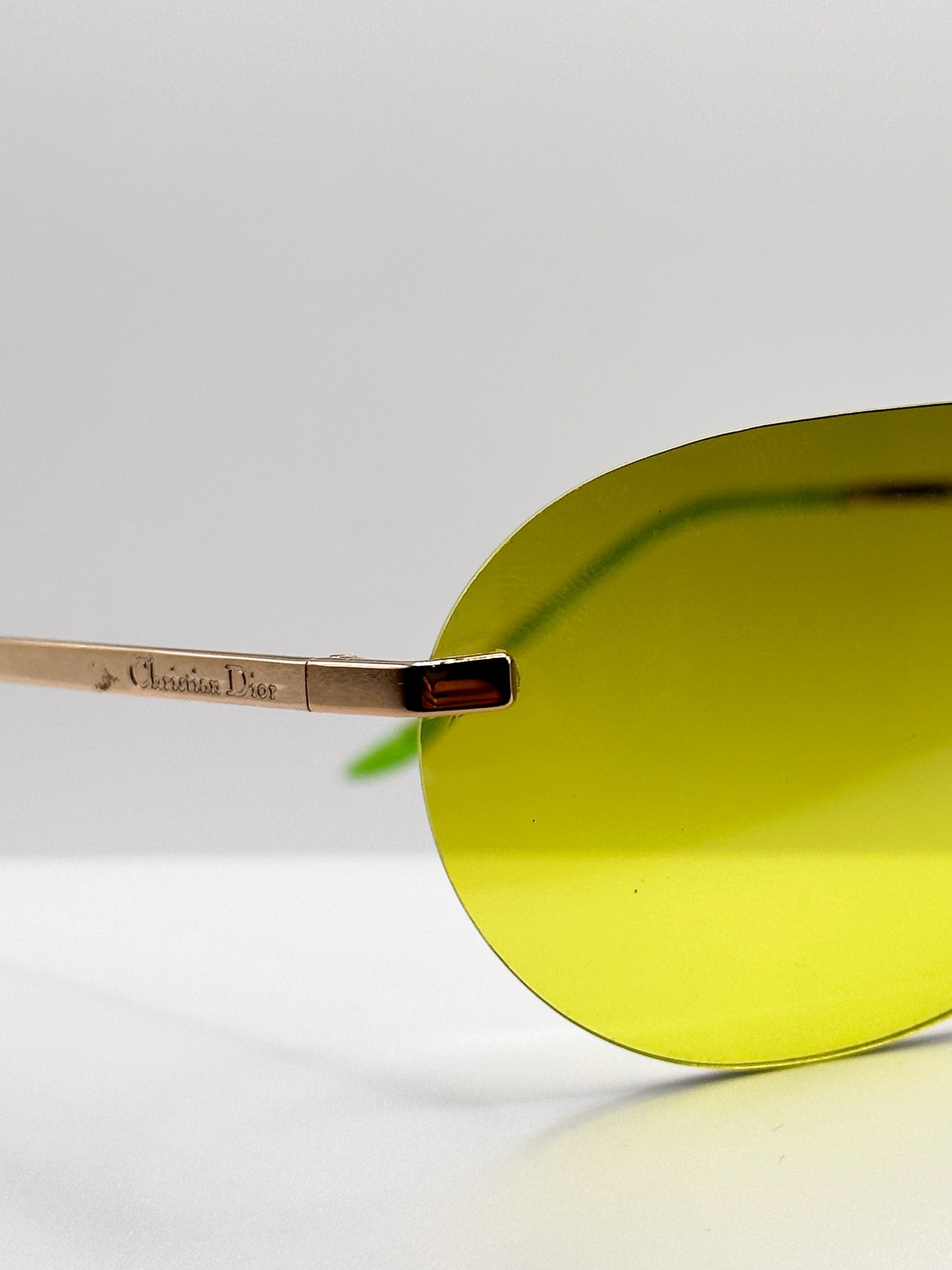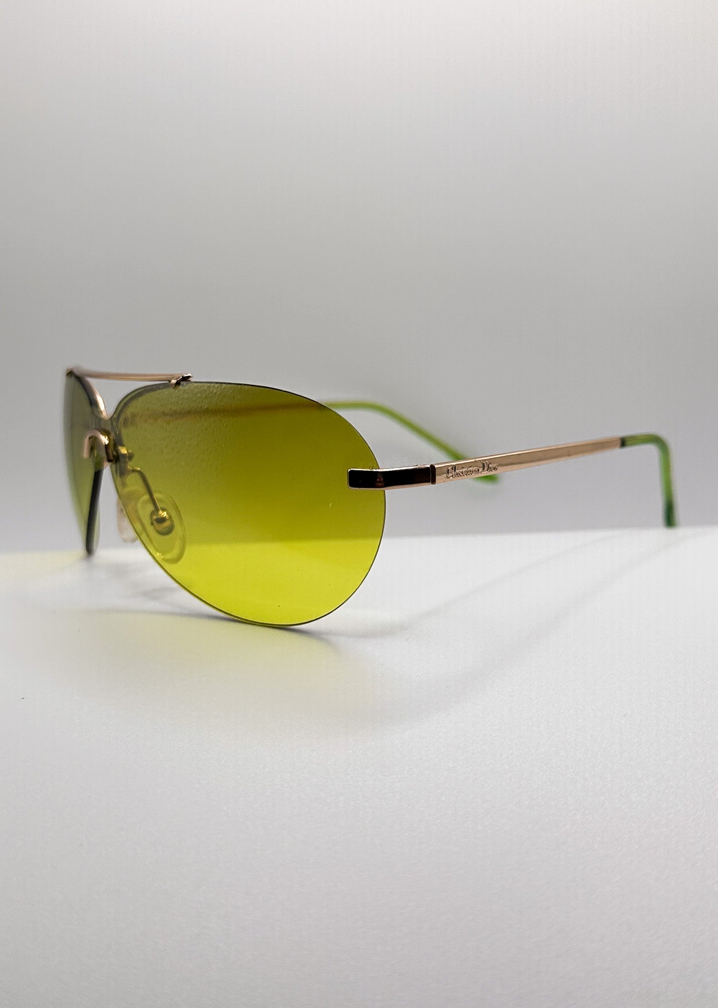RARE Dior shield aviators with lime green lenses & matching temple pieces. "Mini Aviator" from 1990s, made in Austria. Christian Dior etched in ear piece inside & outside. Slight cracks in mid-nose, not very visible when wearing. Crack is reflected in price!