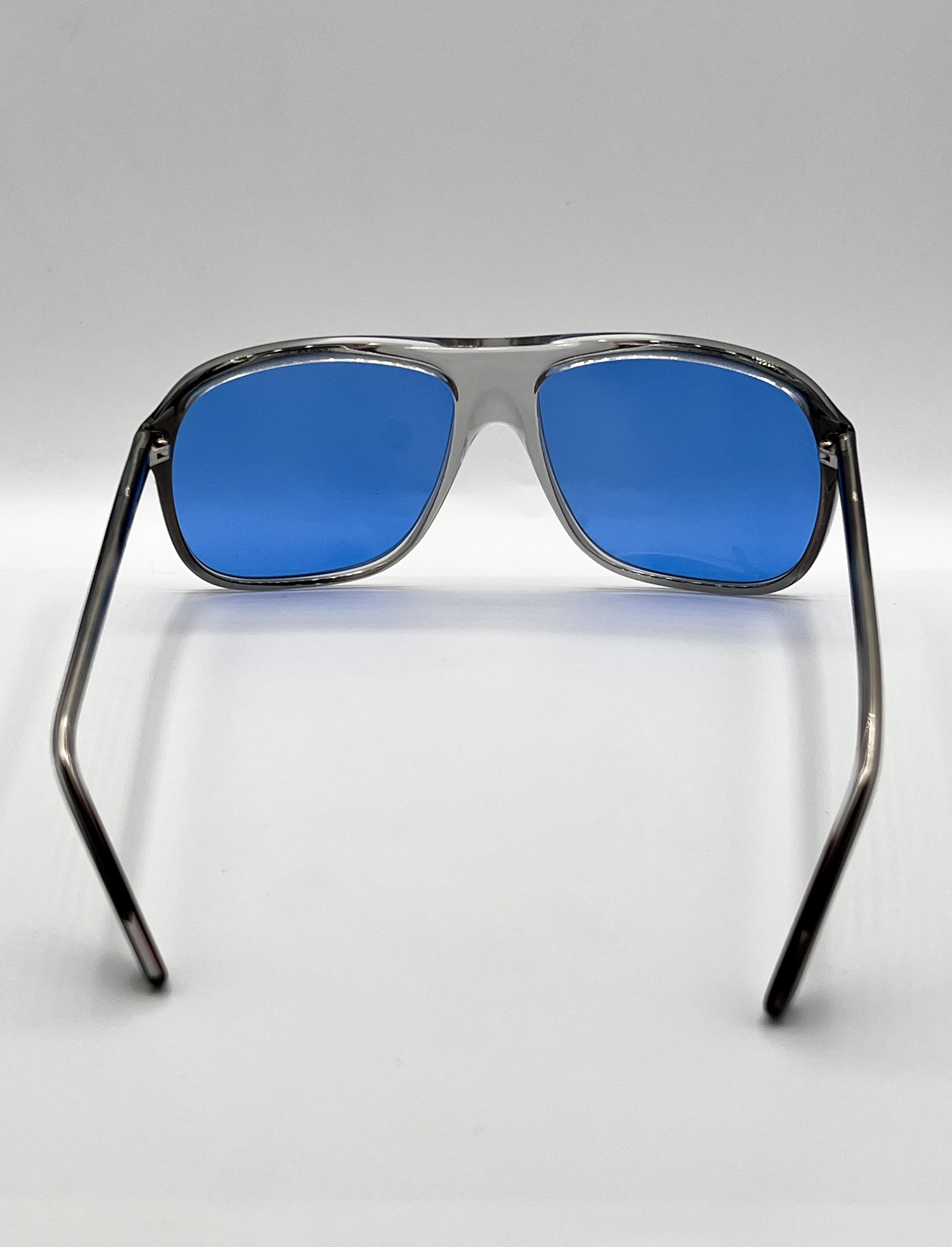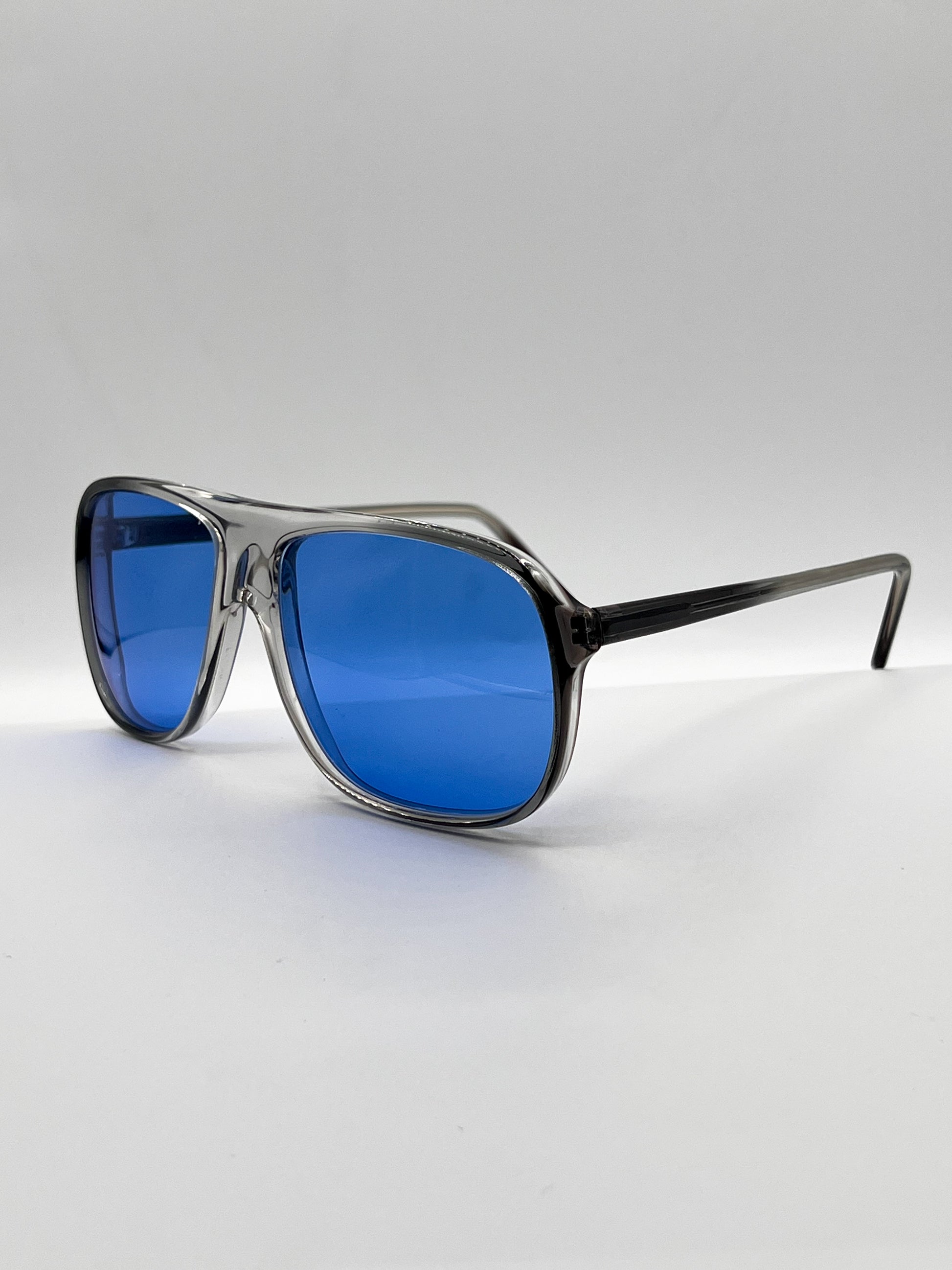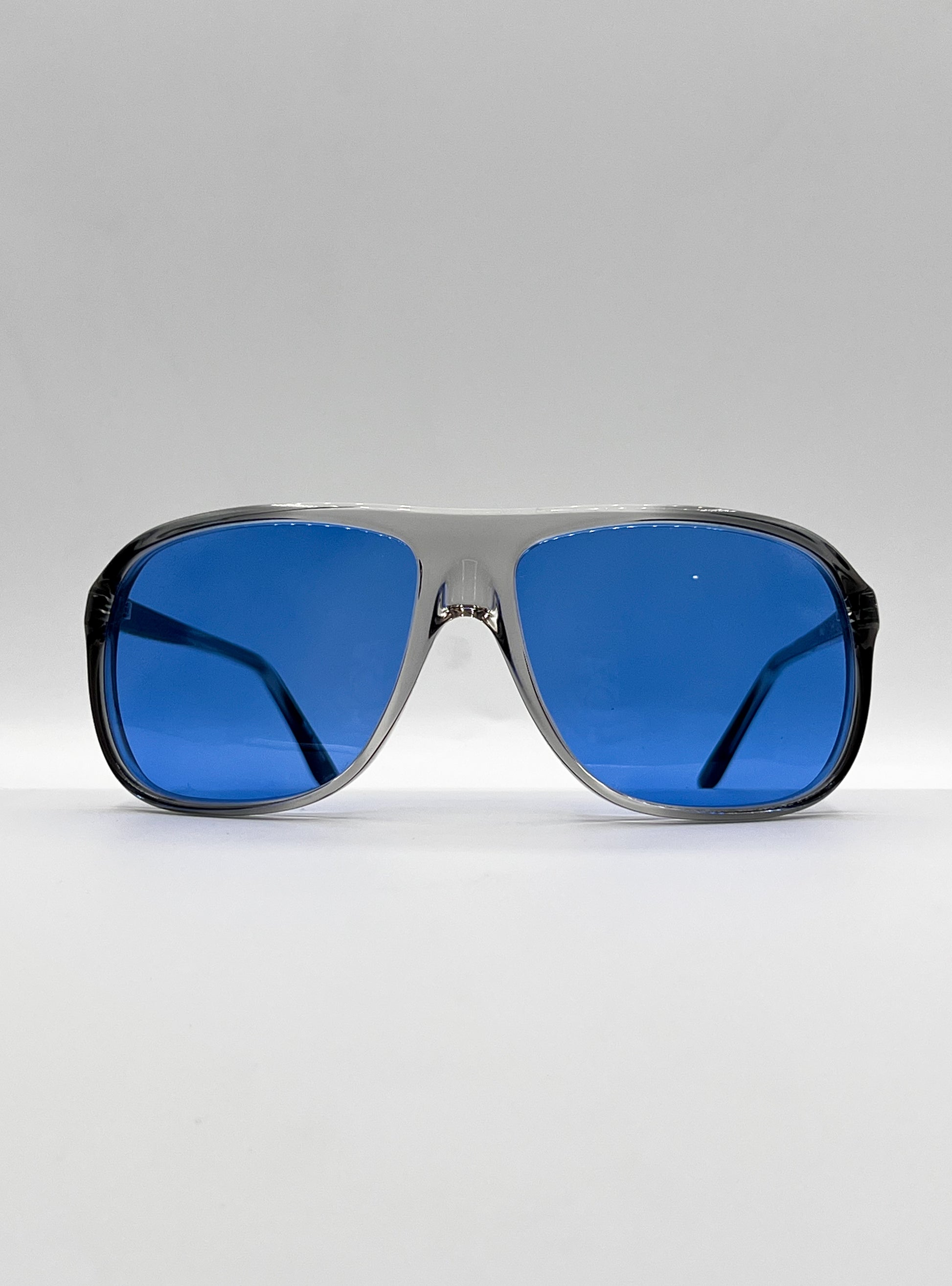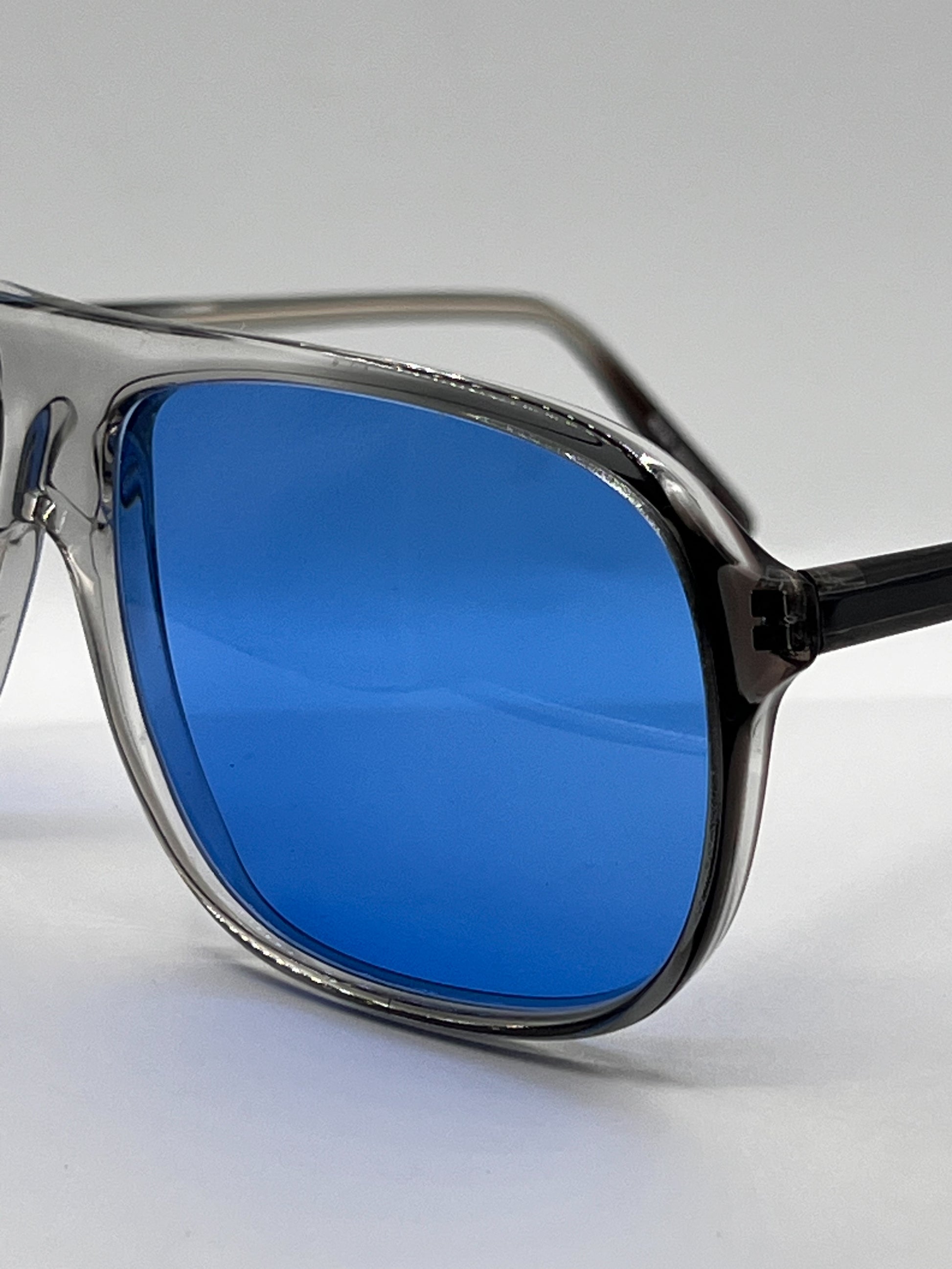 St Moritz acetate gradient frame newly remodeled with blue CR-39 lenses. Made in Hong Kong, remodeled in NYC.