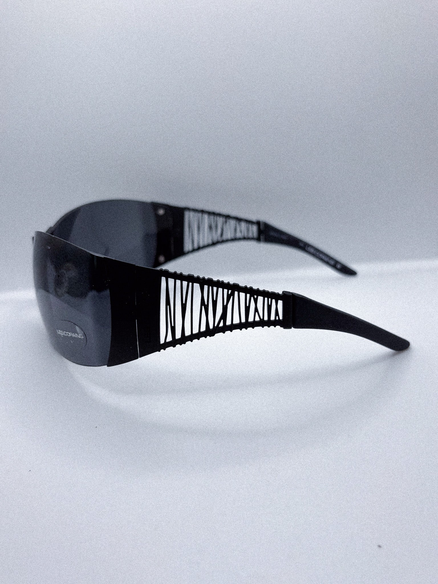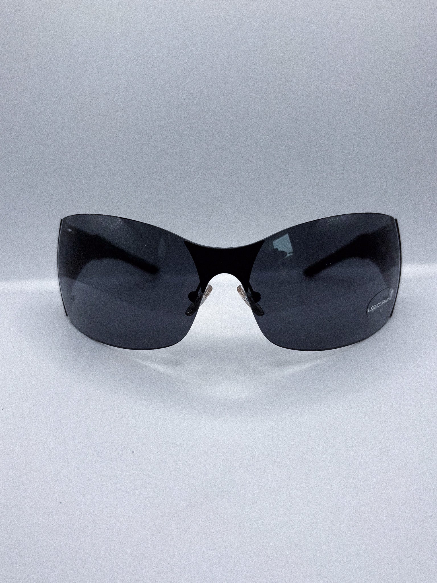 These 1990s Les Copains shield sunglasses embody the sleek futurism that defined the decade’s high-fashion edge. The single black lens stretches across a minimalist Italian frame, creating a seamless, aerodynamic silhouette that feels both powerful and elegant.