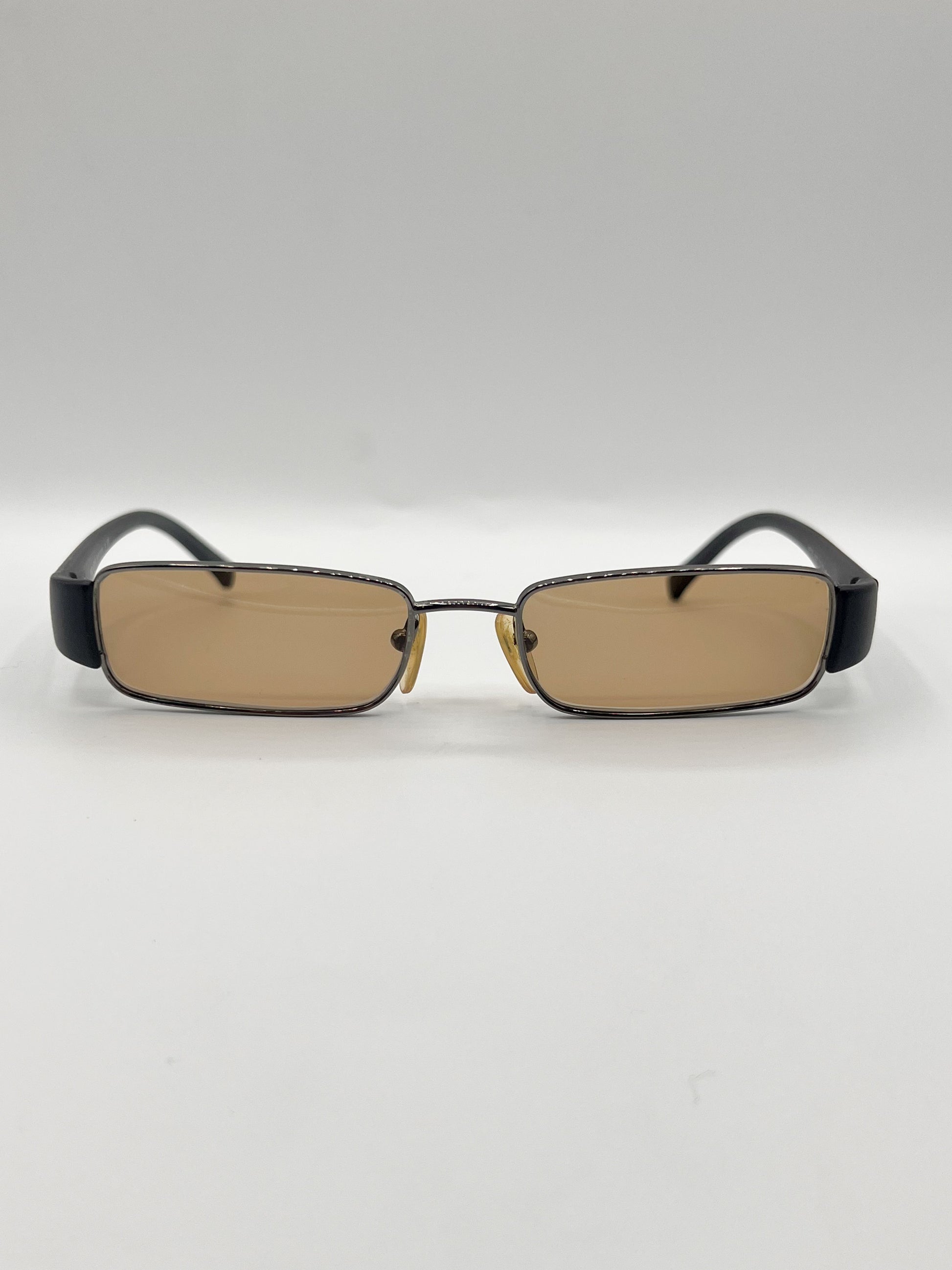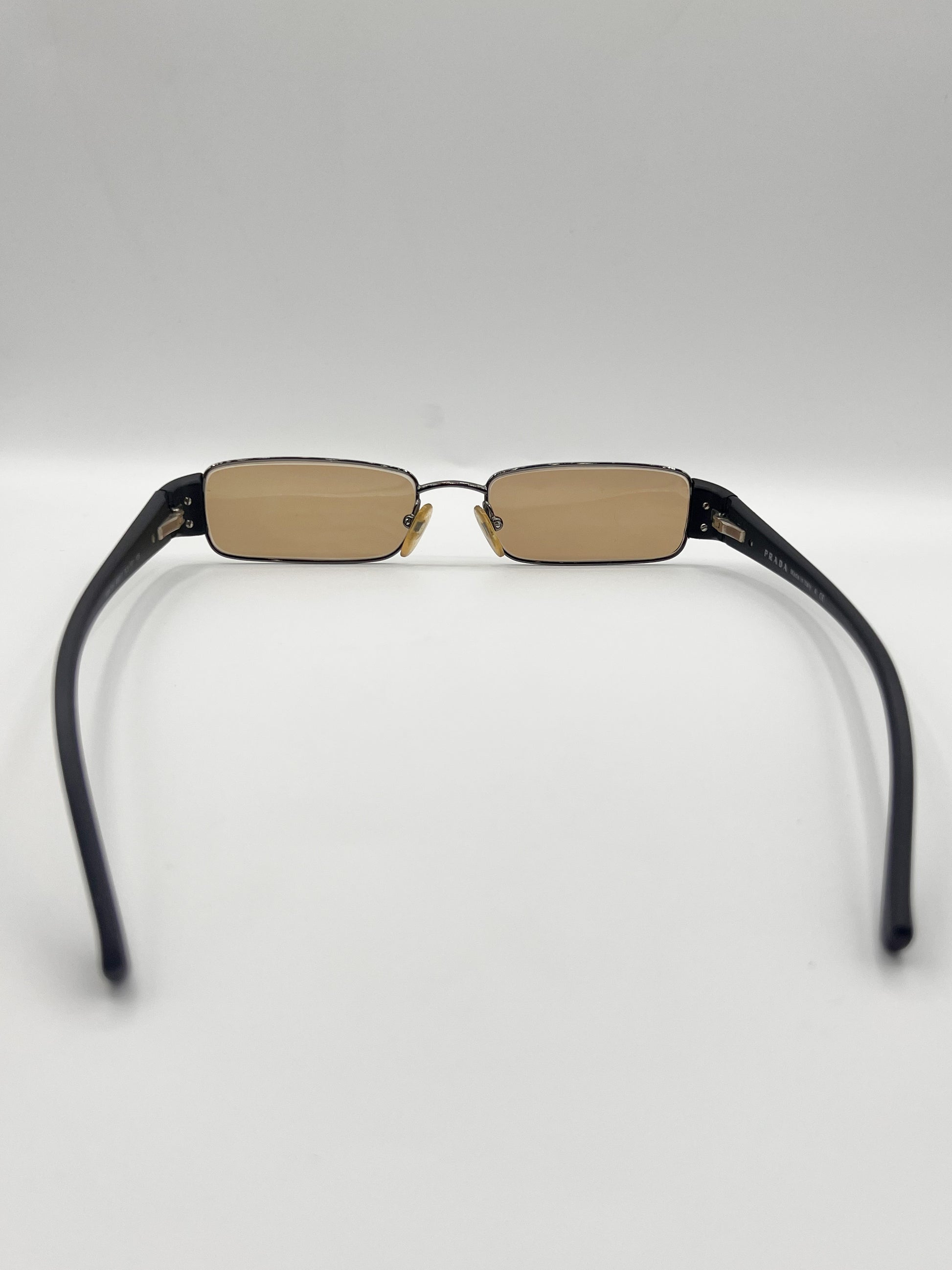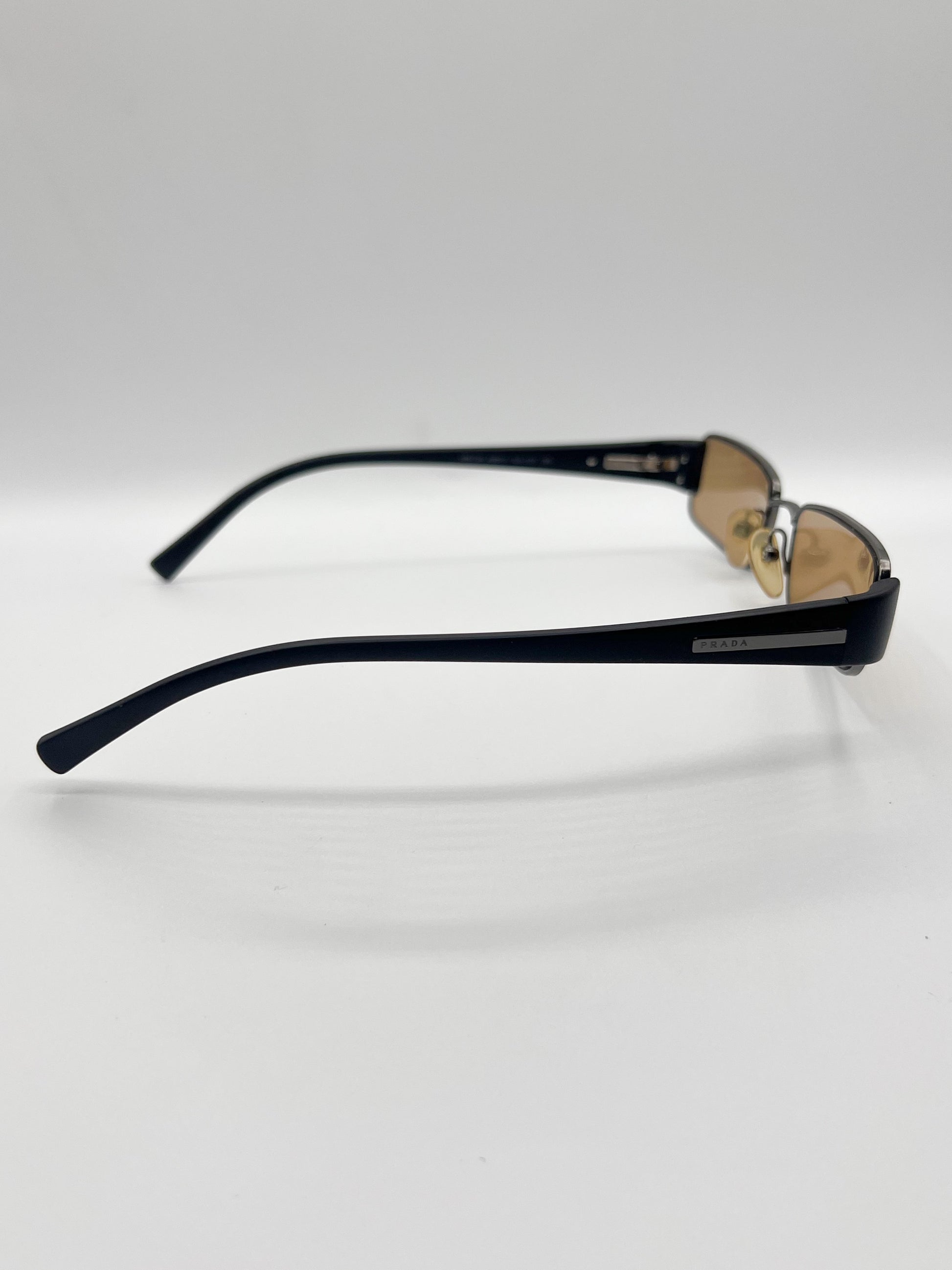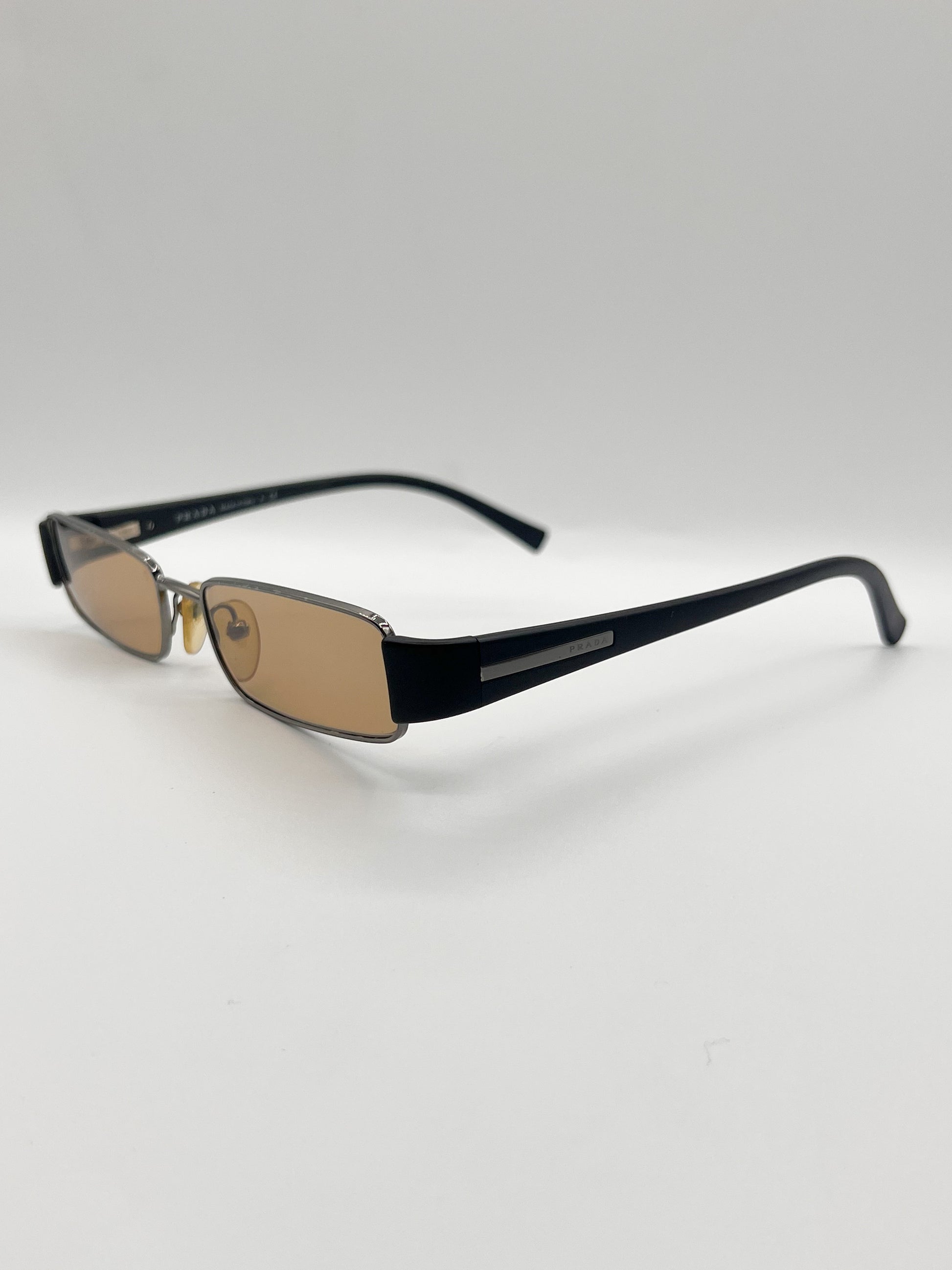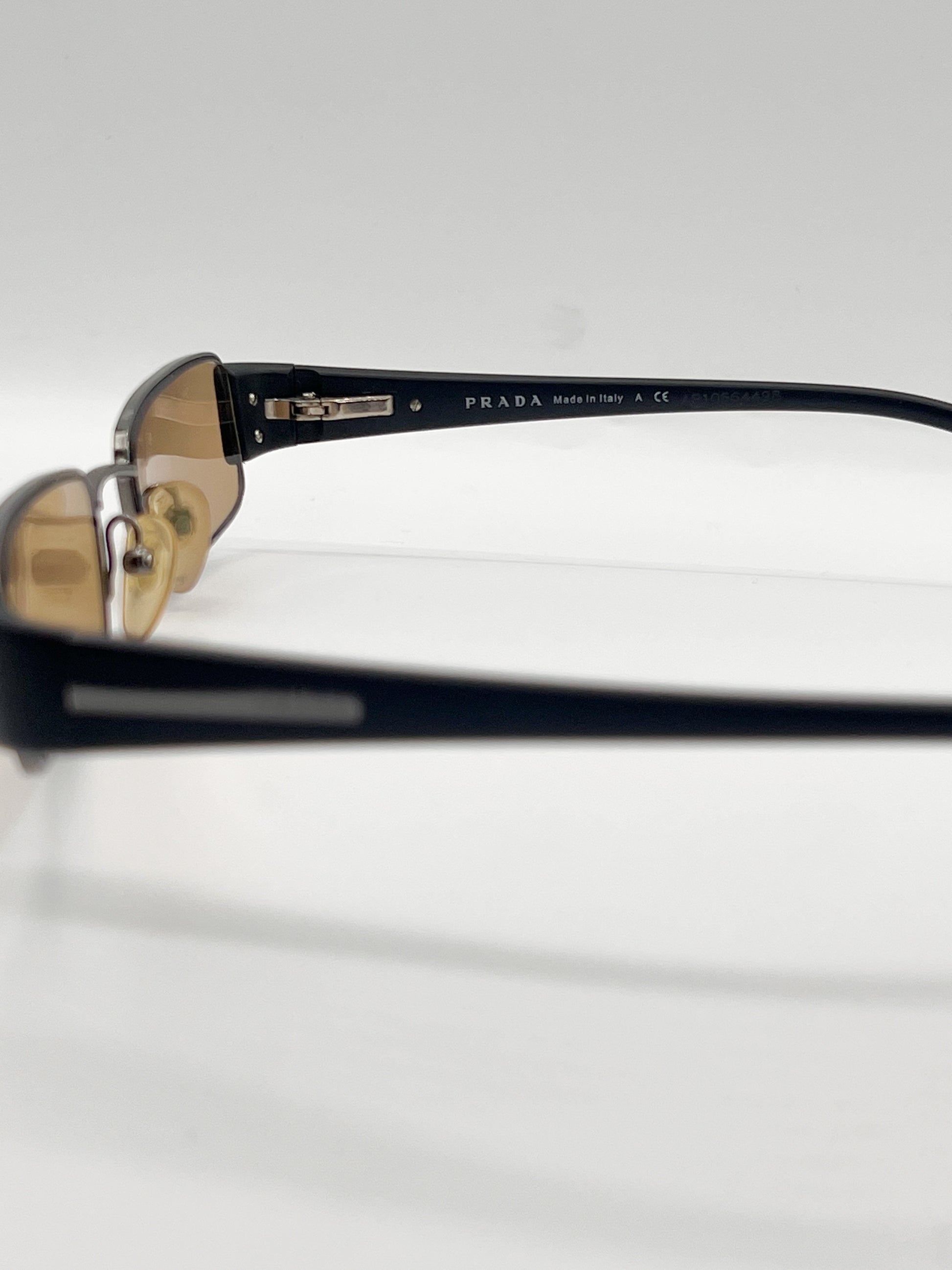 Prada. Rectangular lenses sit on this black frame, metal outlined in plastic. These lenses are a unique color — at times we compare making lense colors to mixing paint, in this instance, it is that.