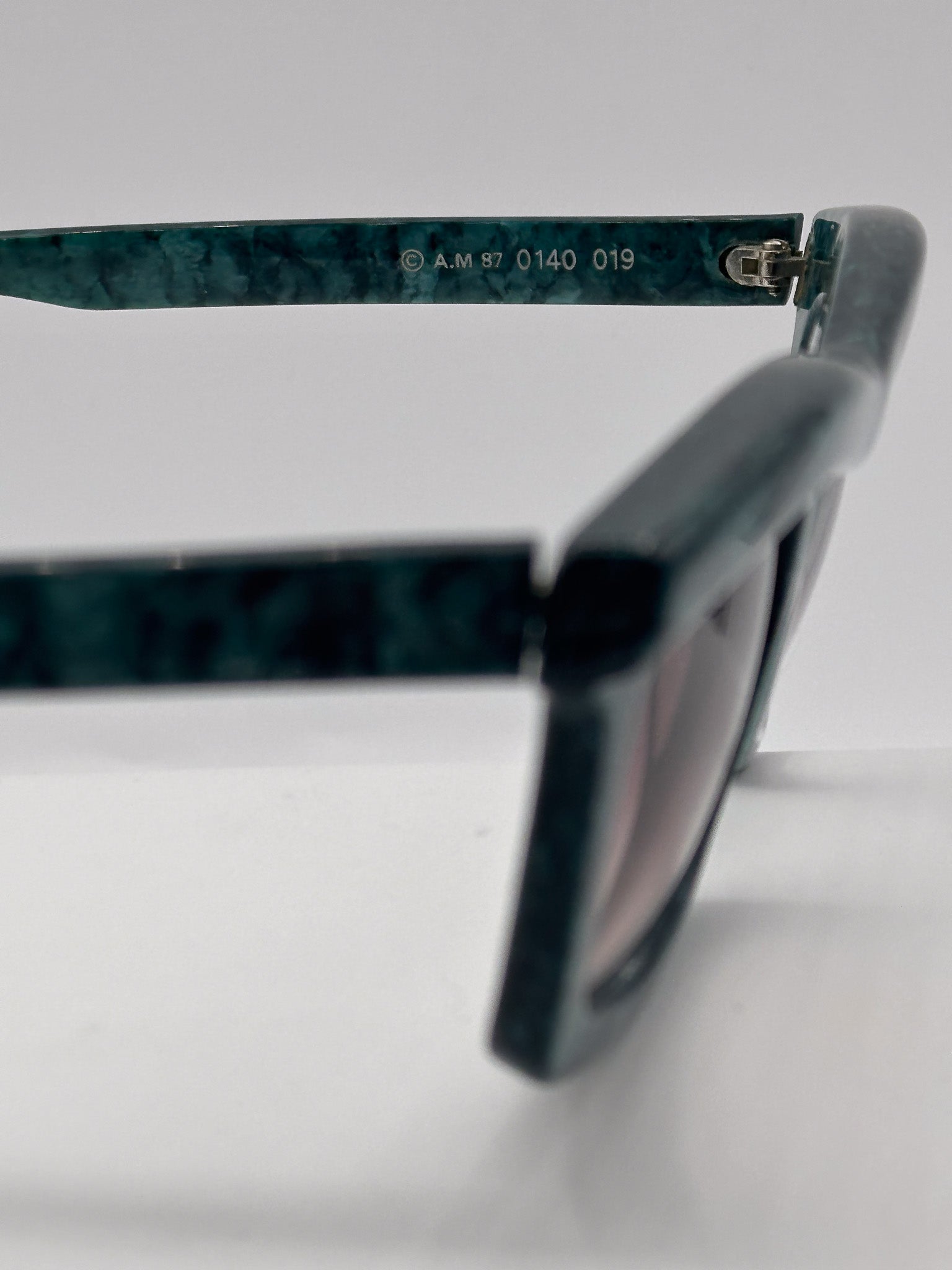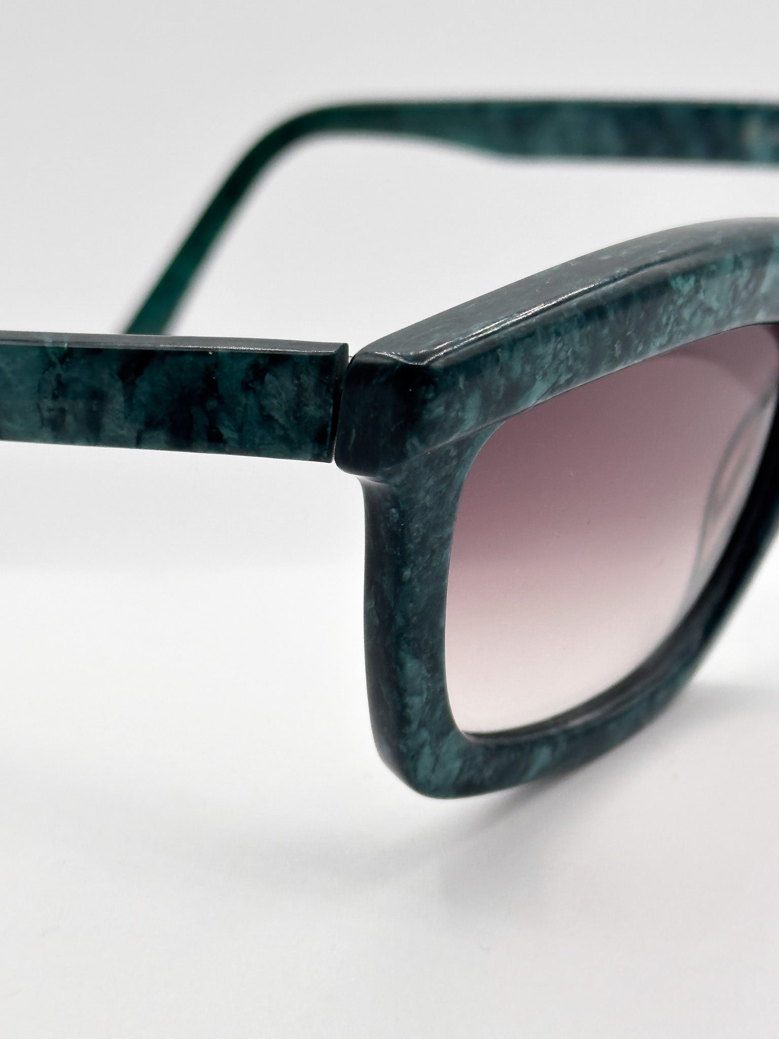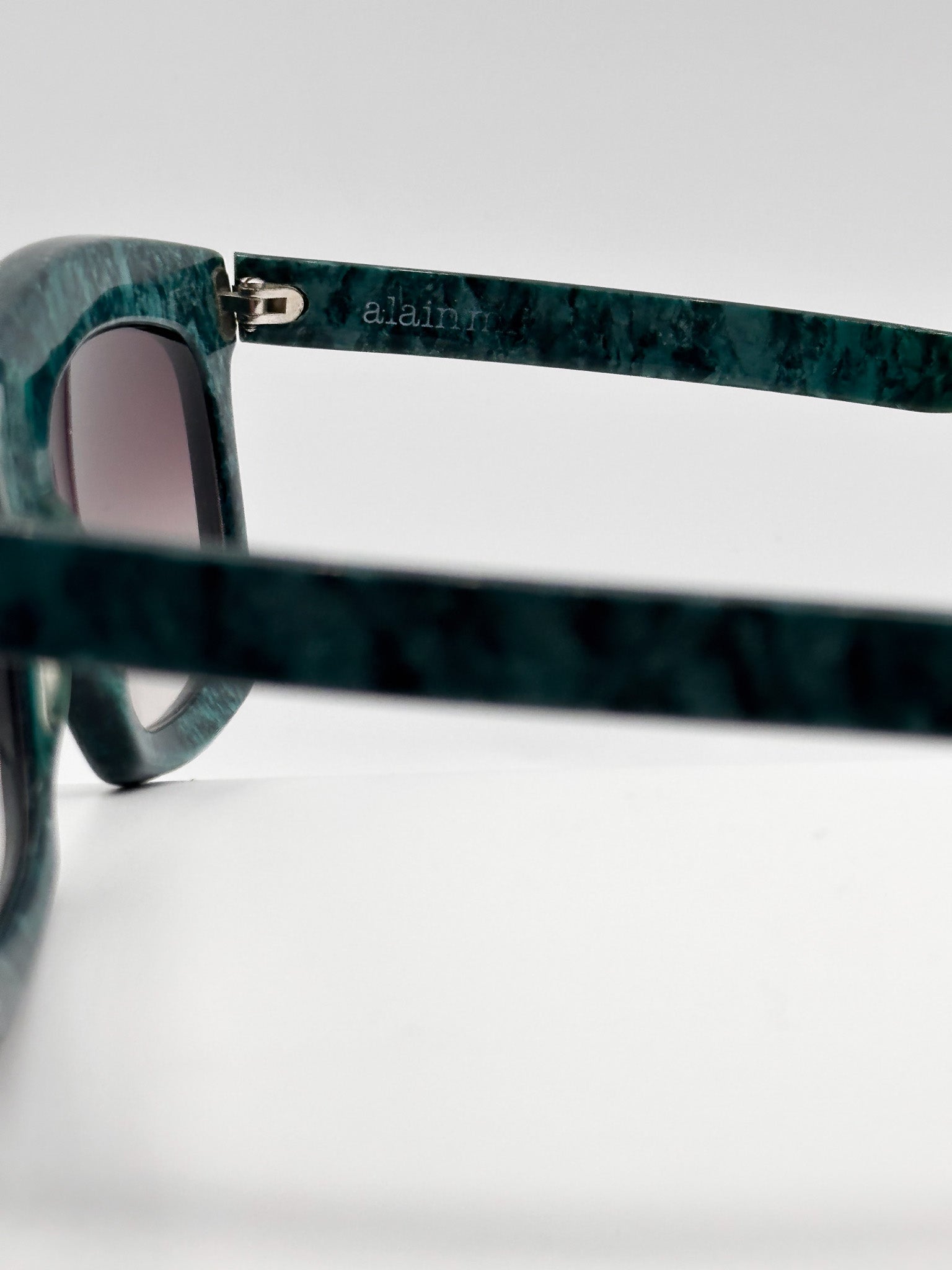 Alain Mikli 1980s green marble frame with a strong brow line and unique shape. Frame sits slightly elevated on face. Original black gradient lenses. Made in France.