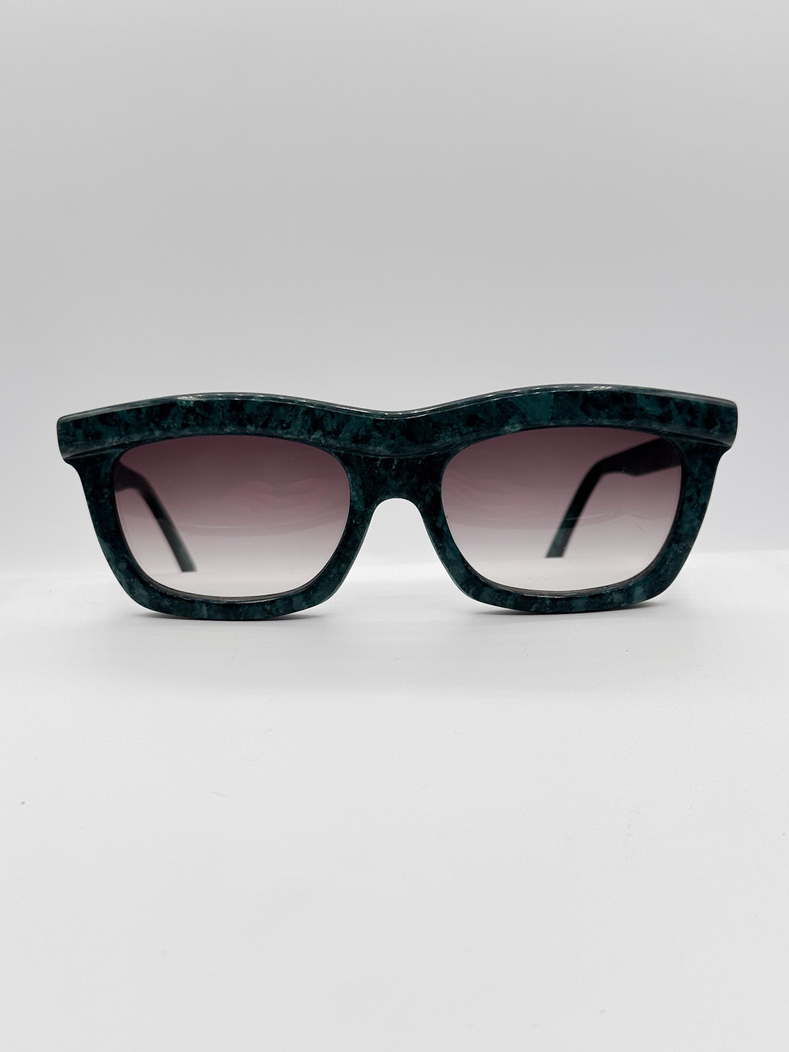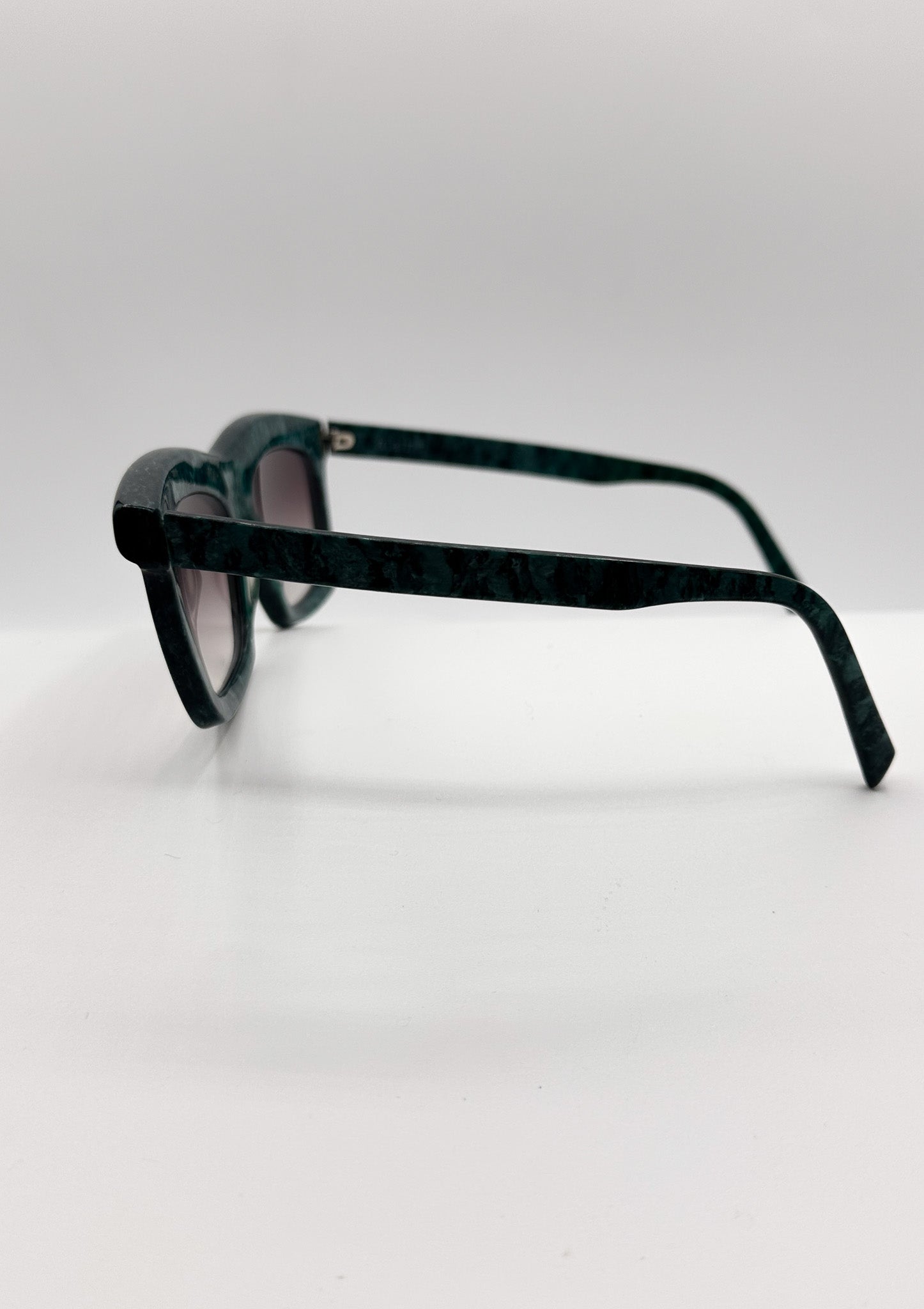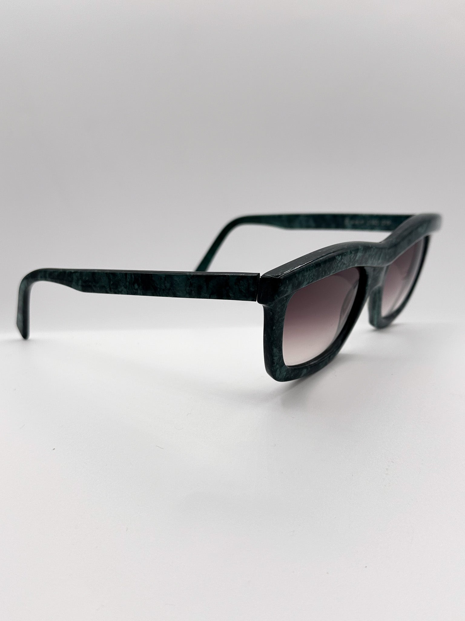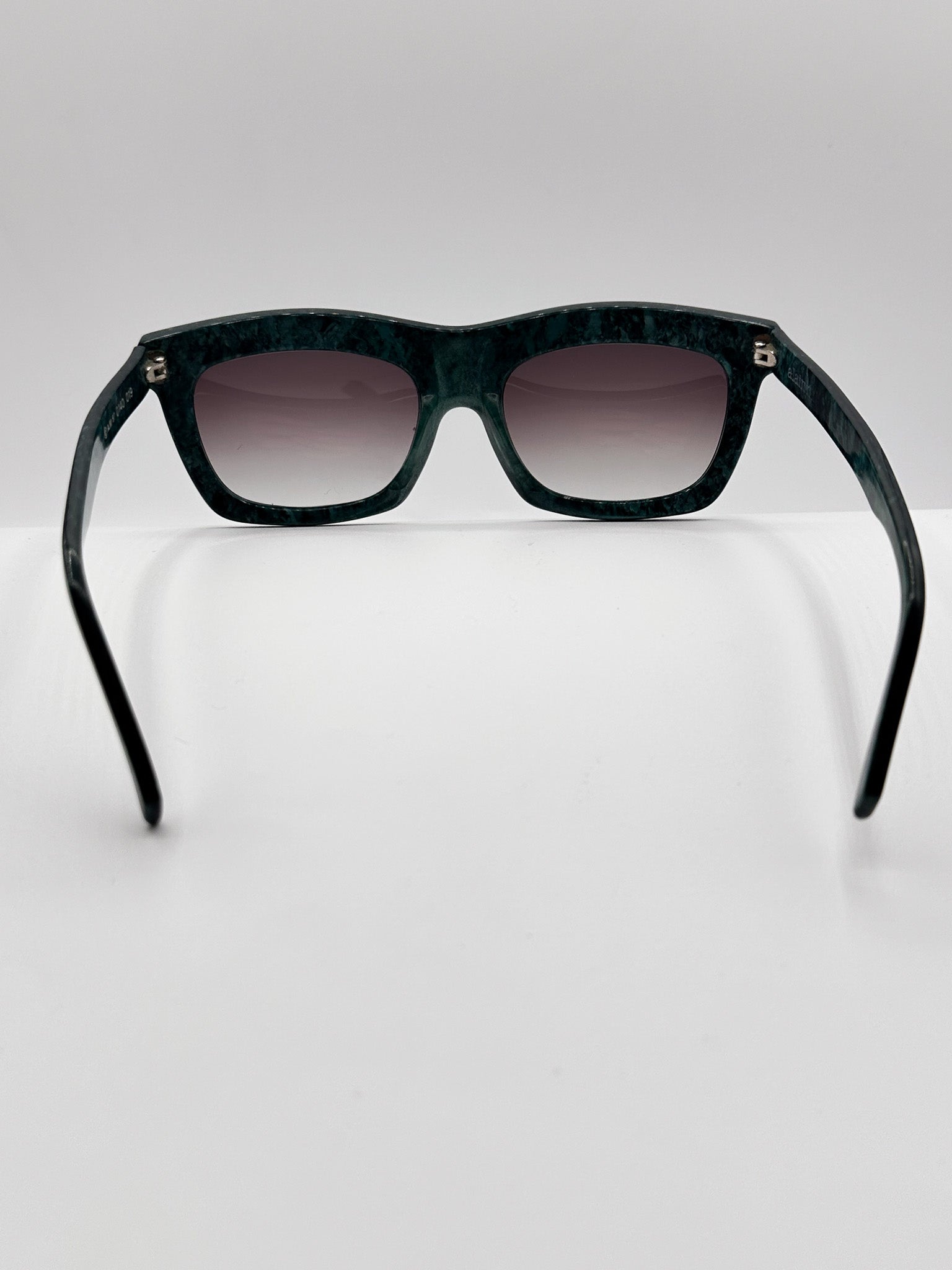 Alain Mikli 1980s green marble frame with a strong brow line and unique shape. Frame sits slightly elevated on face. Original black gradient lenses. Made in France.