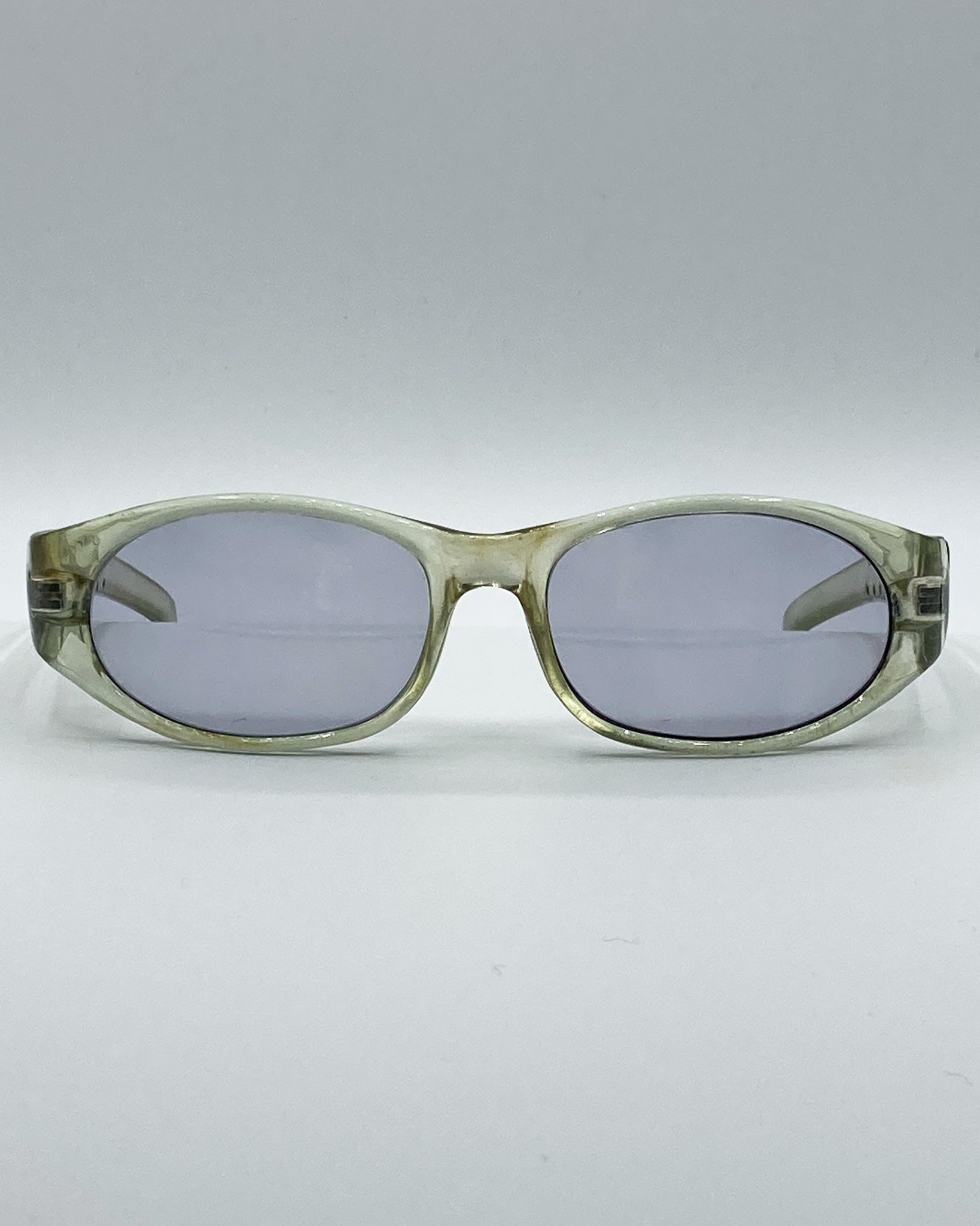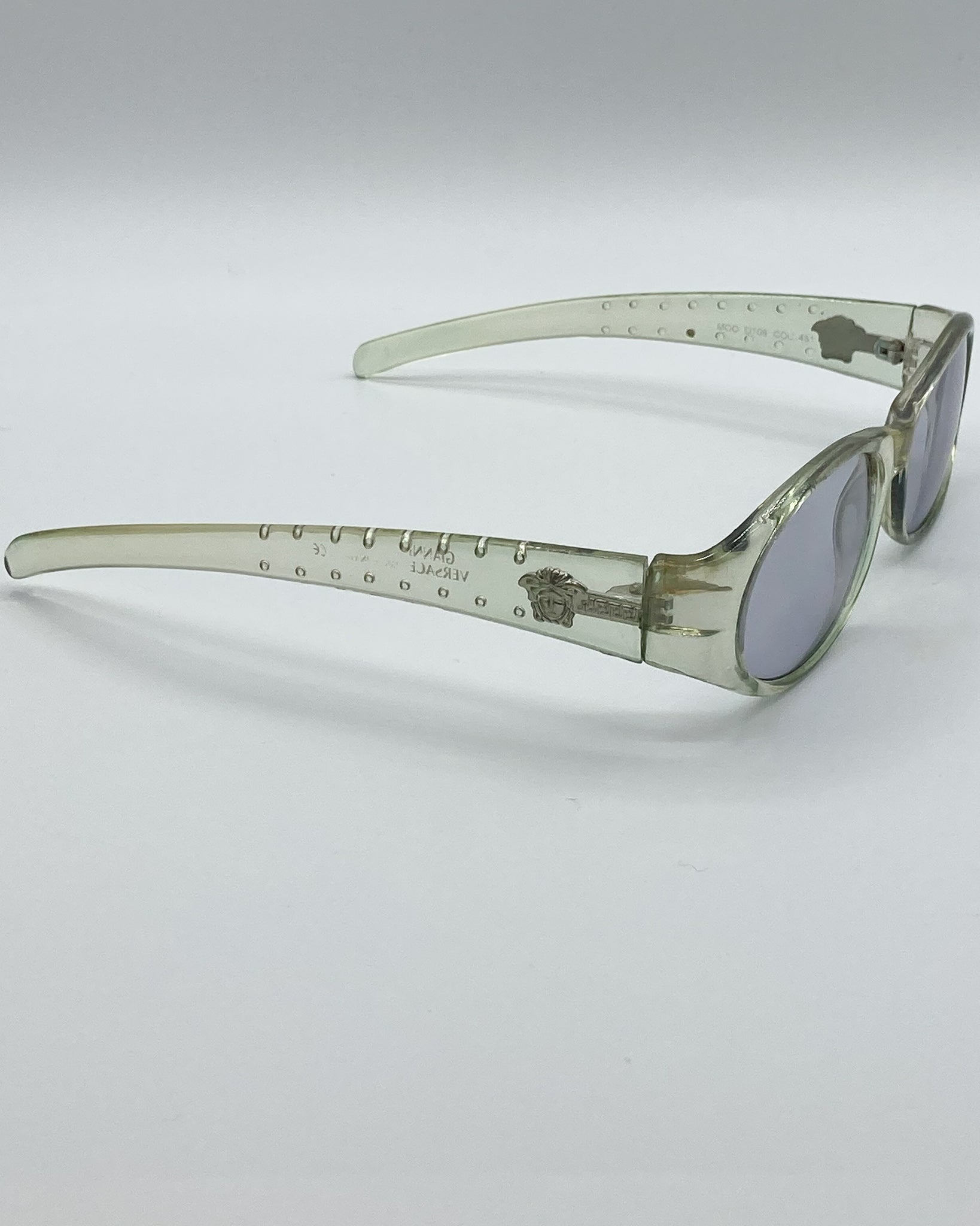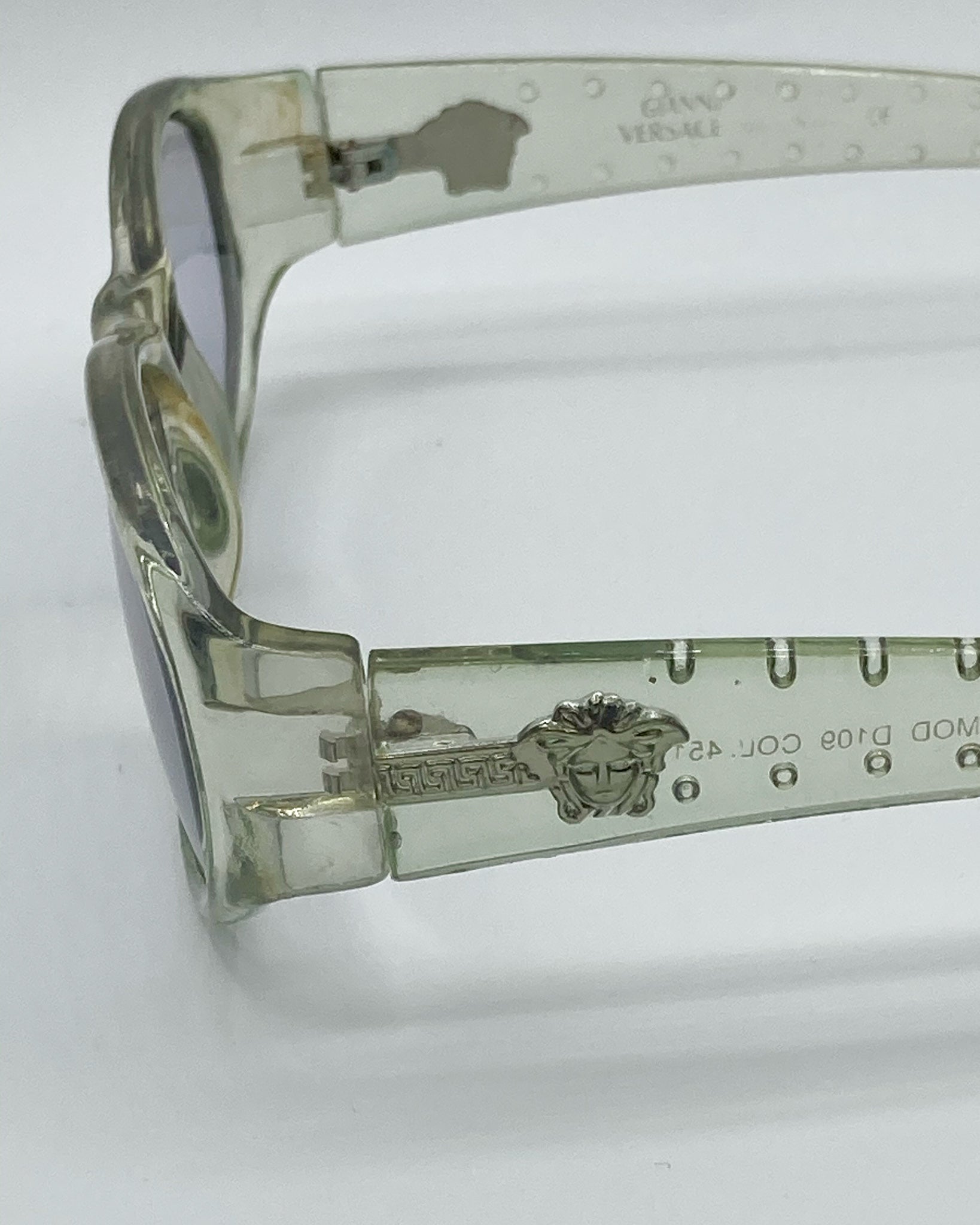 ORIGINALLY CRAFTED BY VERSACE IN ITALY IN THE LATE 80S/EARLY 90S, THESE CLEAR ACETATE FRAMES HAVE A MEDUSA SILVER PATTERN NESTLING THE EAR BRIDGE.