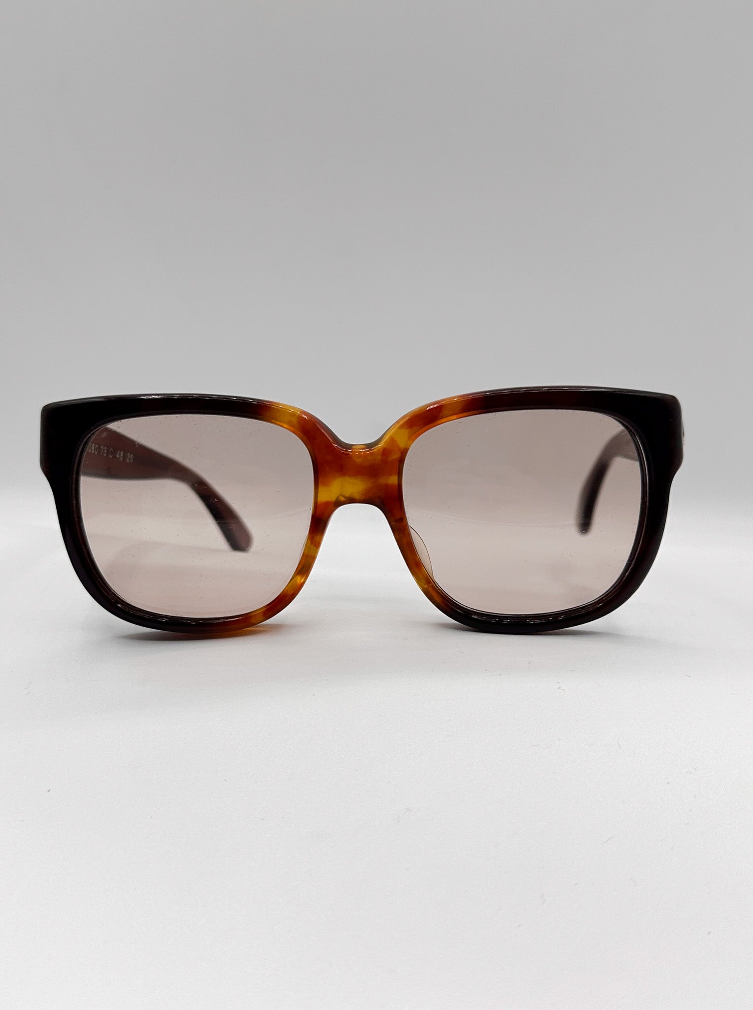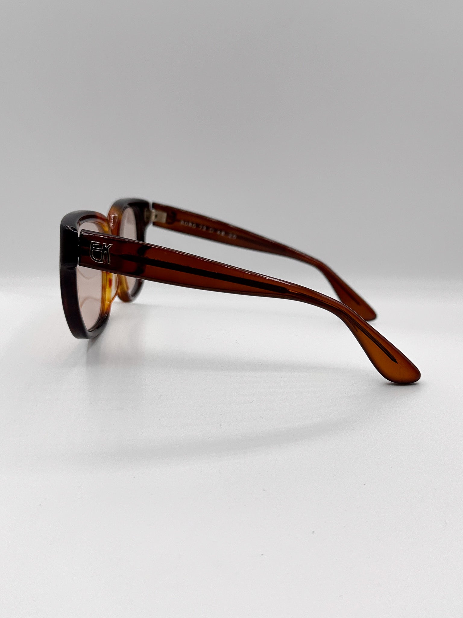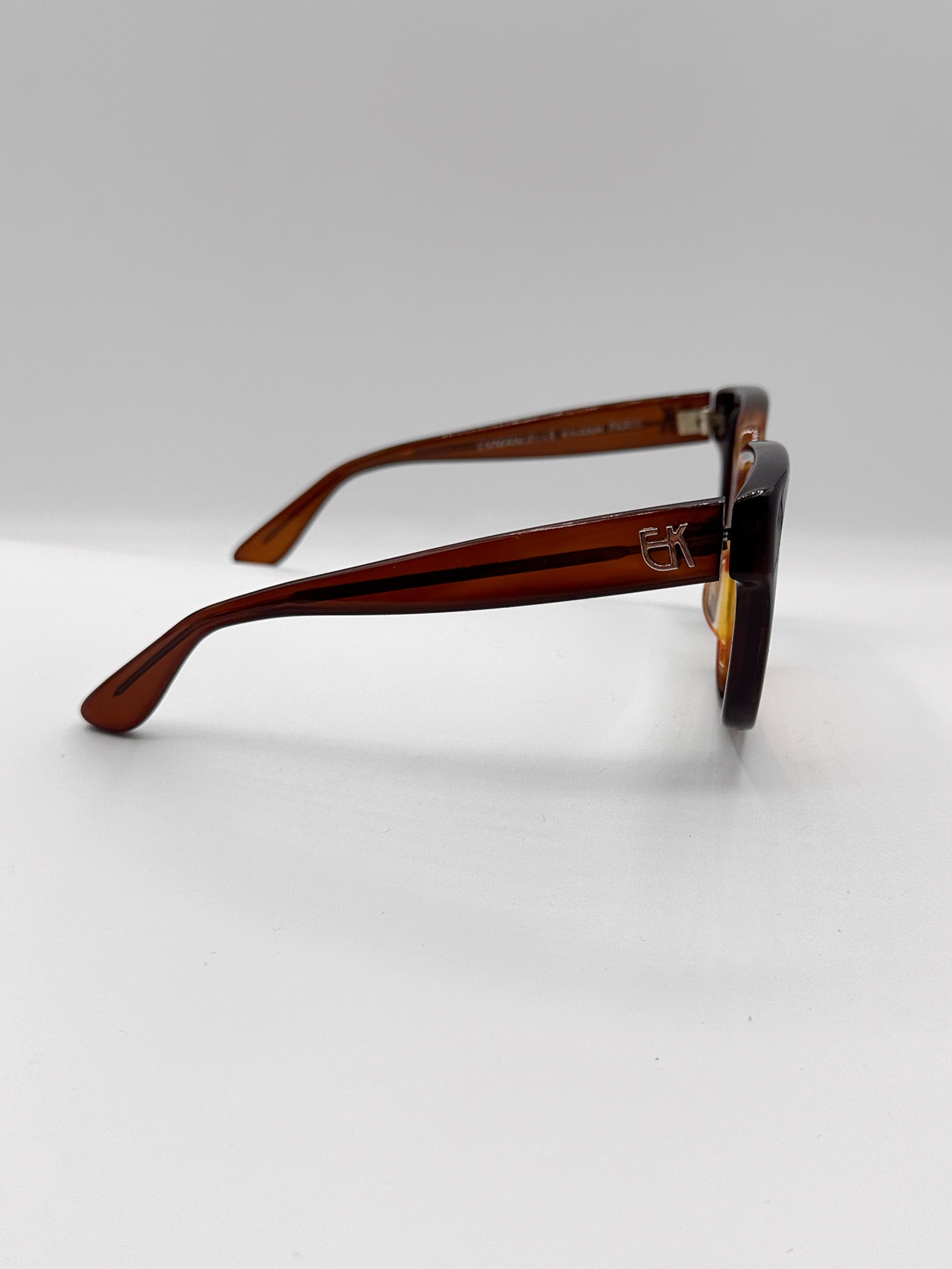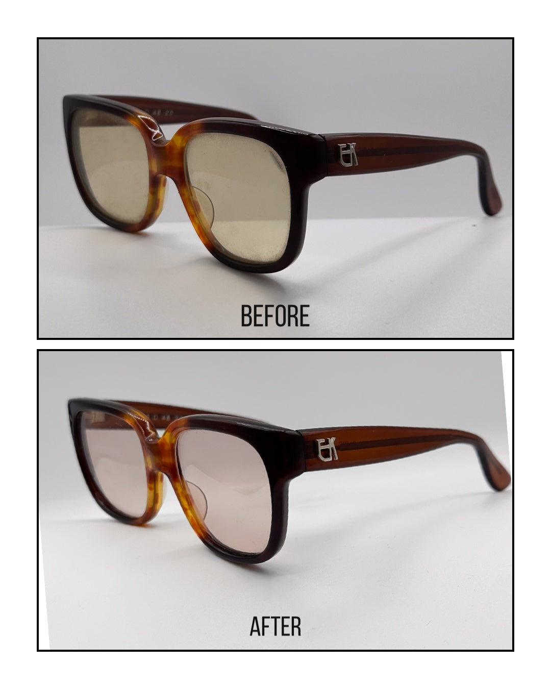 We cleaned them up and replaced the lenses with a light brown lens. These frames are a bit small, we suggest a more narrow face for them to fit correctly.