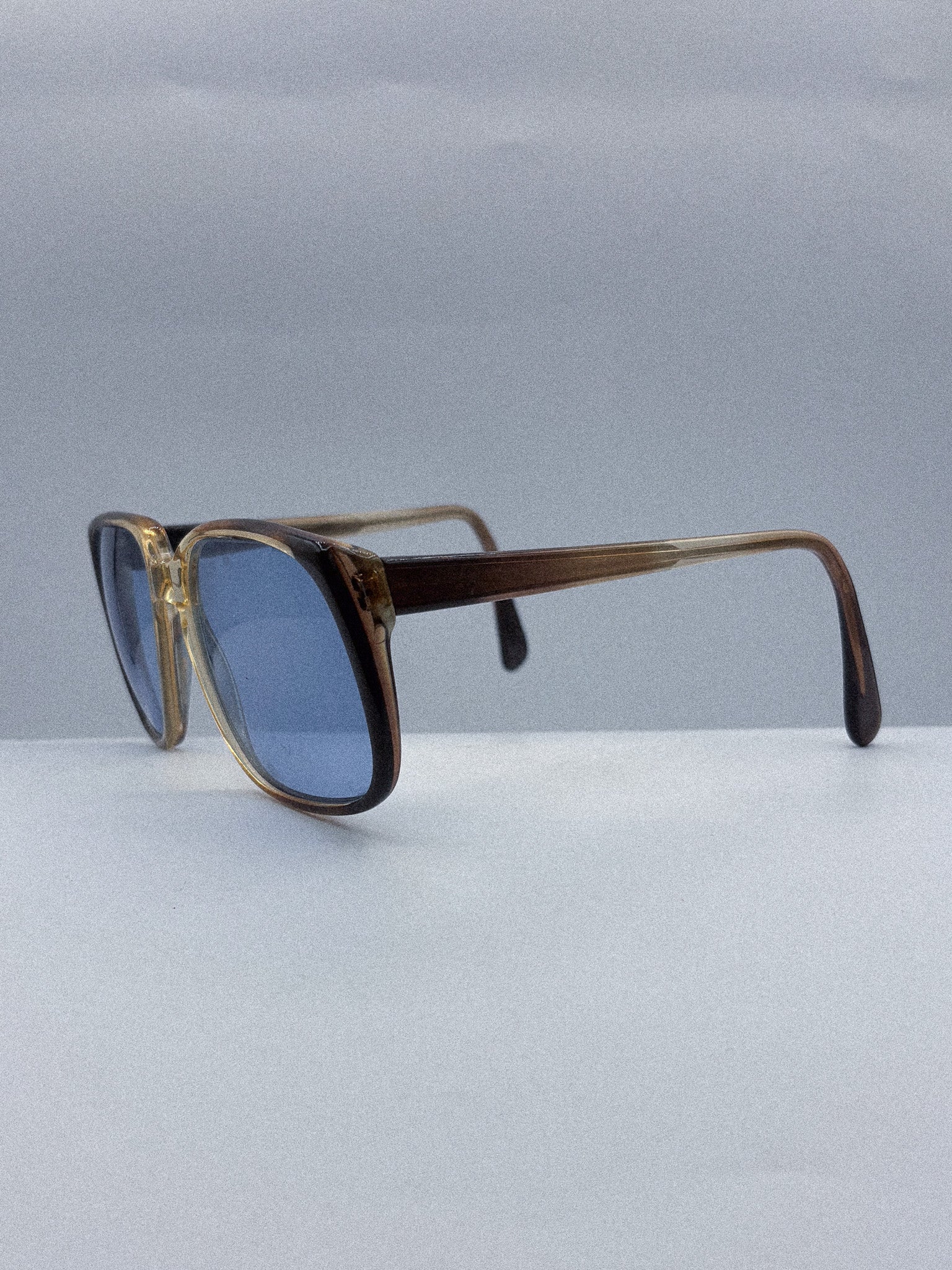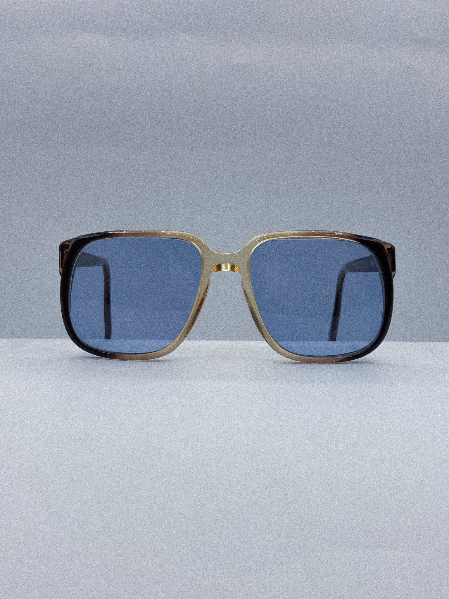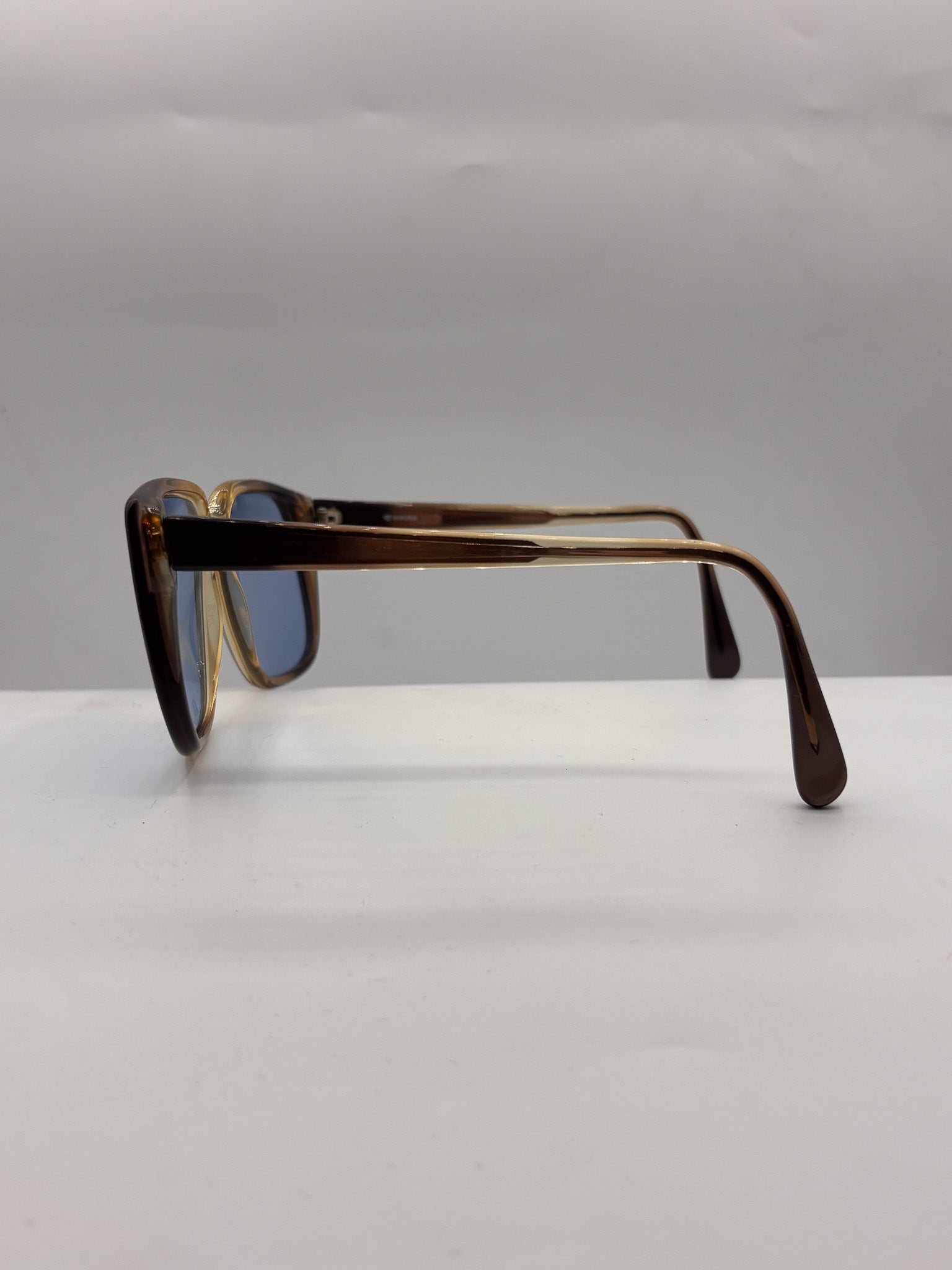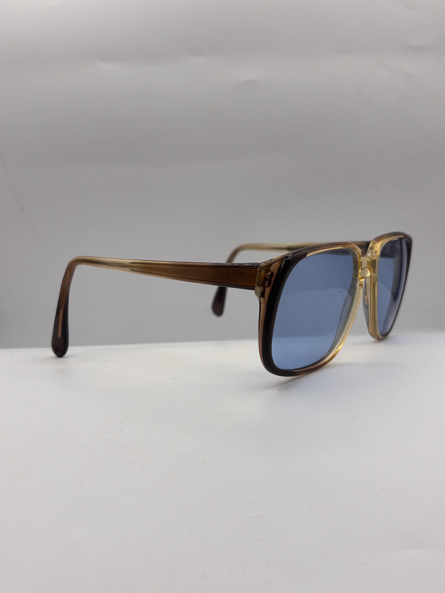 These vintage handmade sunglasses from the 1960s are a quiet force of style, merging geometric boldness with minimalist restraint. The square silhouette is sharply defined by a gold-accented bridge and a deep ombré frame that shifts from warm honey to rich brown—striking from every angle.
