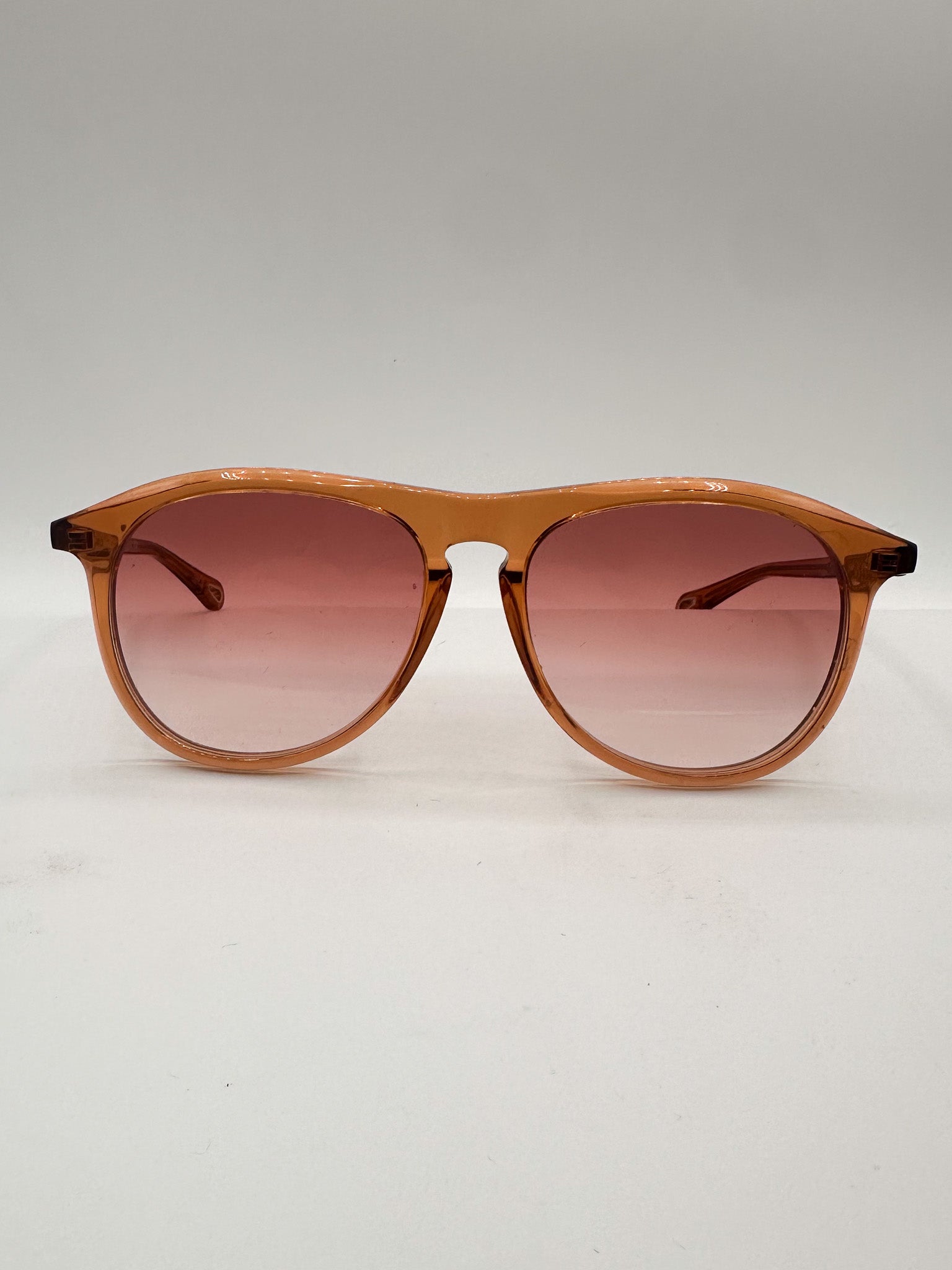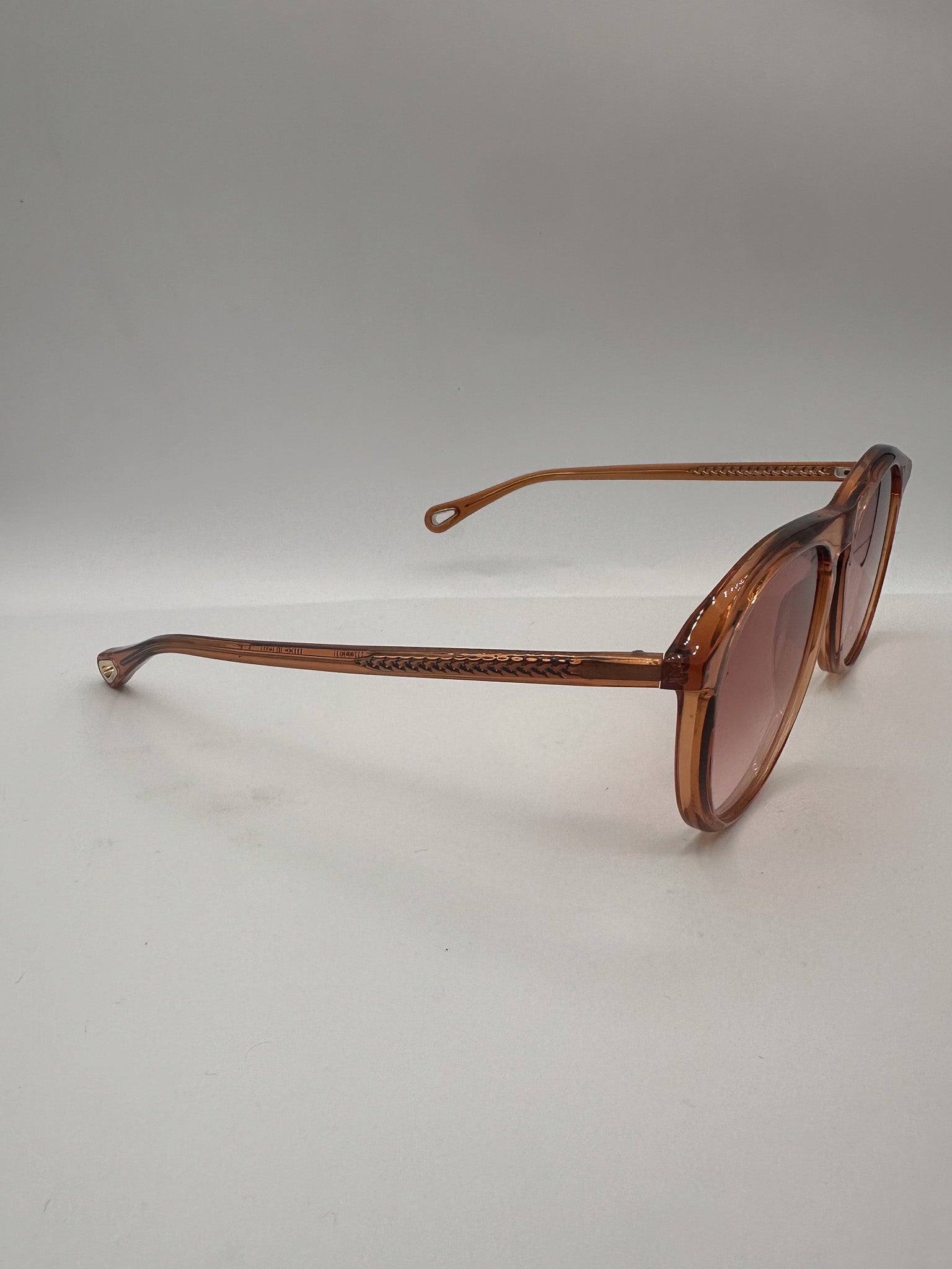 Alas! A pink frame from temple to lens. This bio-based acetate frame made by Chloe is dainty and soft on the eyes for men or women. A round frame with accent horn-rimmed corners. Gradient UV-protected lenses.