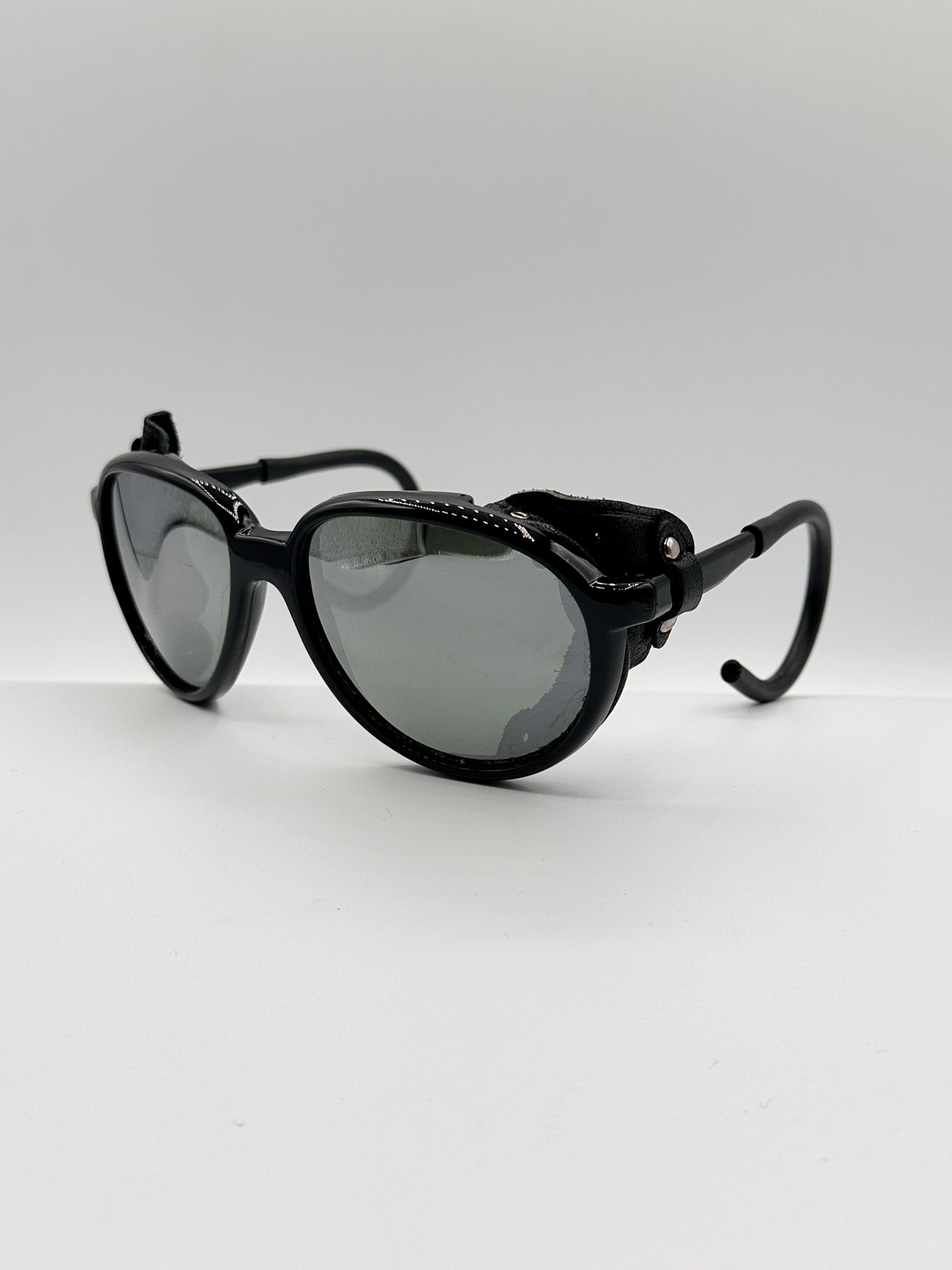 Glacier style glasses. Aviator frames with black leather wind-blocking sides. Wrap-around ear pieces to ensure maximum protection.