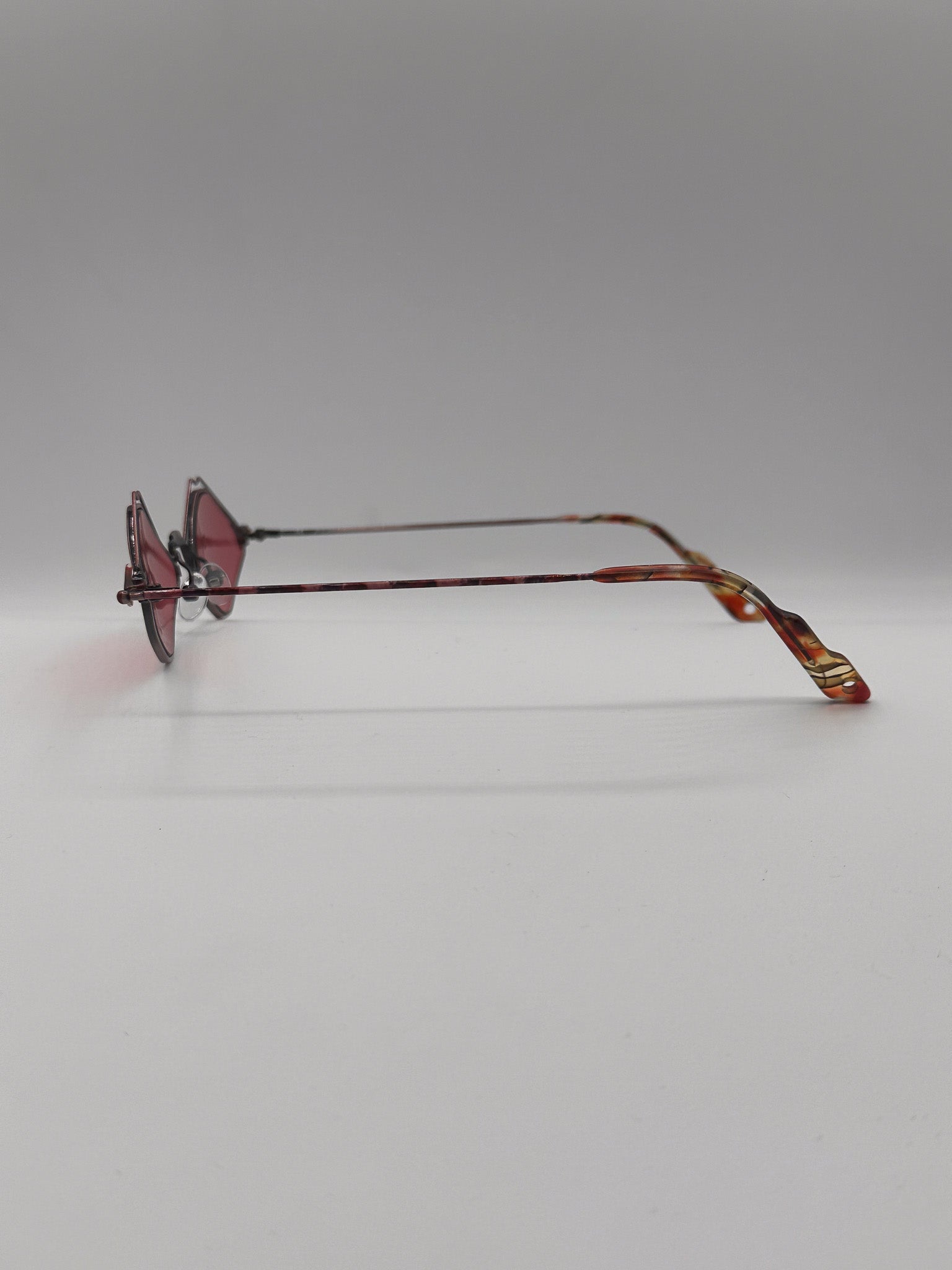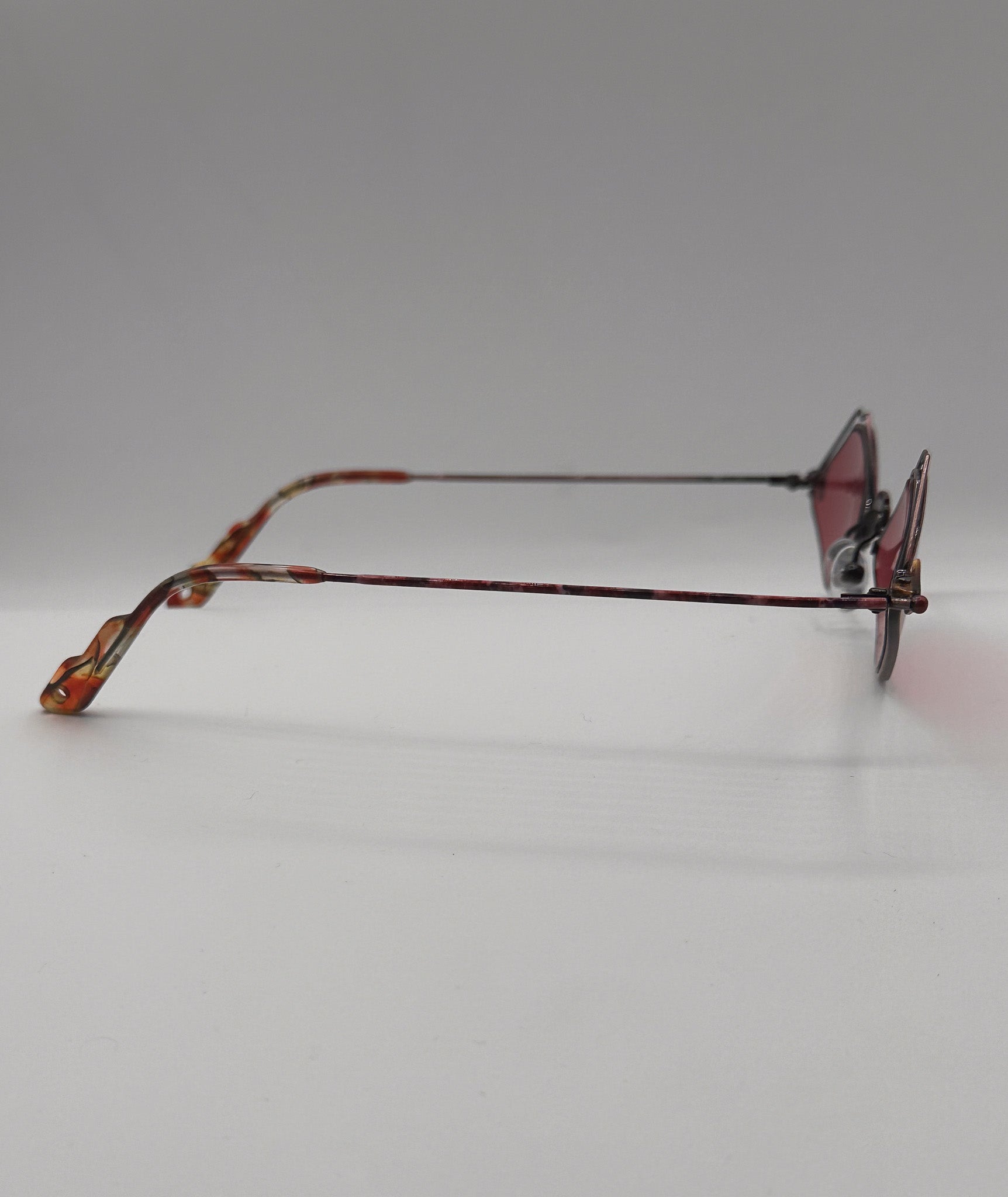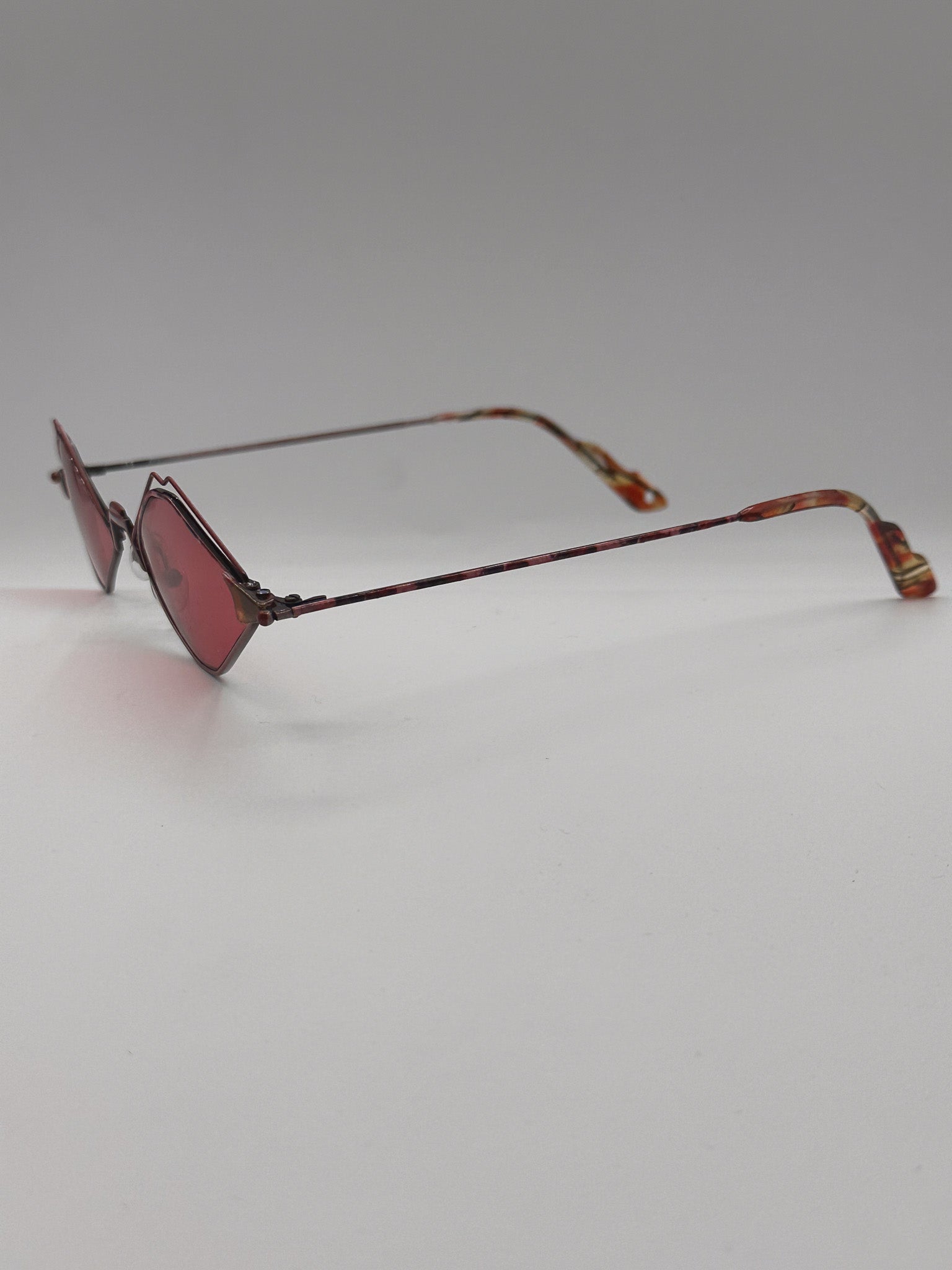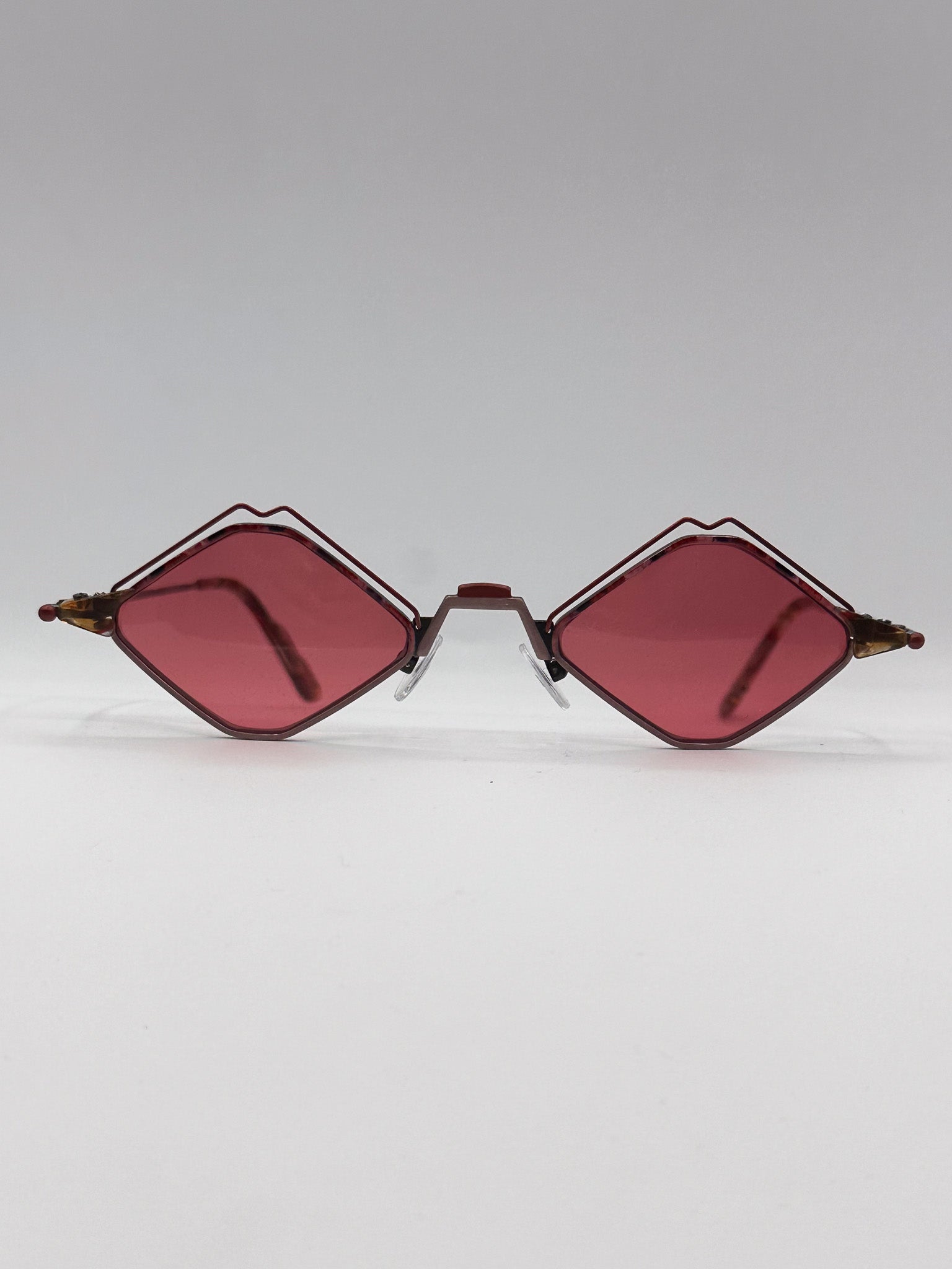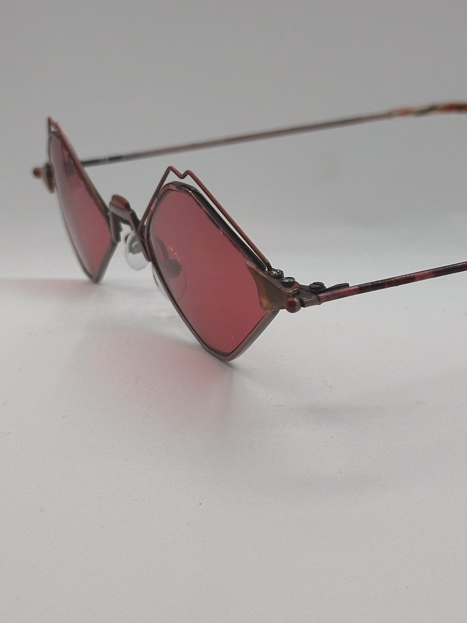 Diamond-shaped eyeglass frames with unique pattern above each eye. Colorful pattern throughout with neutral shades of red, yellow and blue. Floating nose bridge with plastic pads. We added maroon lenses in this little beauties. We find this shapes resembles lips a bit. Made in Germany.
