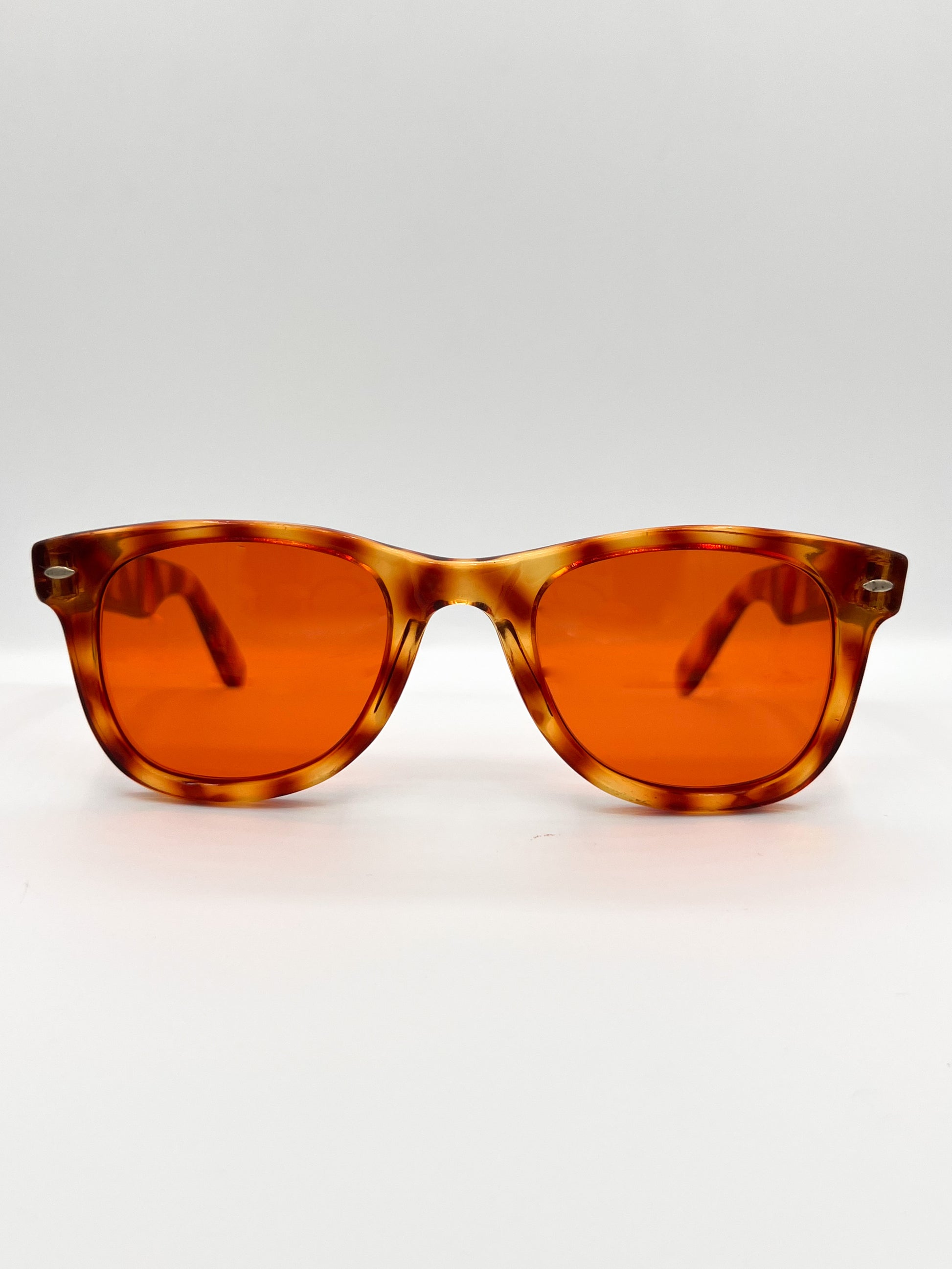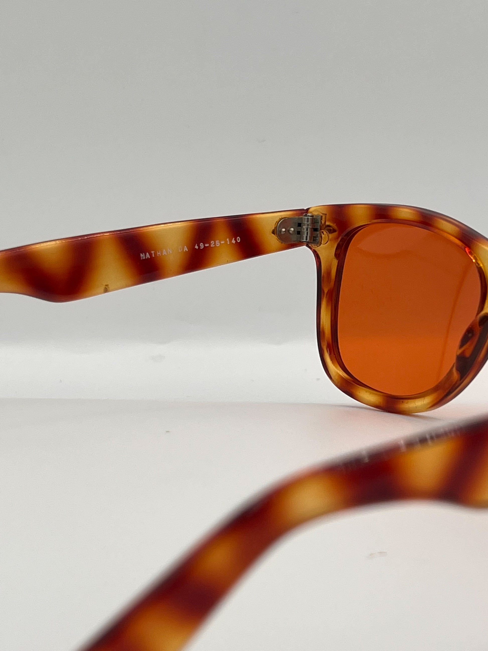 Speckled tortoise style wayfarer frame remodeled with orange lenses. Handmade in France in the 1980s.