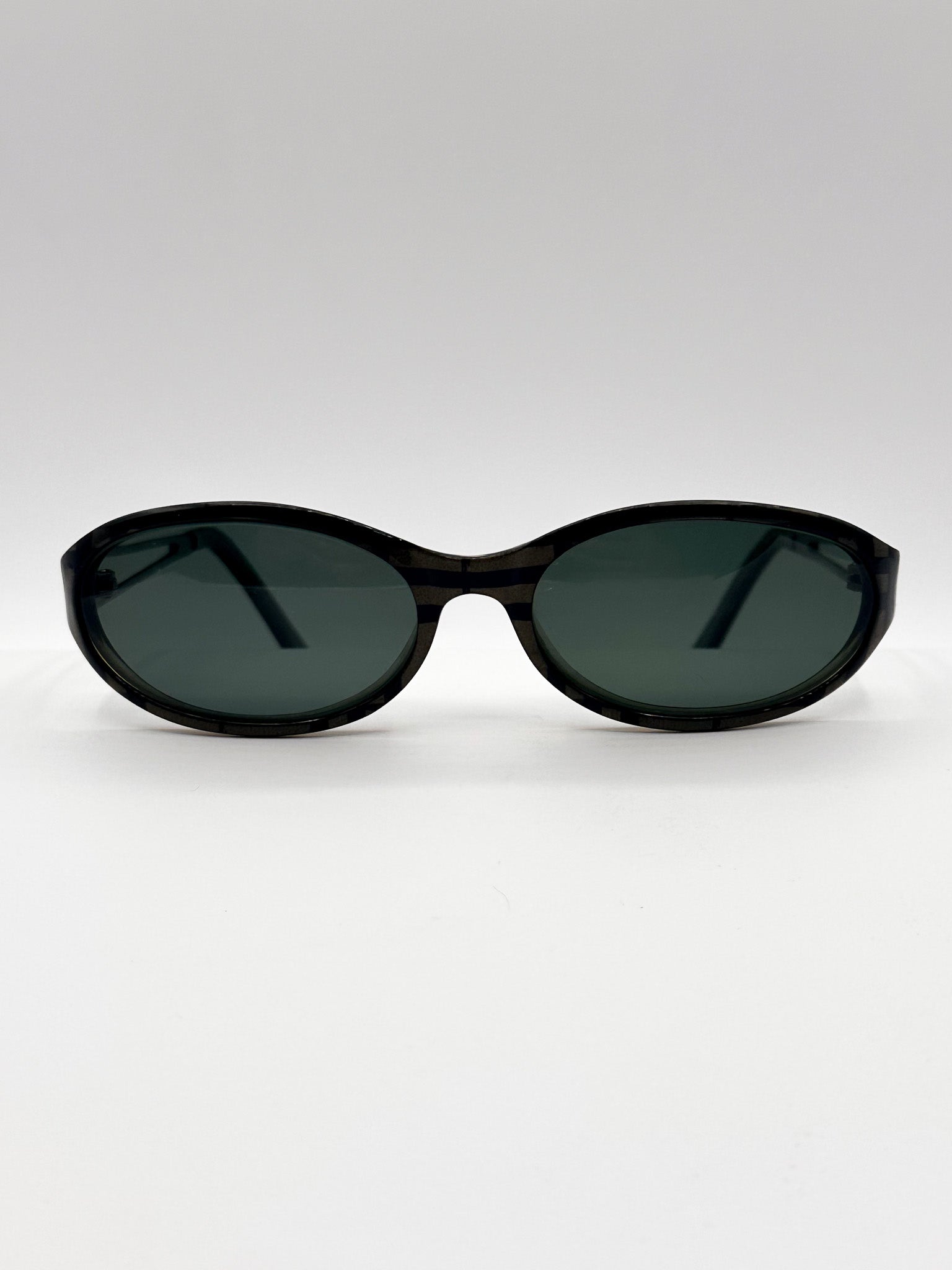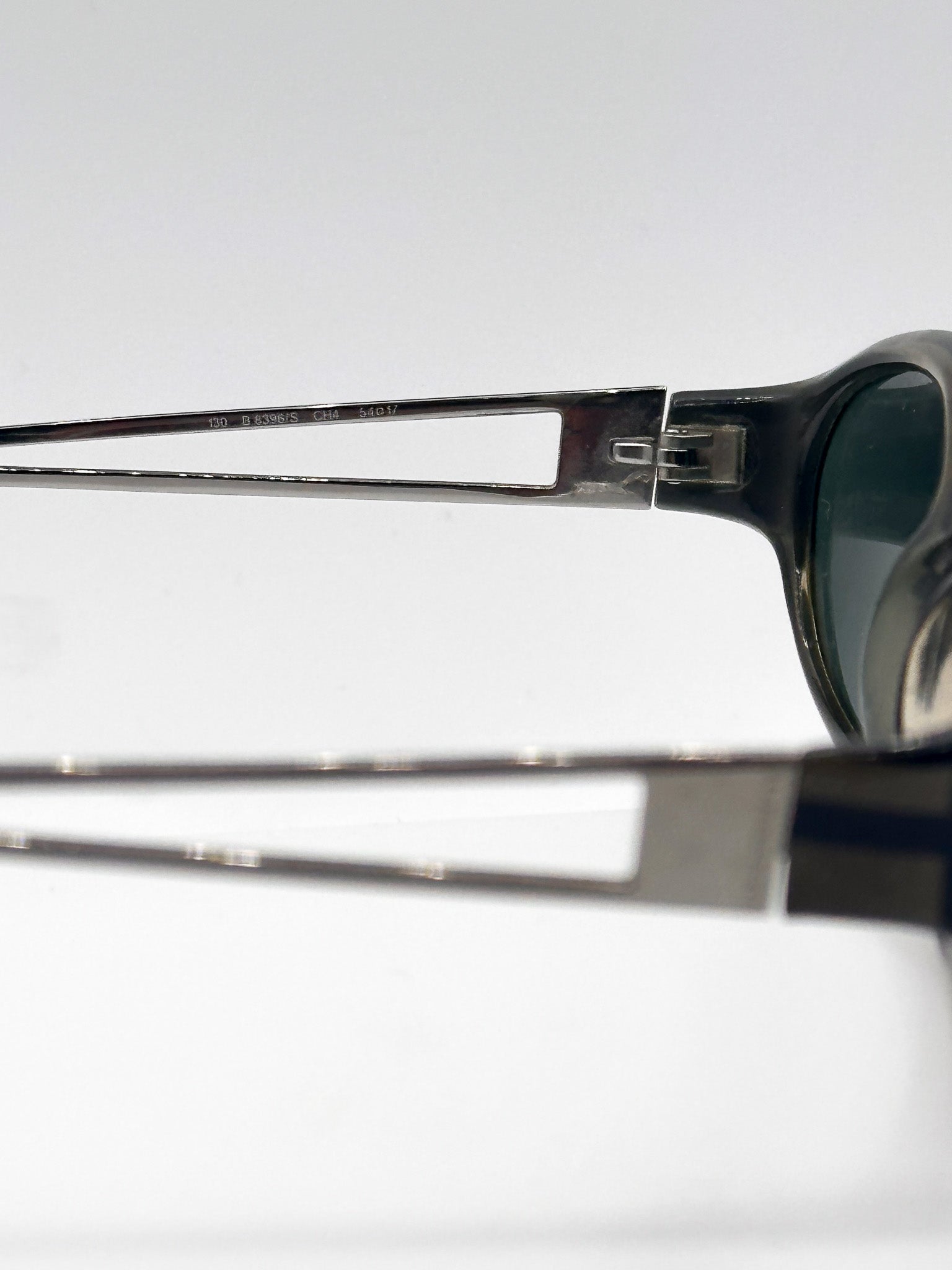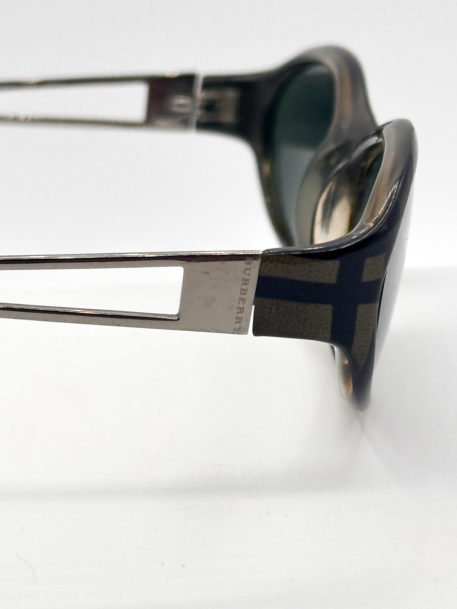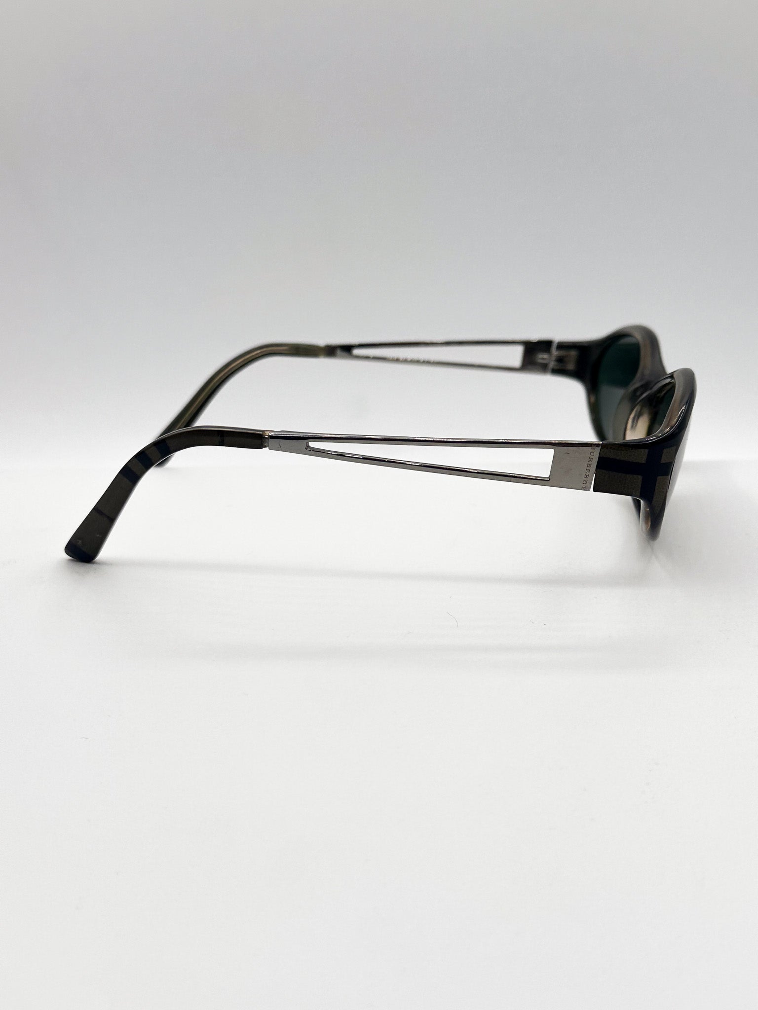 Classic Burberry novacheck pattern with a darker take on the. Black and grey make for a subtle design on this small oval acetate frame, complete with new grey polarized lenses.