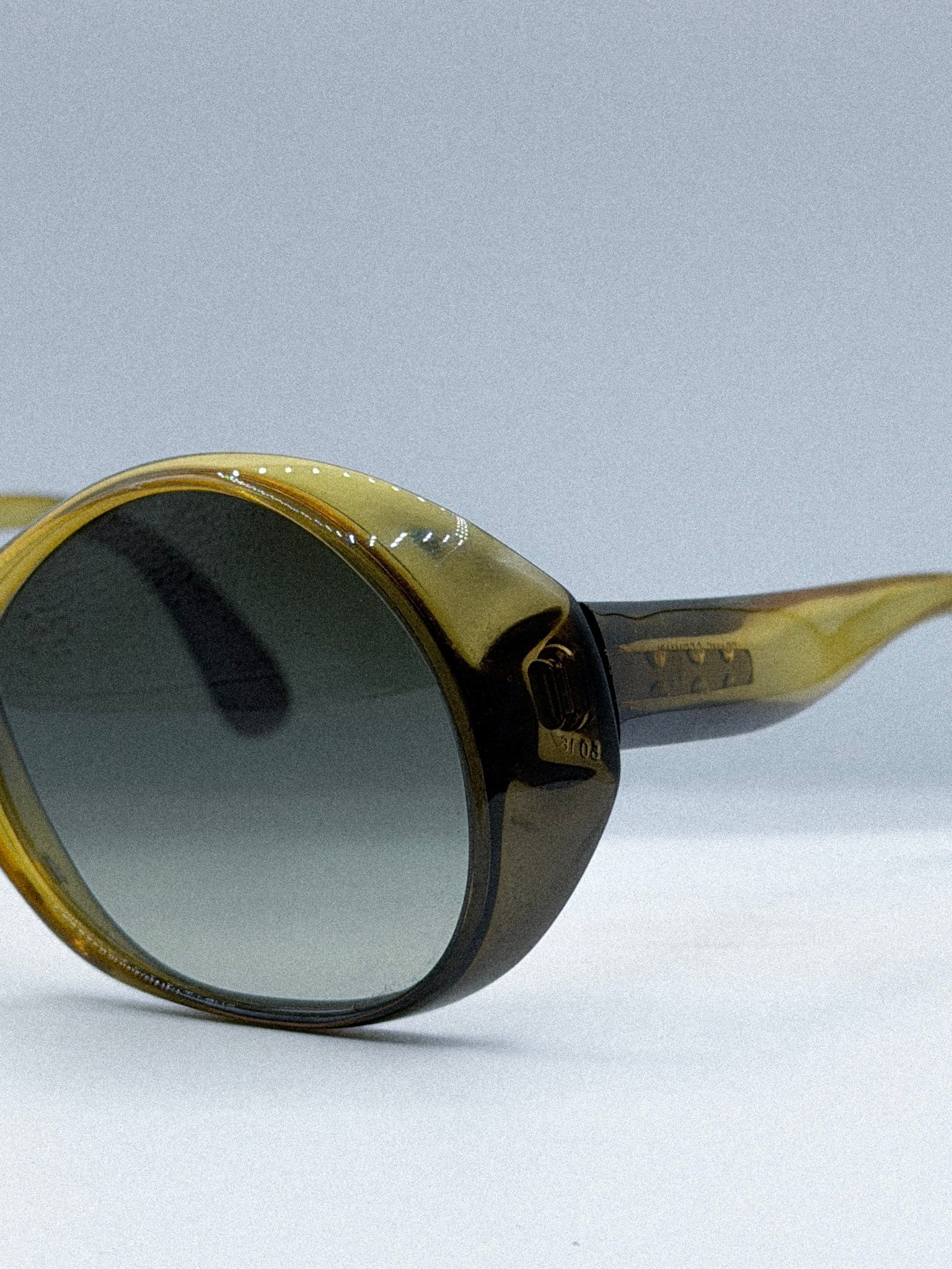 An unapologetic ode to 1980s glamour, these Playboy sunglasses embrace volume and attitude. The oversized plastic frame flows in a sculpted oval silhouette, rendered in a warm olive tone that melts into deep green lenses. Bold yet fluid, it feels cinematic, like golden hour light caught in glossy resin.