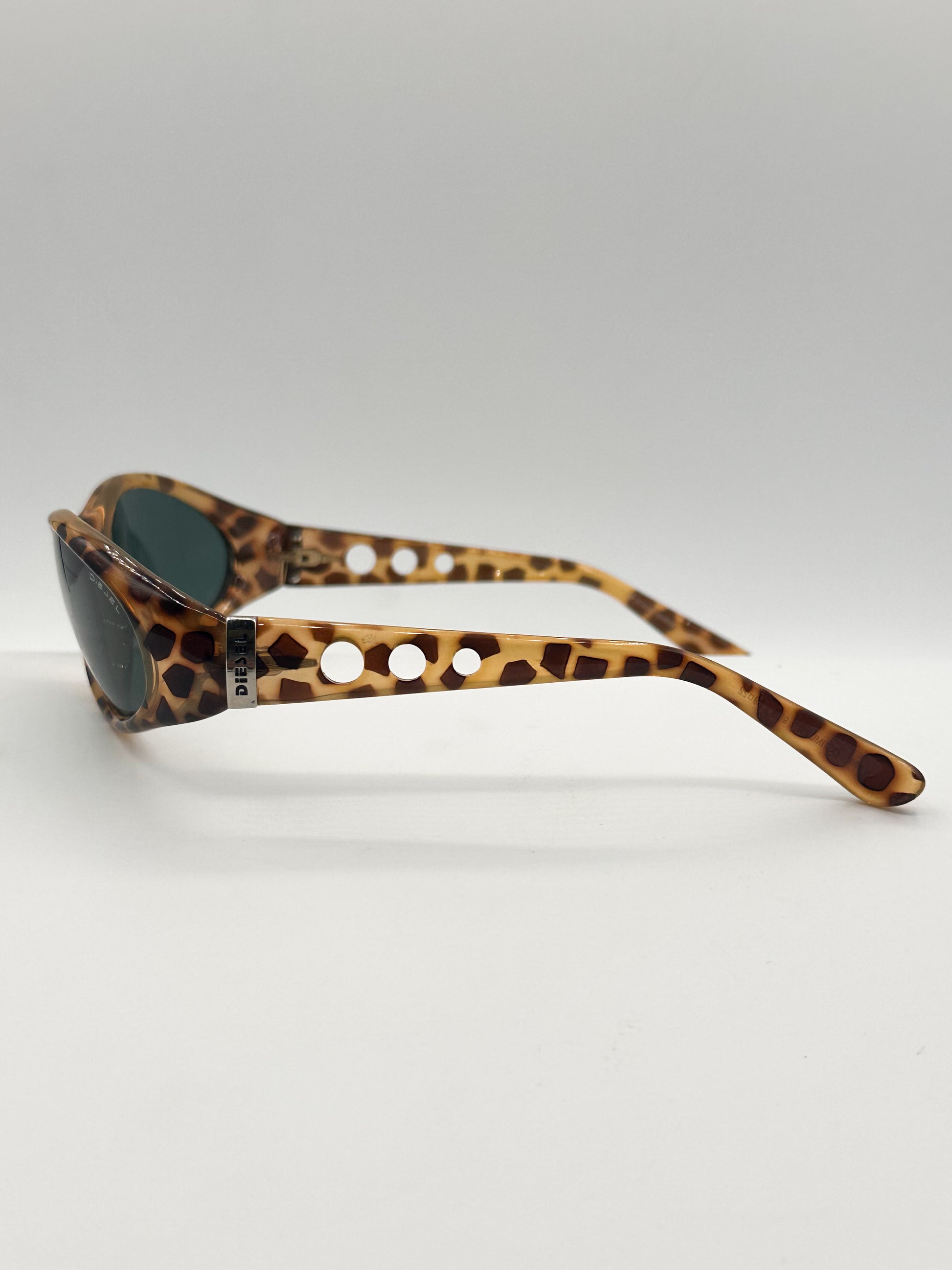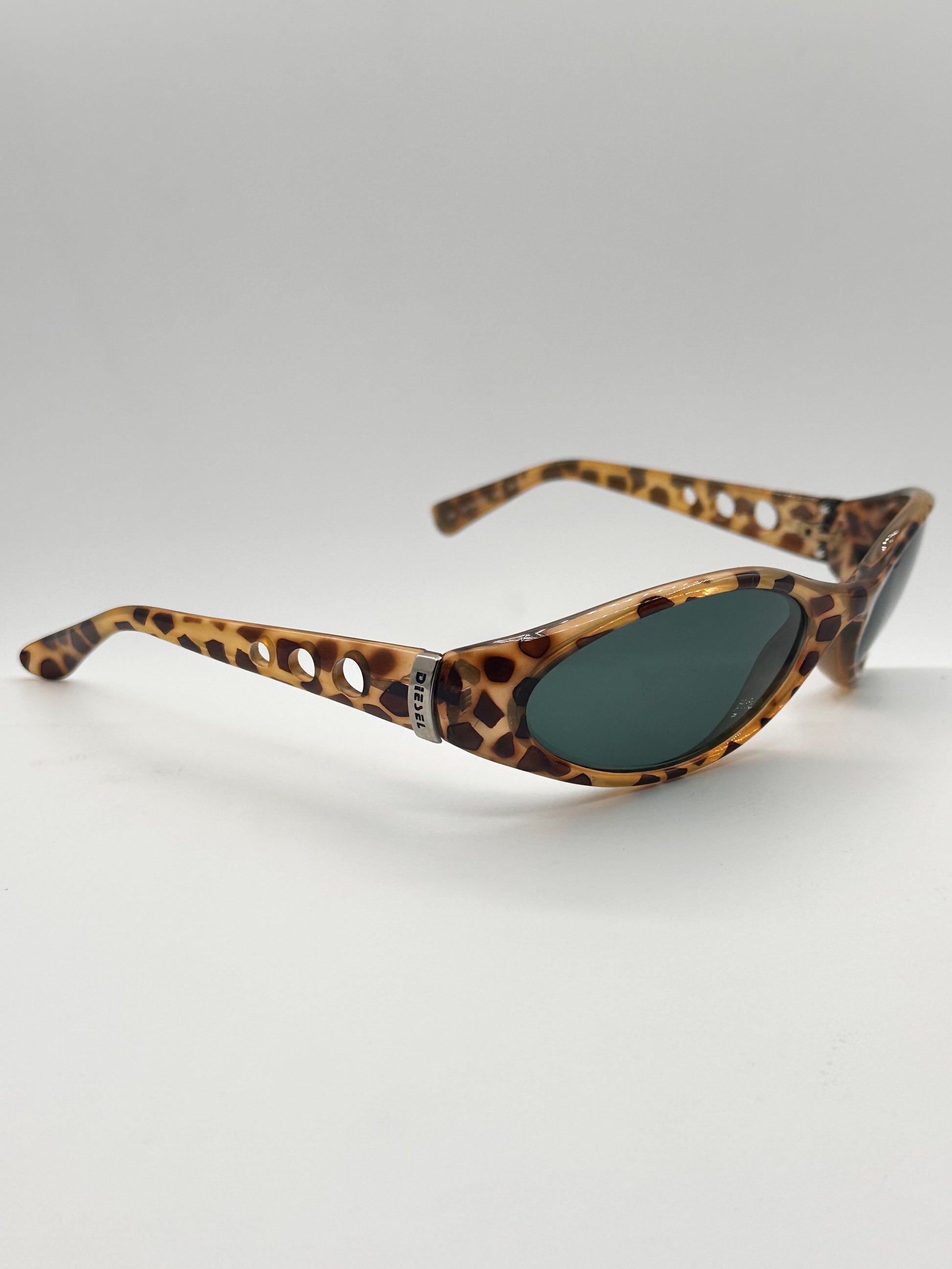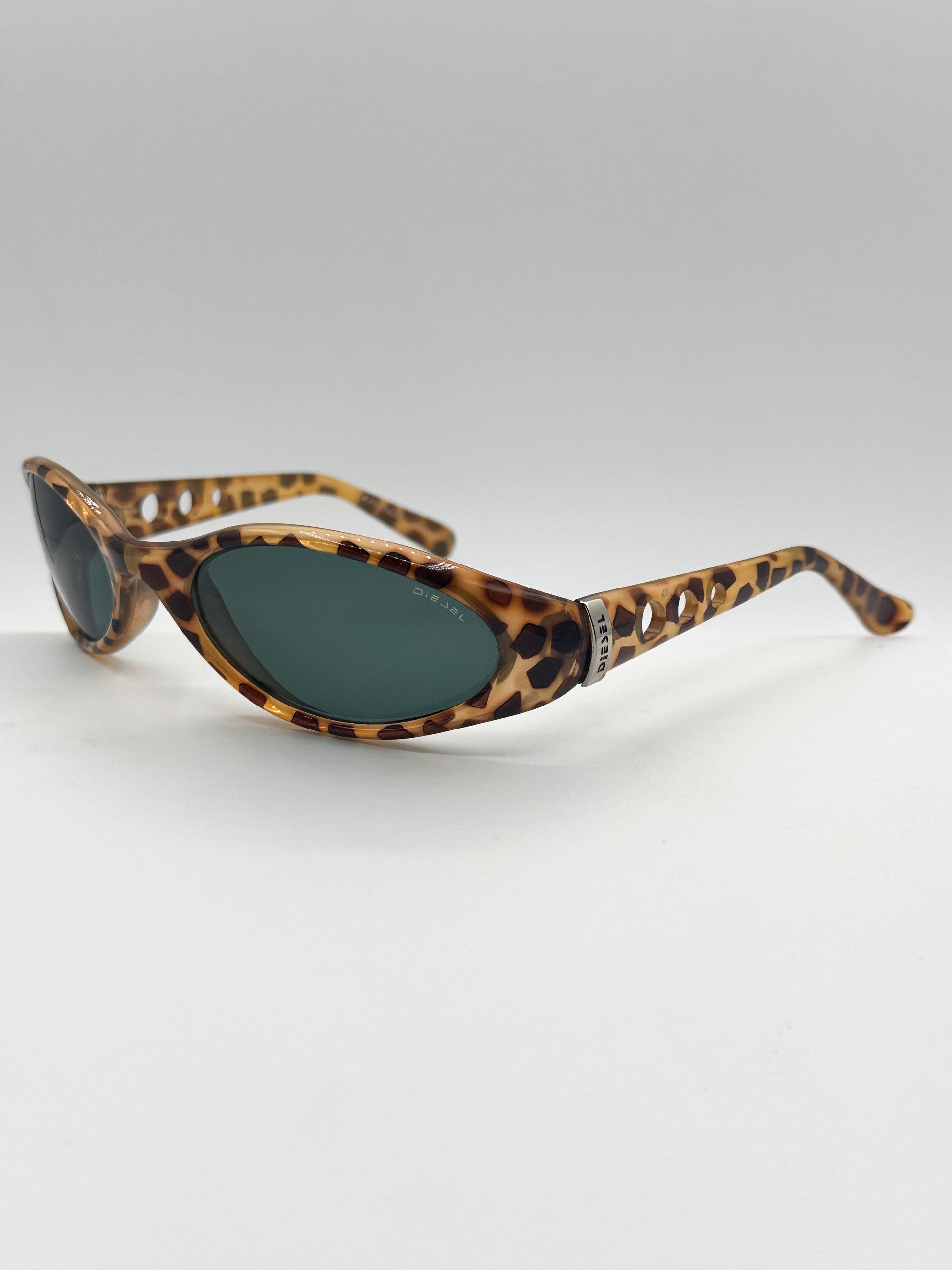 Diesel leopard oval frame from the 1990s with polarized lenses. Unique wrap-around shape that sits low on nose. Metal “Diesel” detail at each ear piece. Made in Italy.