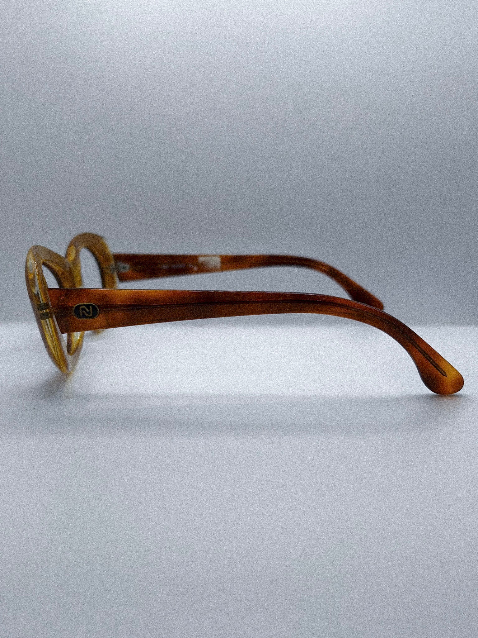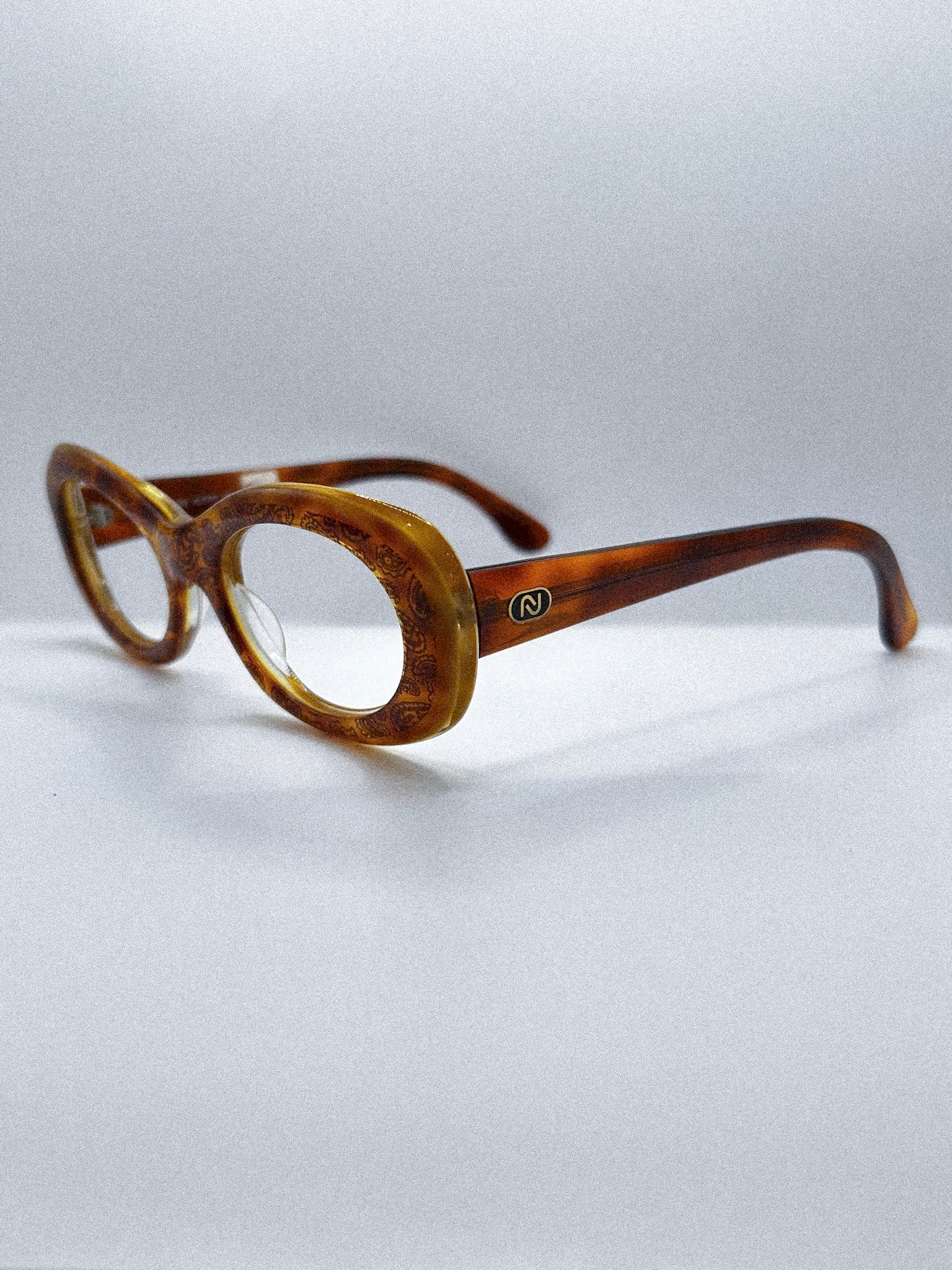 These 1990s Nouvelle Vague frames embrace a bold, artistic spirit with their sculptural oval silhouette and richly patterned brown paisley acetate. The design curves fluidly across the brow, creating an almost mask-like form that feels theatrical yet thoughtfully composed.