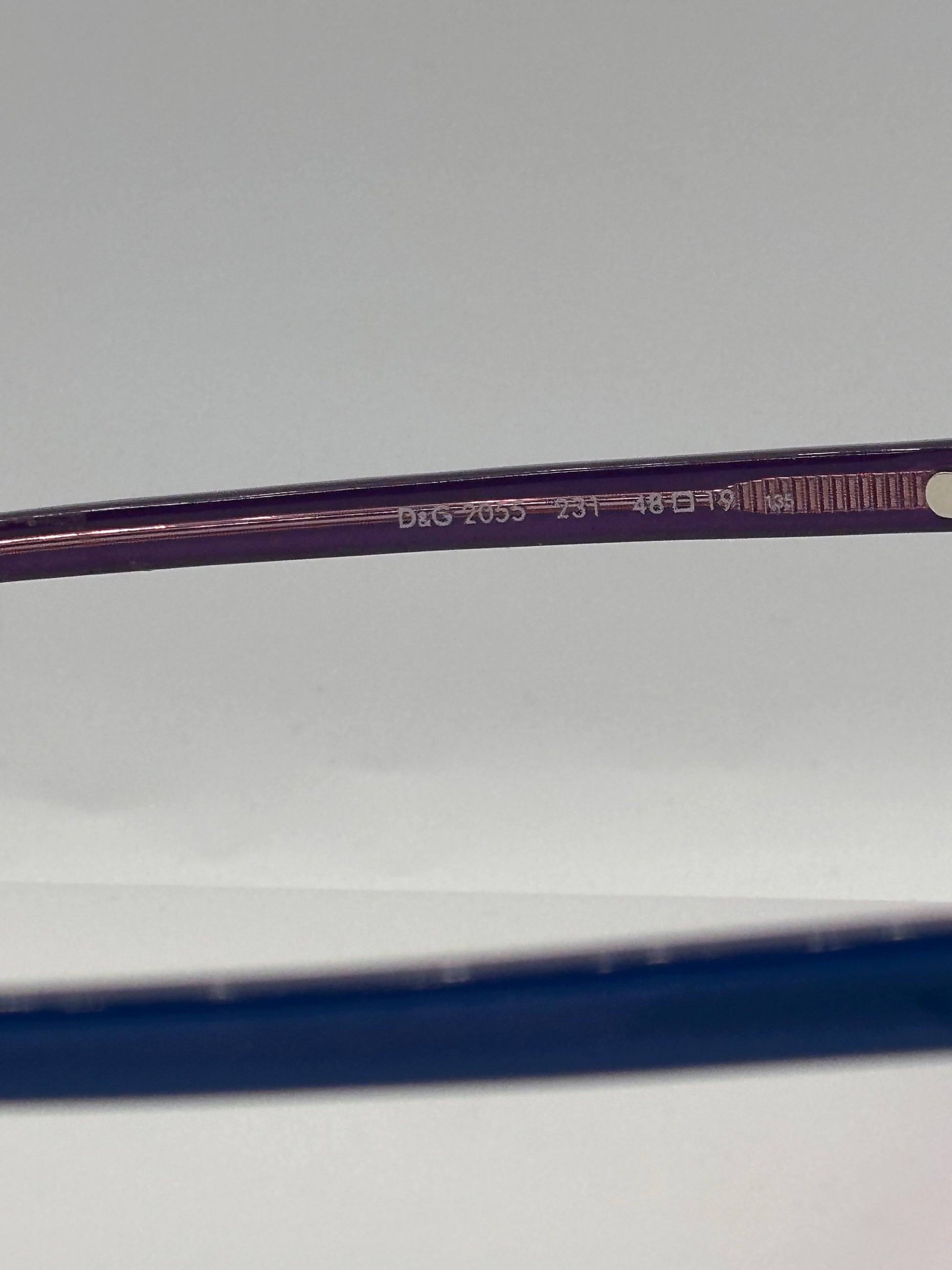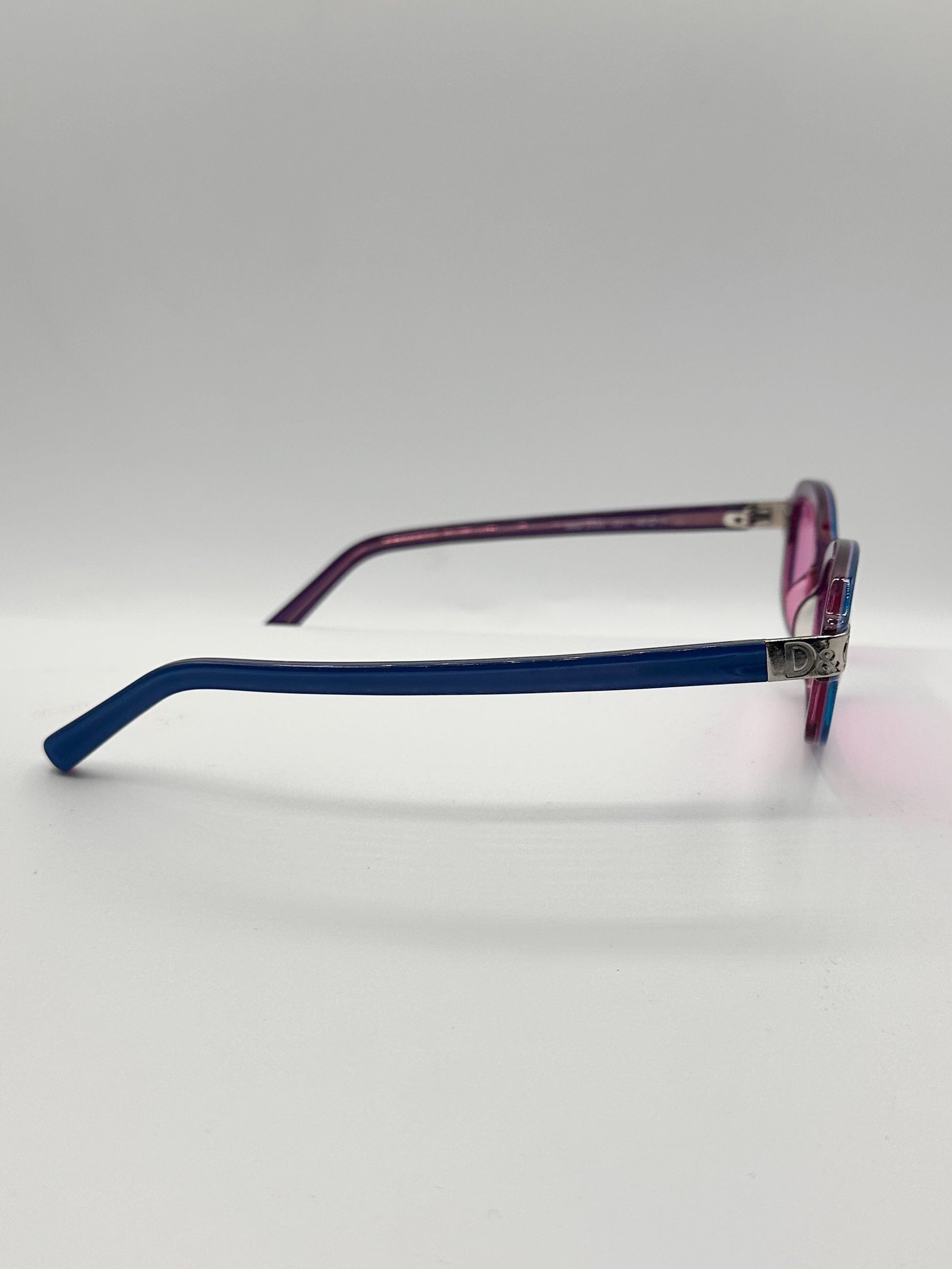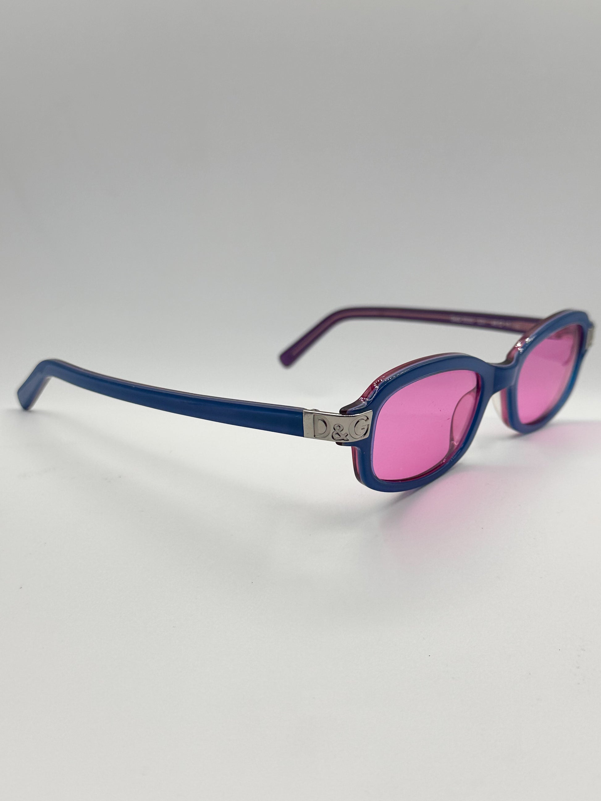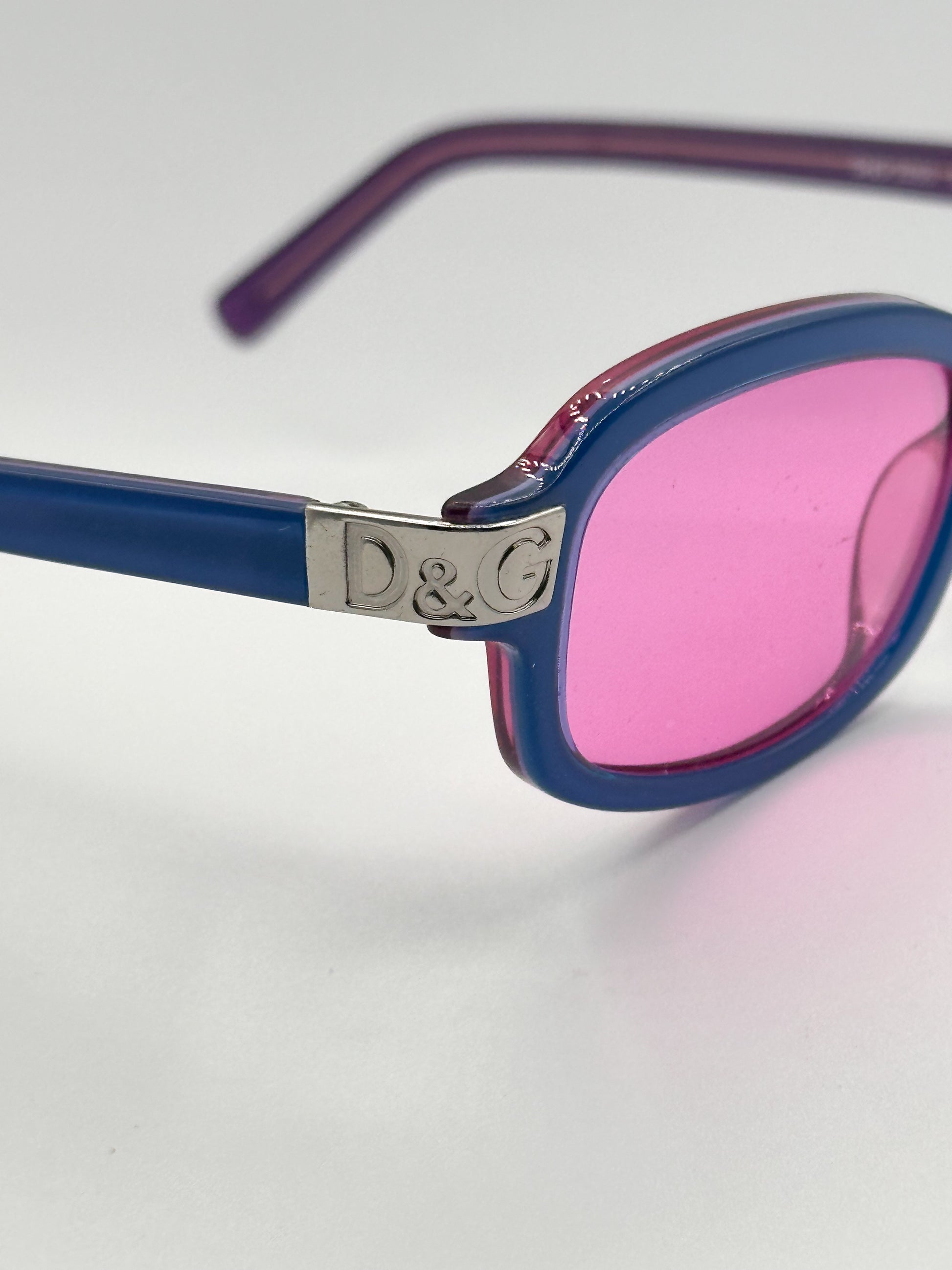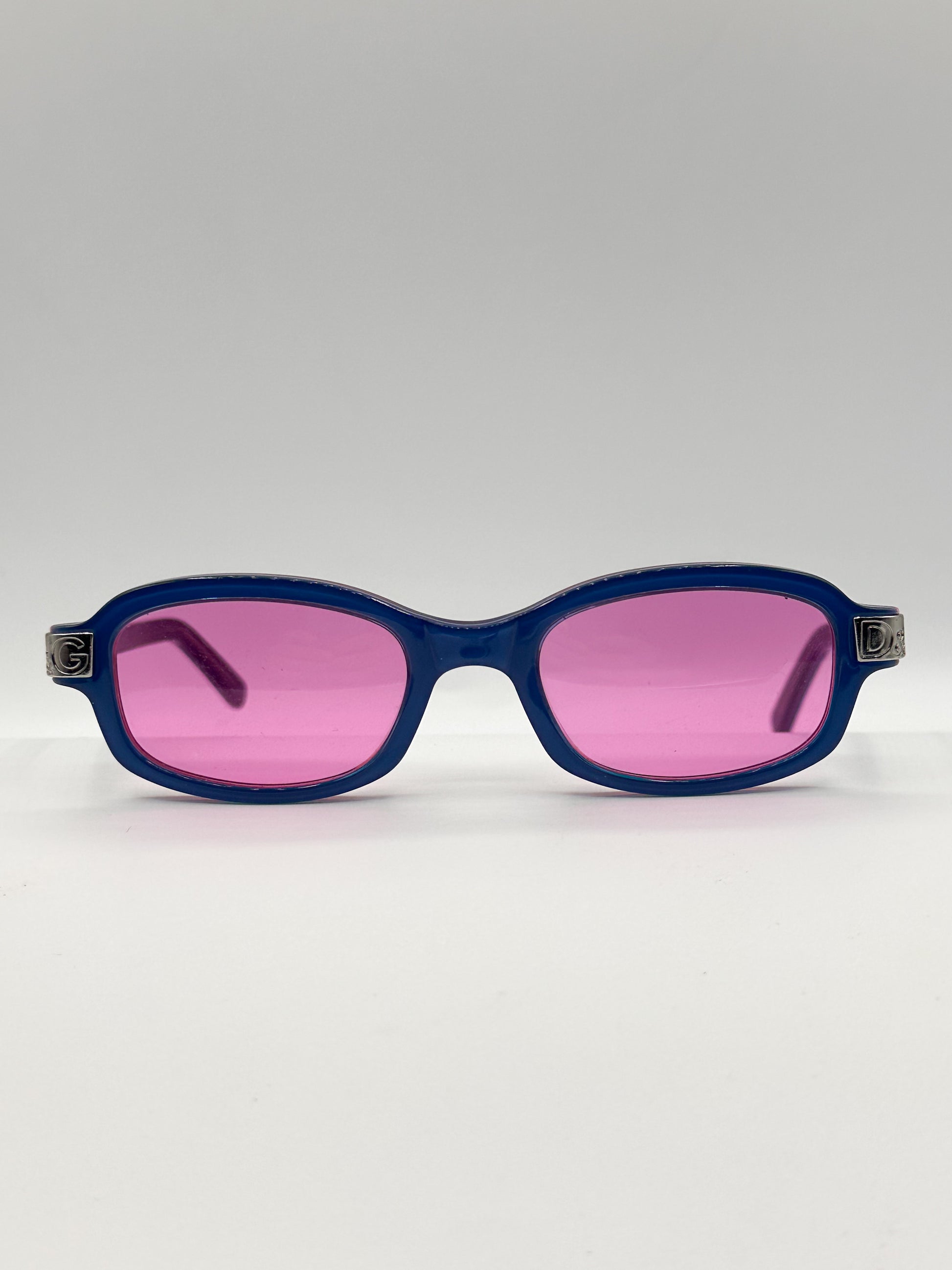 Dolce & Gabbana blue rectangle frame with pink original lenses. Made in Italy. The interior of the frame matches the lens, making this a through and through beautiful accessory. Best fits a Small face.