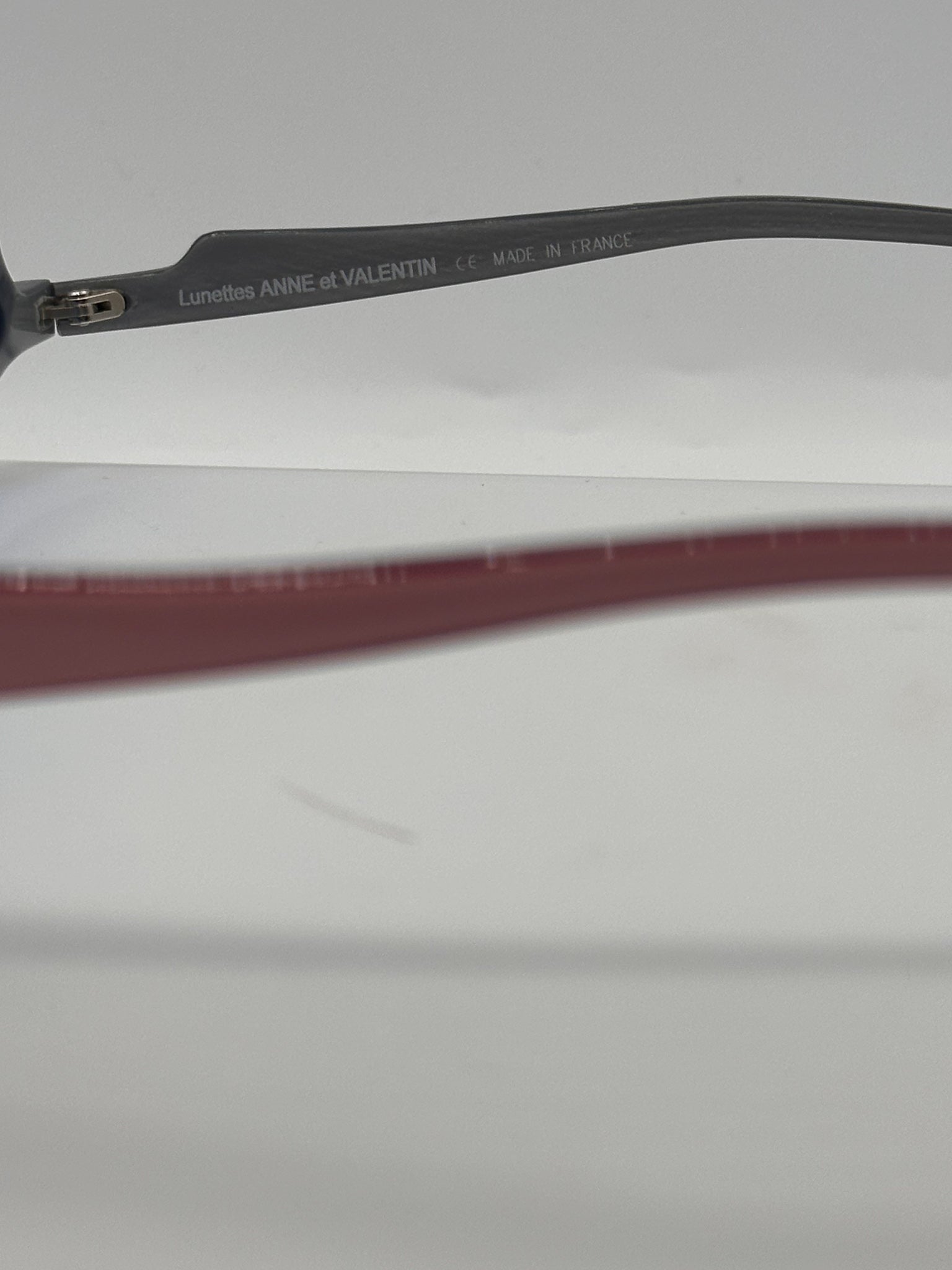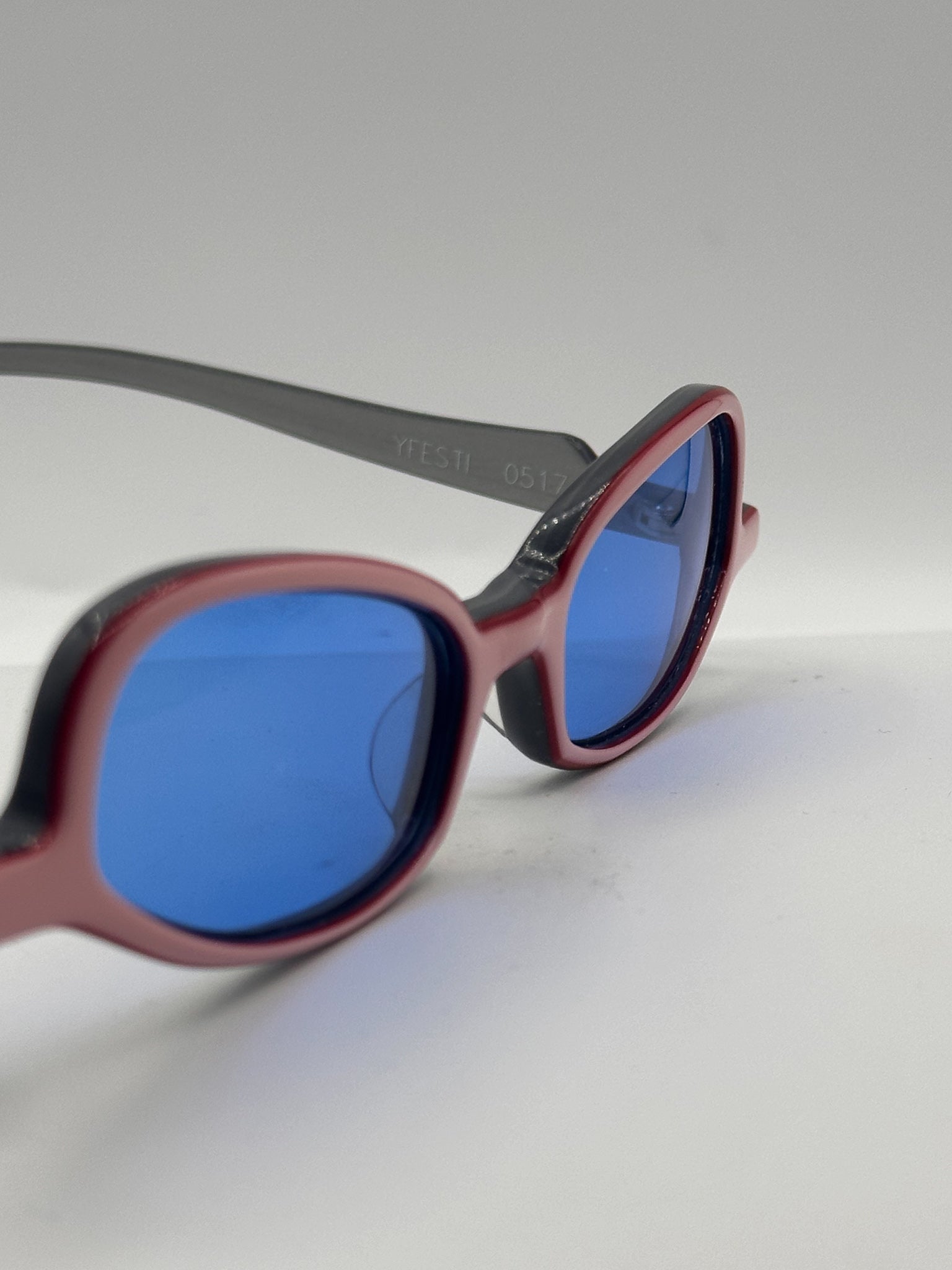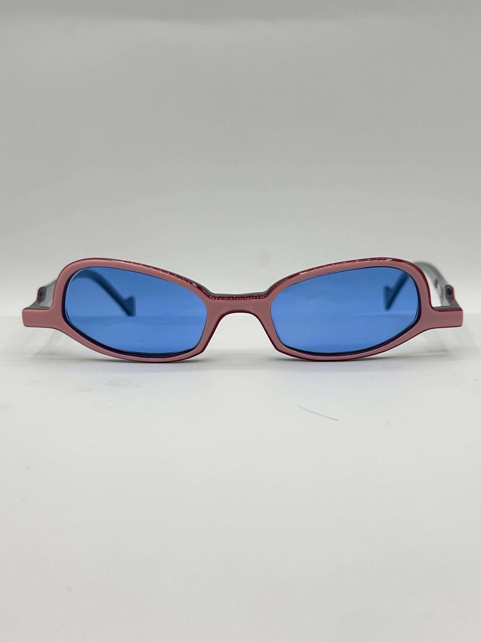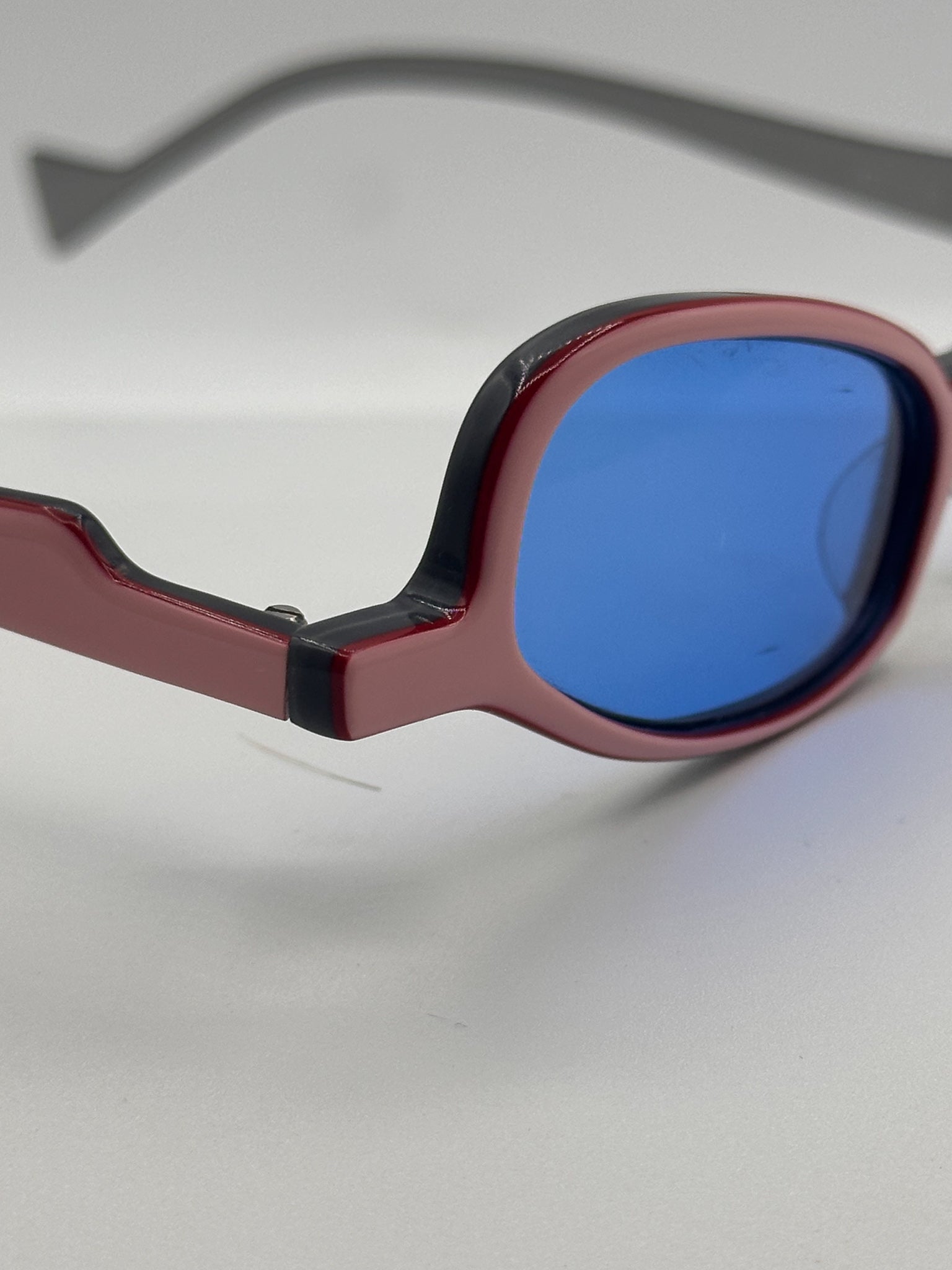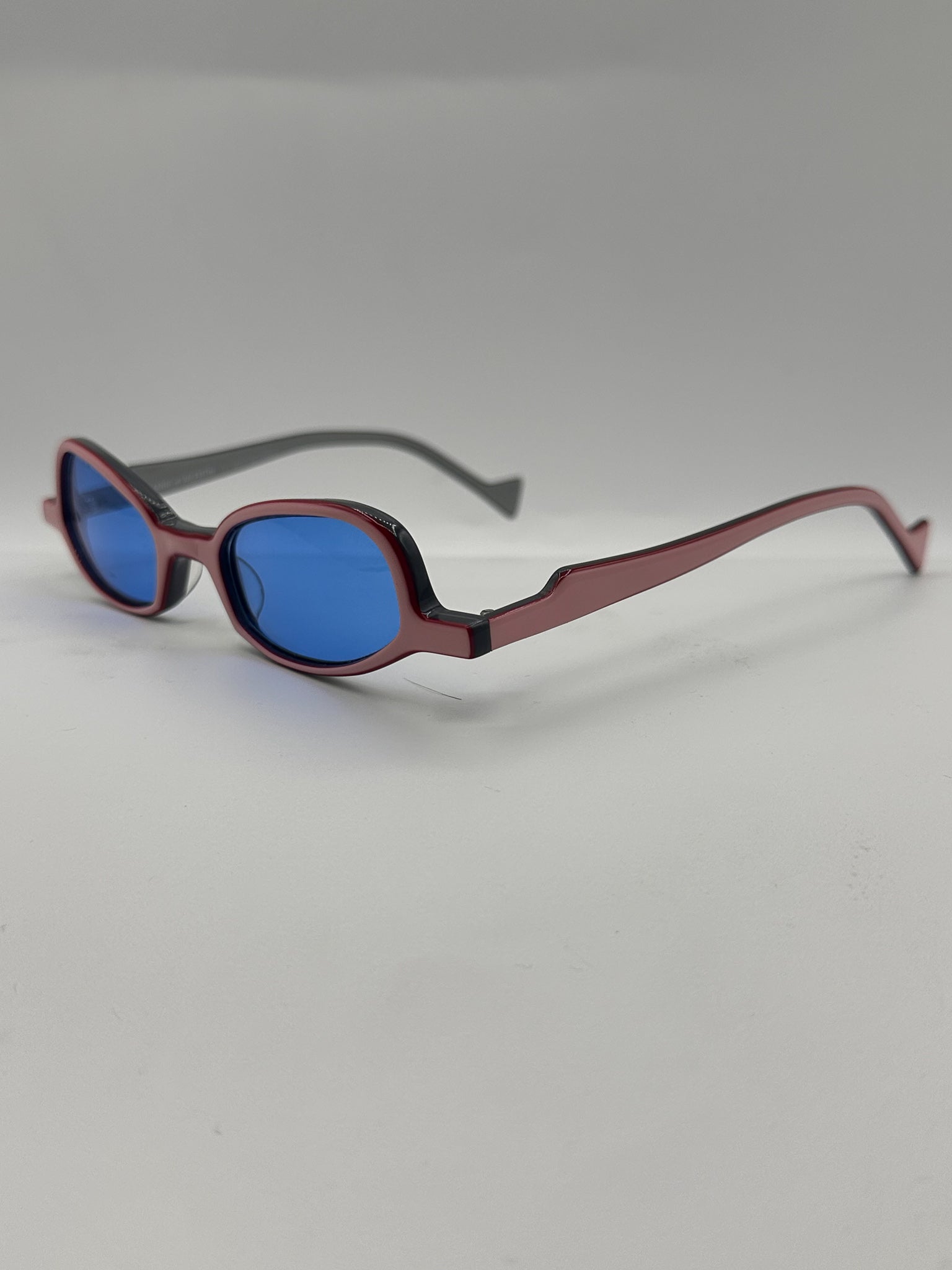 Anne et Valentin pink acetate multi-layered frame. Fun, futurisitic teardrop shape. Finished with brand new blue lenses.