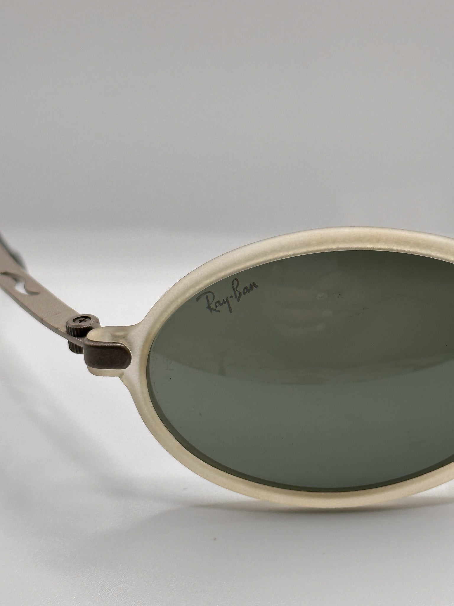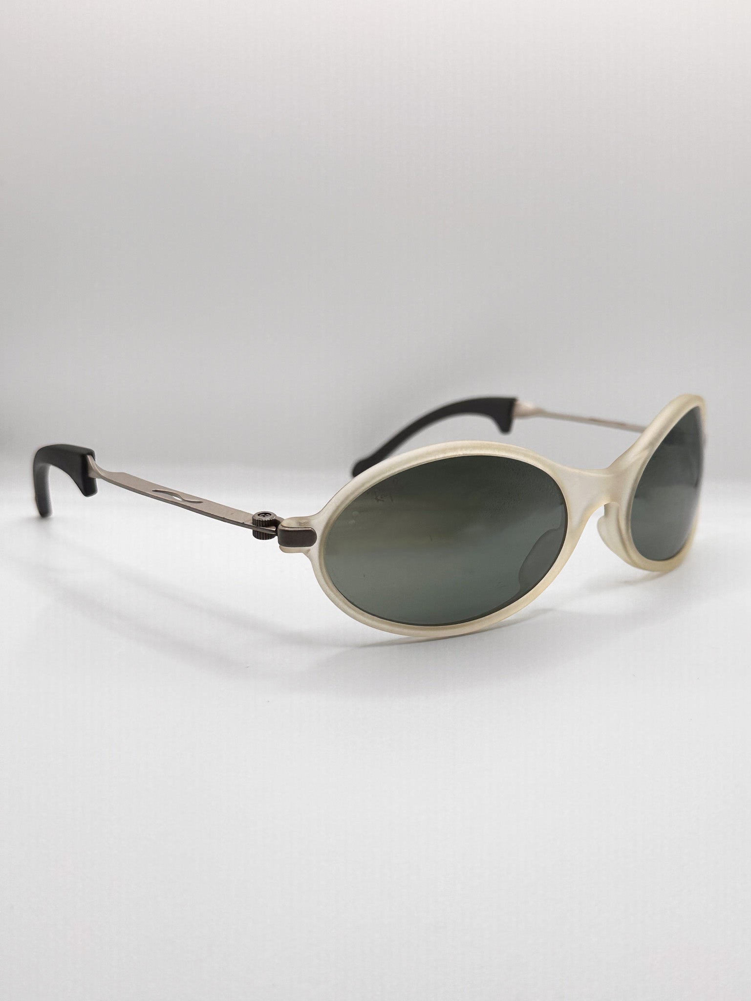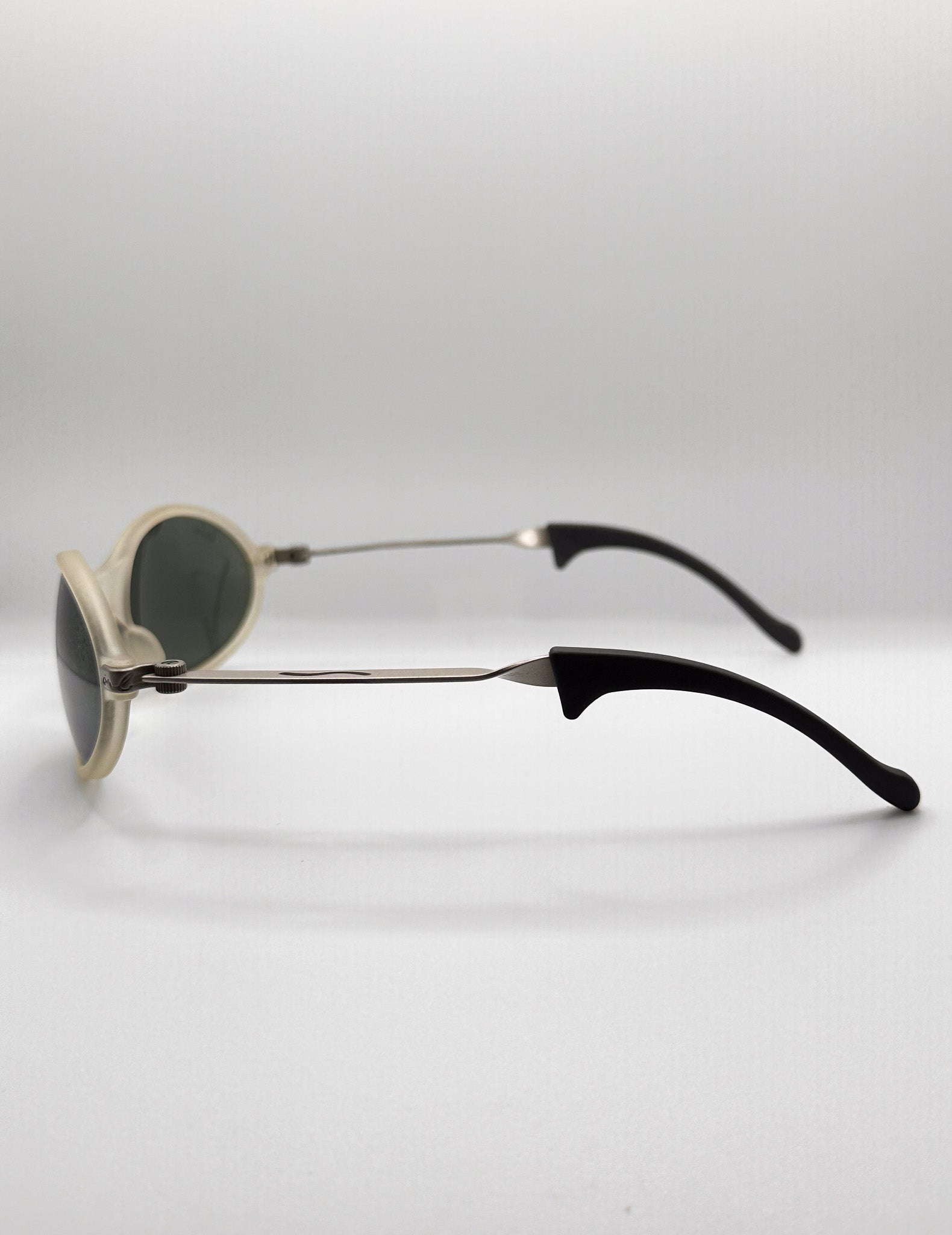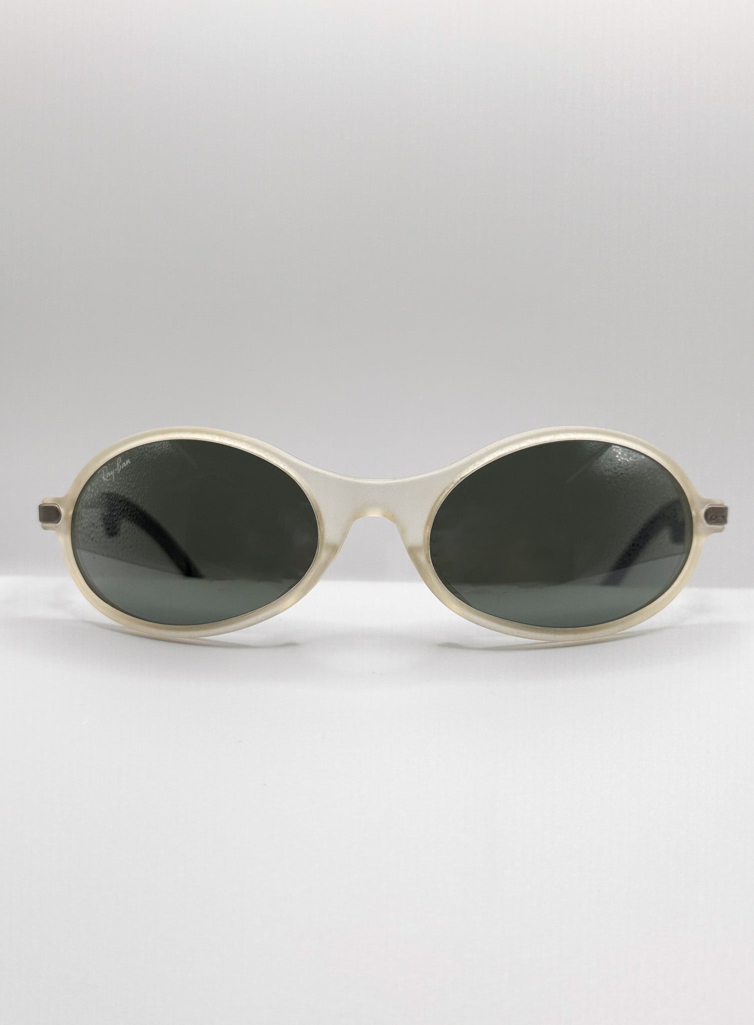 Super rare Ray-ban sunglasses! Heavy duty frame with steel twisted ear pieces, clear oval frame with wrap-around fit, suited well for active people. Polarized reflective lenses.