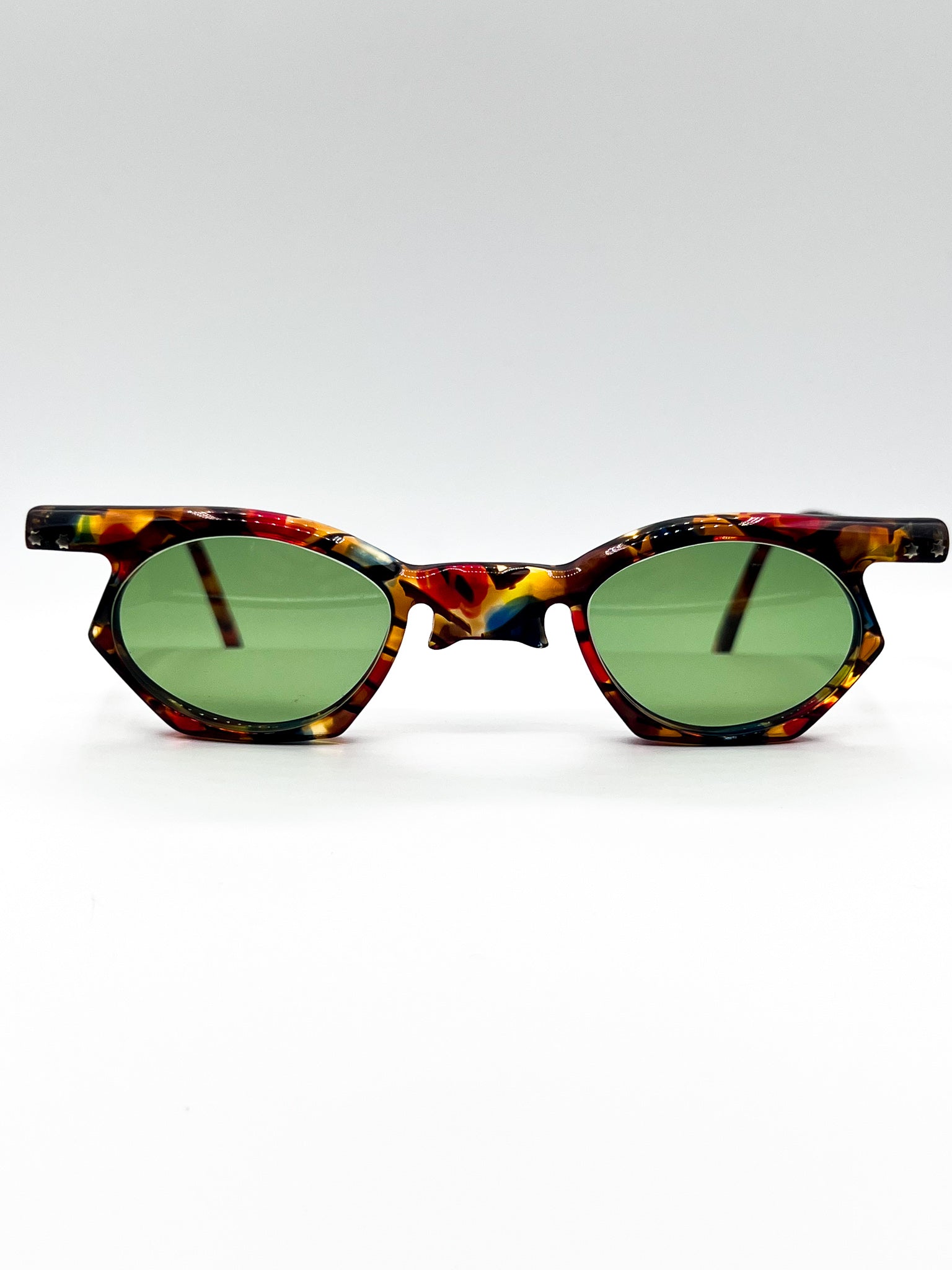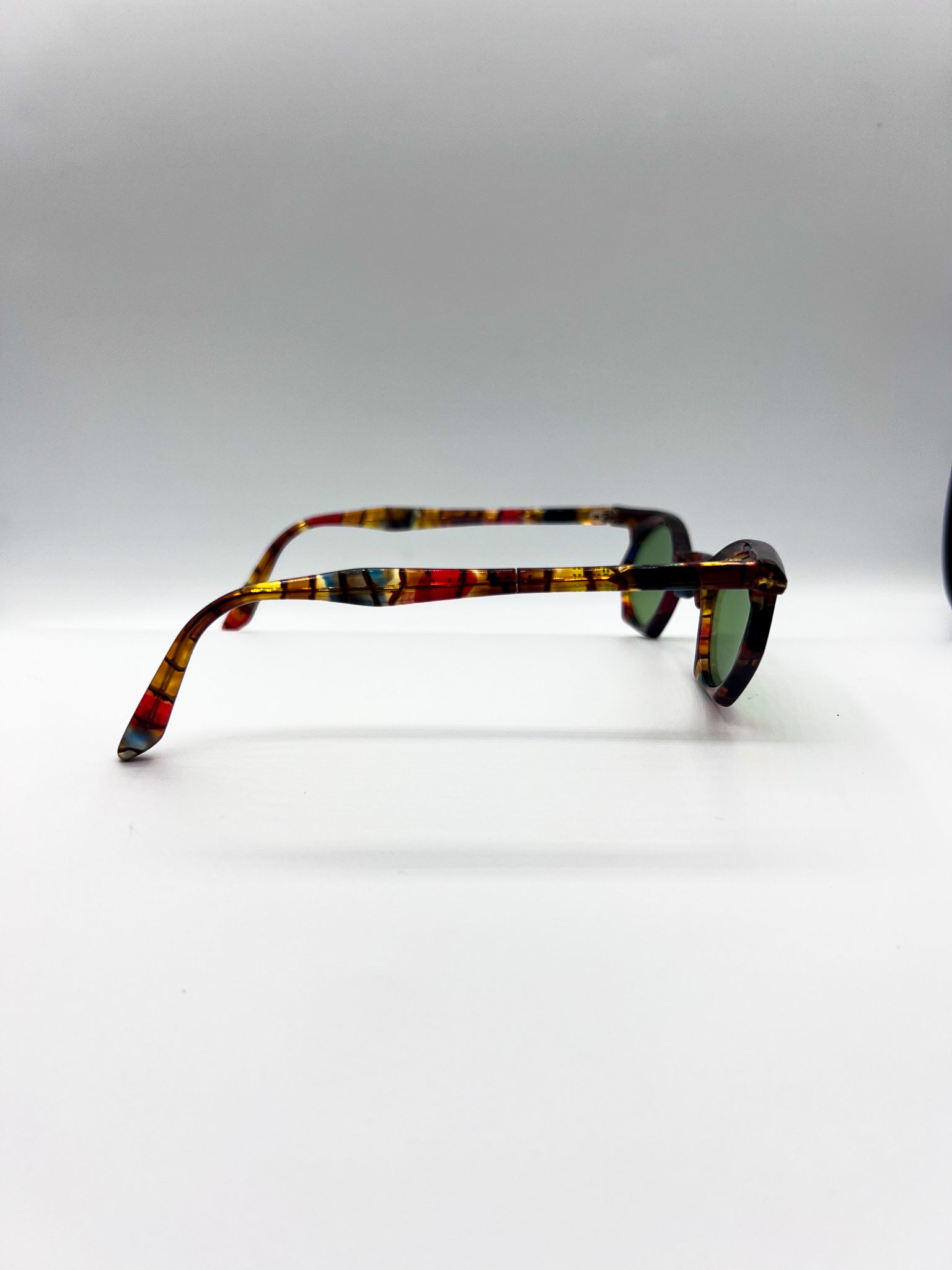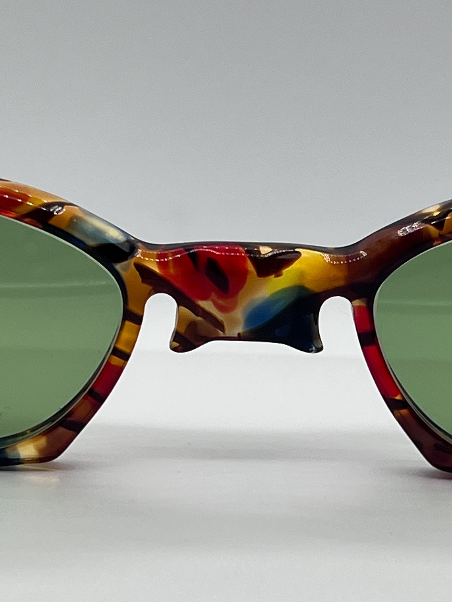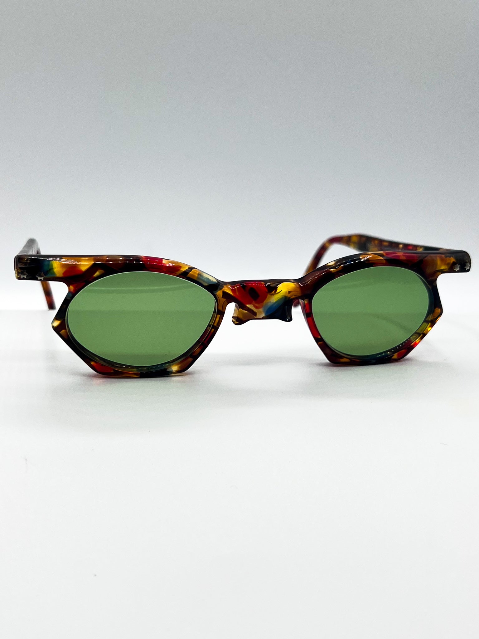 THIS IS PHONIX. HANDMADE FROM ACETATE. DANCING LINES COME TOGETHER TO CREATE A UNIQUE AND BEAUTIFUL PIECE. FINISHED WITH BRAND NEW, UV-PROTECTED GREEN LENSES.
