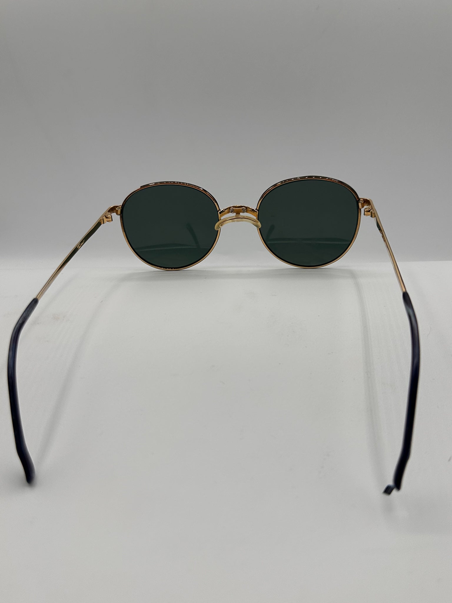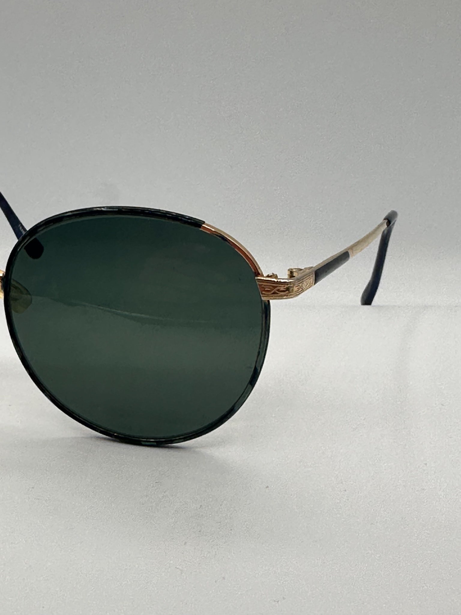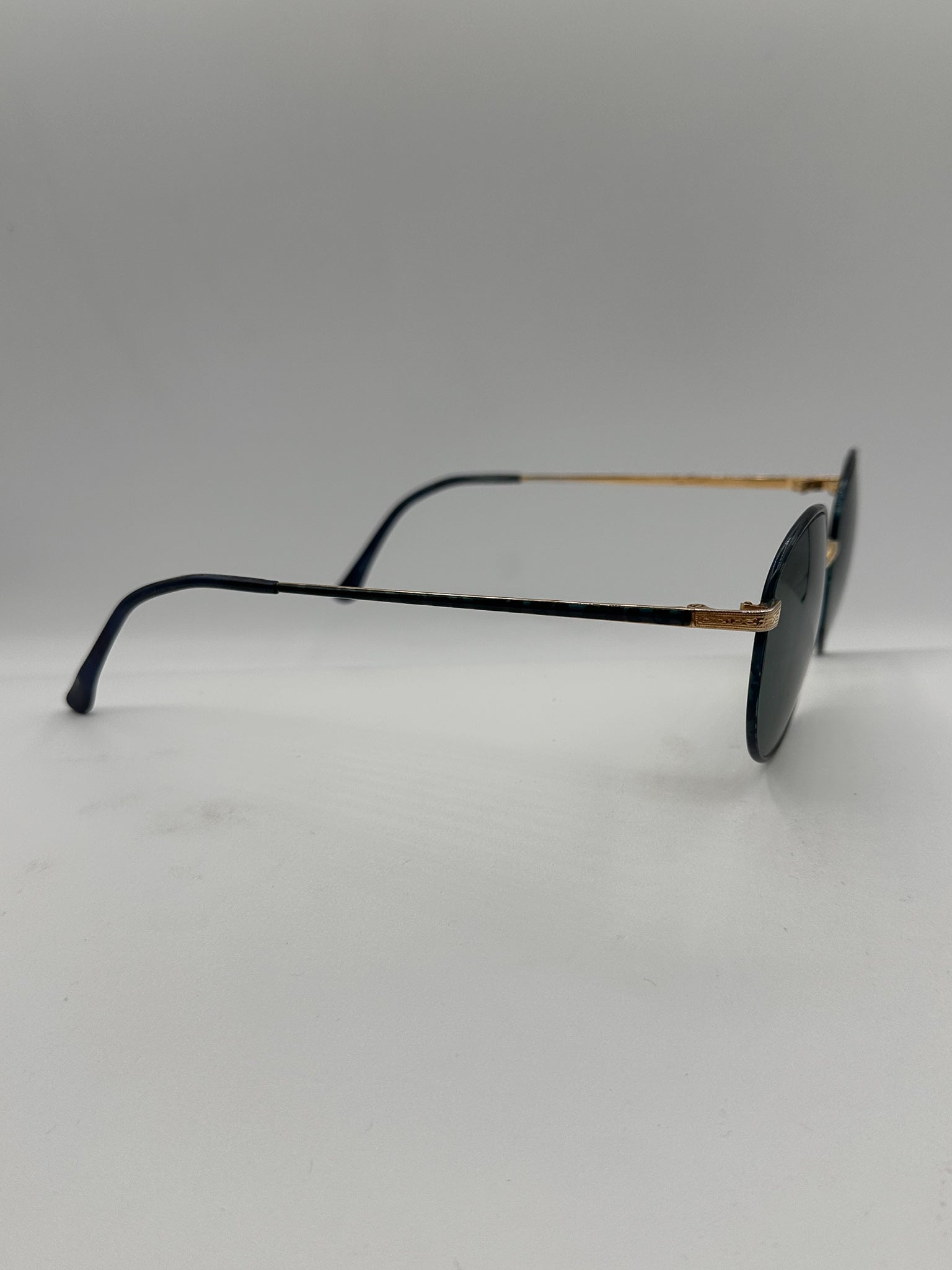 1980s Tura frames, made in Japan. These gold-plated, high-quality frames have a teal enamel detailing around it, with a bit missing on the upper left corner. There have been new polarized lenses added to these glasses. The nose piece is unique and retro-looking. This is a classic style frame with a vintage twist.