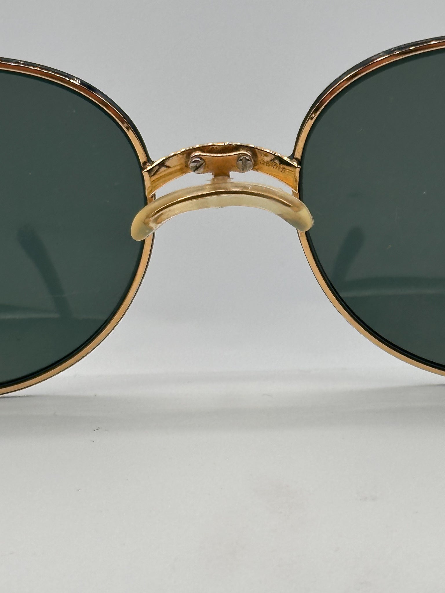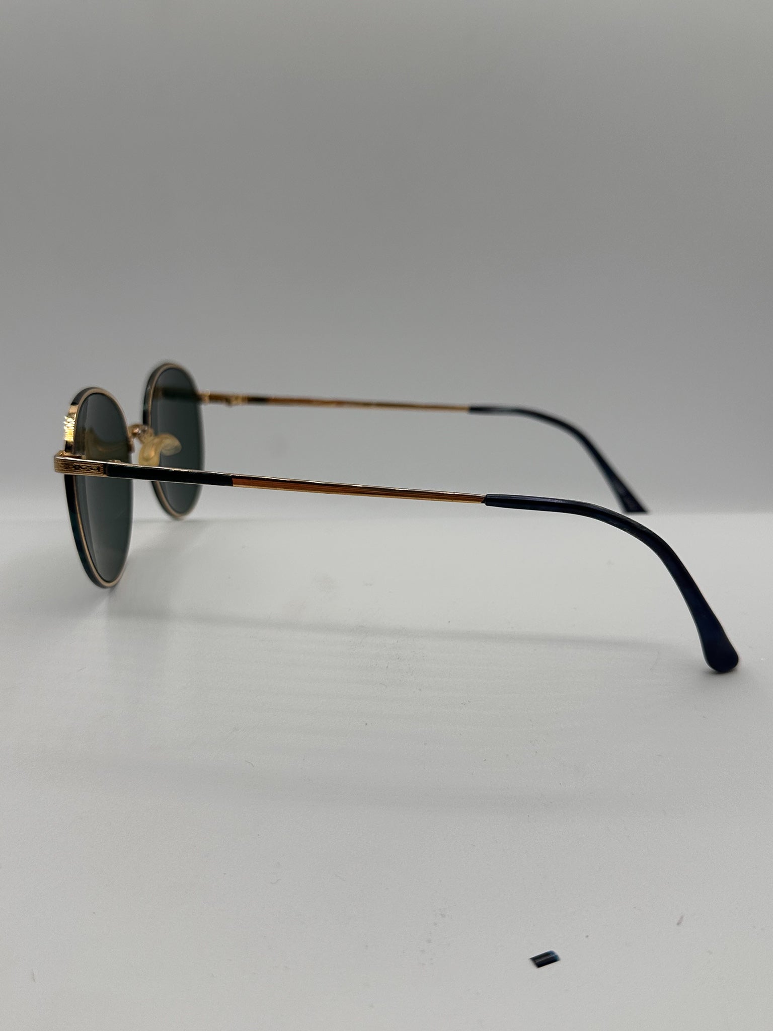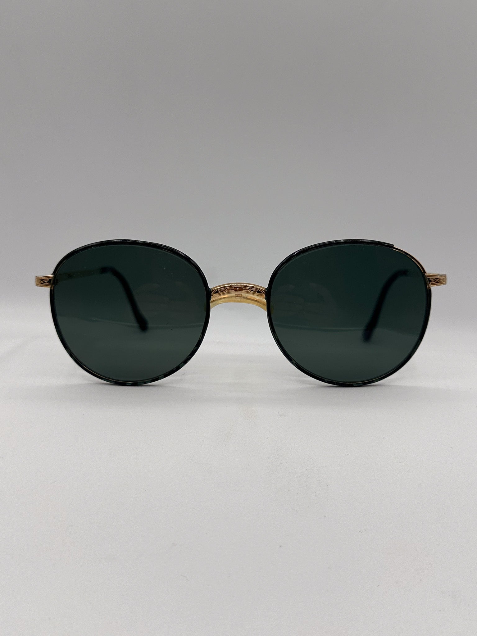 1980s Tura frames, made in Japan. These gold-plated, high-quality frames have a teal enamel detailing around it, with a bit missing on the upper left corner. There have been new polarized lenses added to these glasses. The nose piece is unique and retro-looking. This is a classic style frame with a vintage twist.