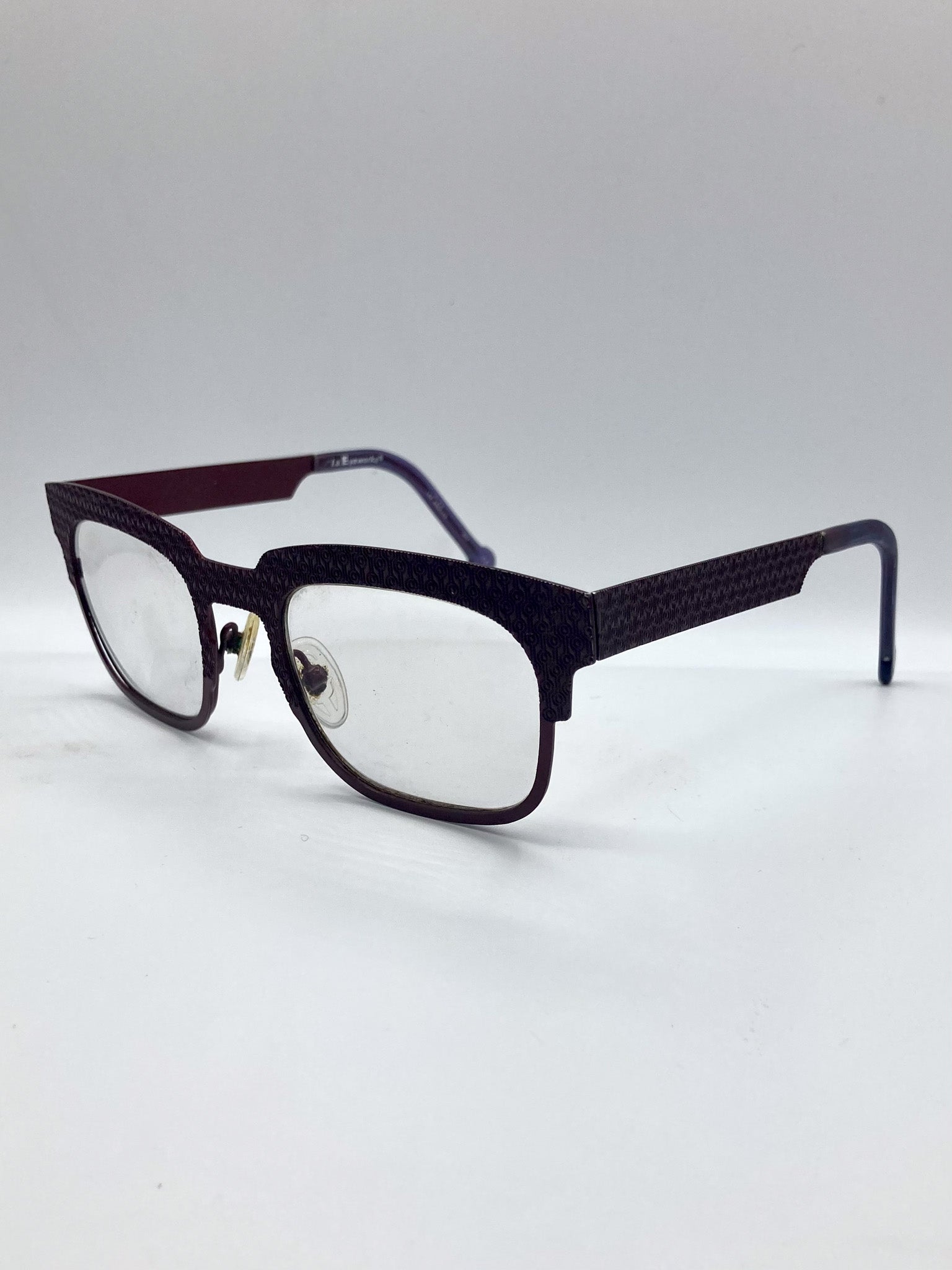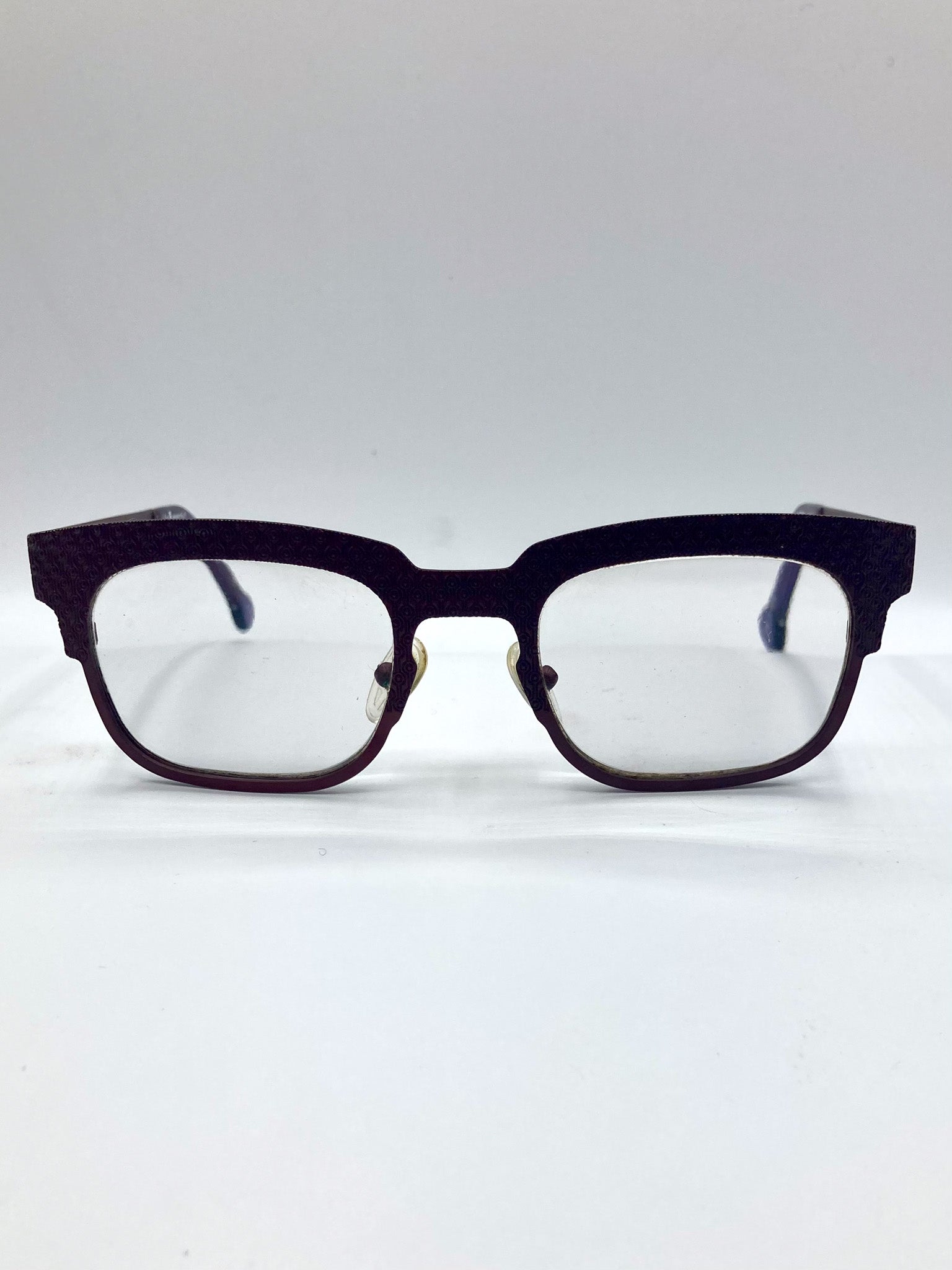 L.A. Eyeworks "Silverman" 478M. Rectangular burgundy metal frames with textured circular patterned top, front, and arms. Acetate earpieces with circle tips.