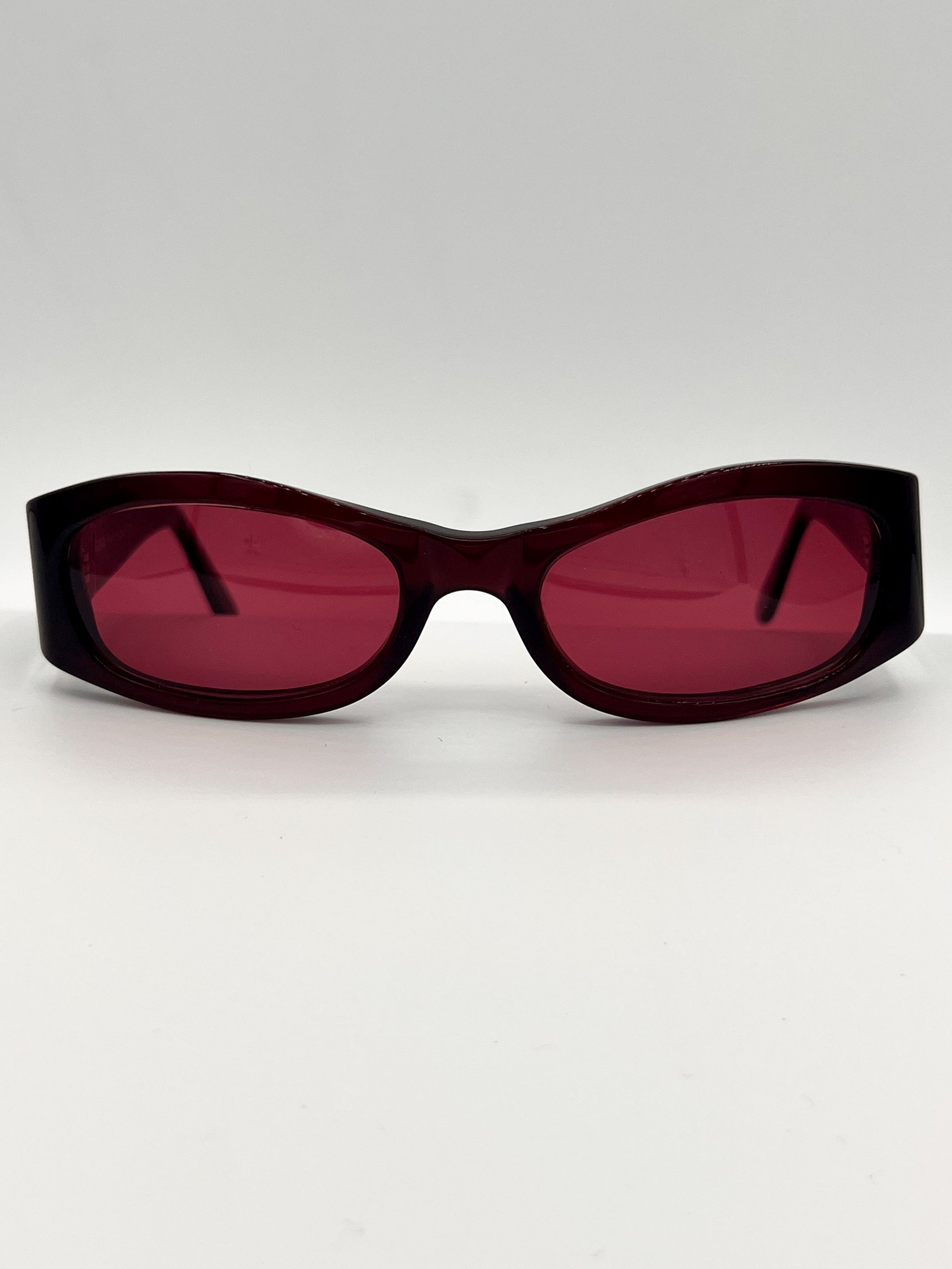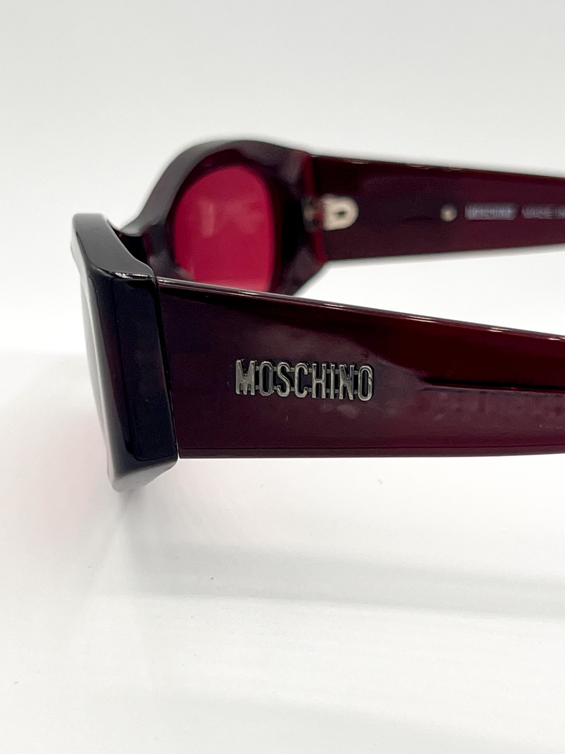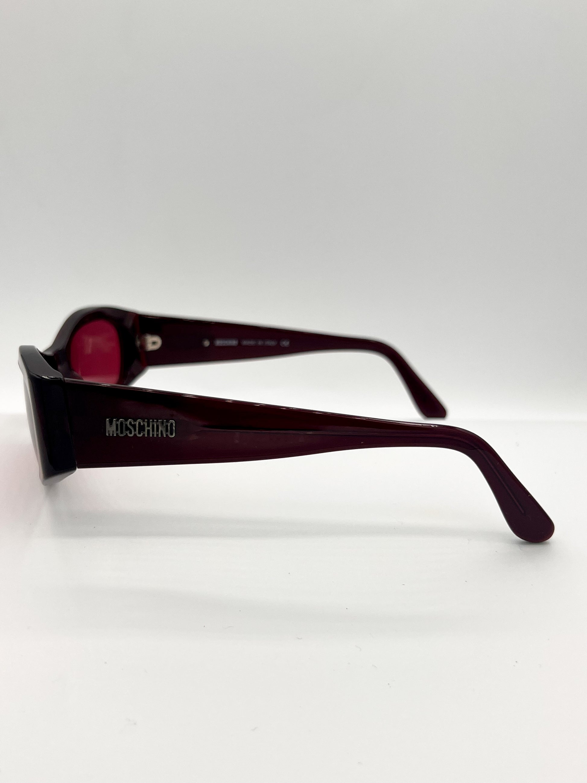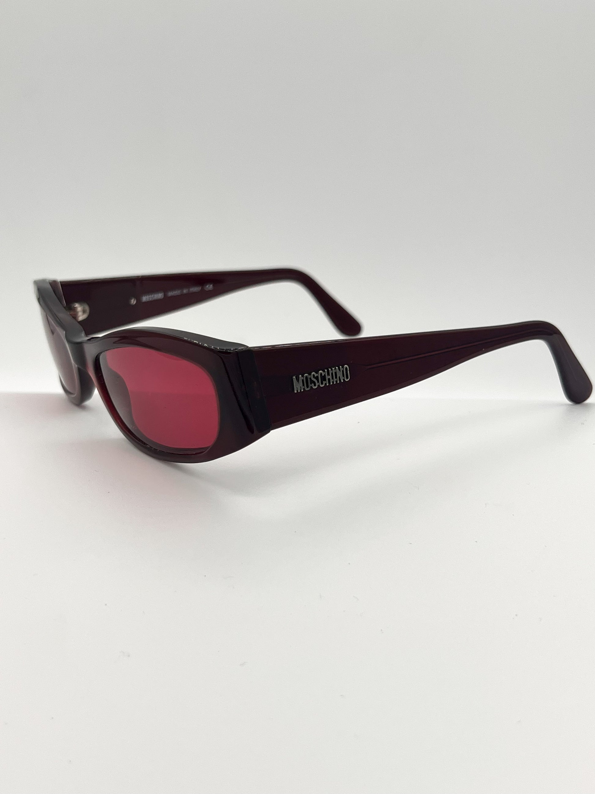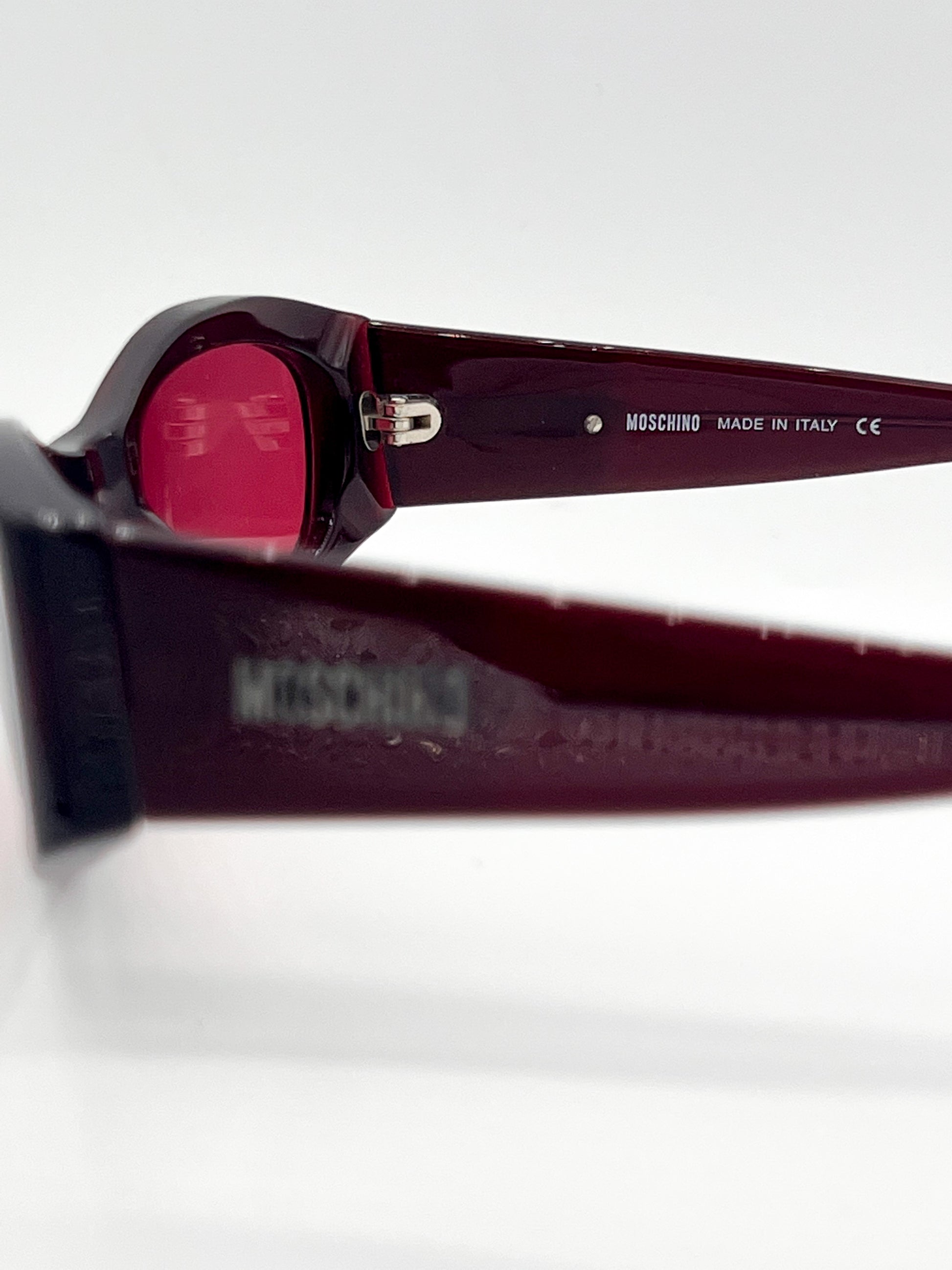 1990s burgundy Moschino rectangular with burgundy lenses to match. Adornment on each ear.