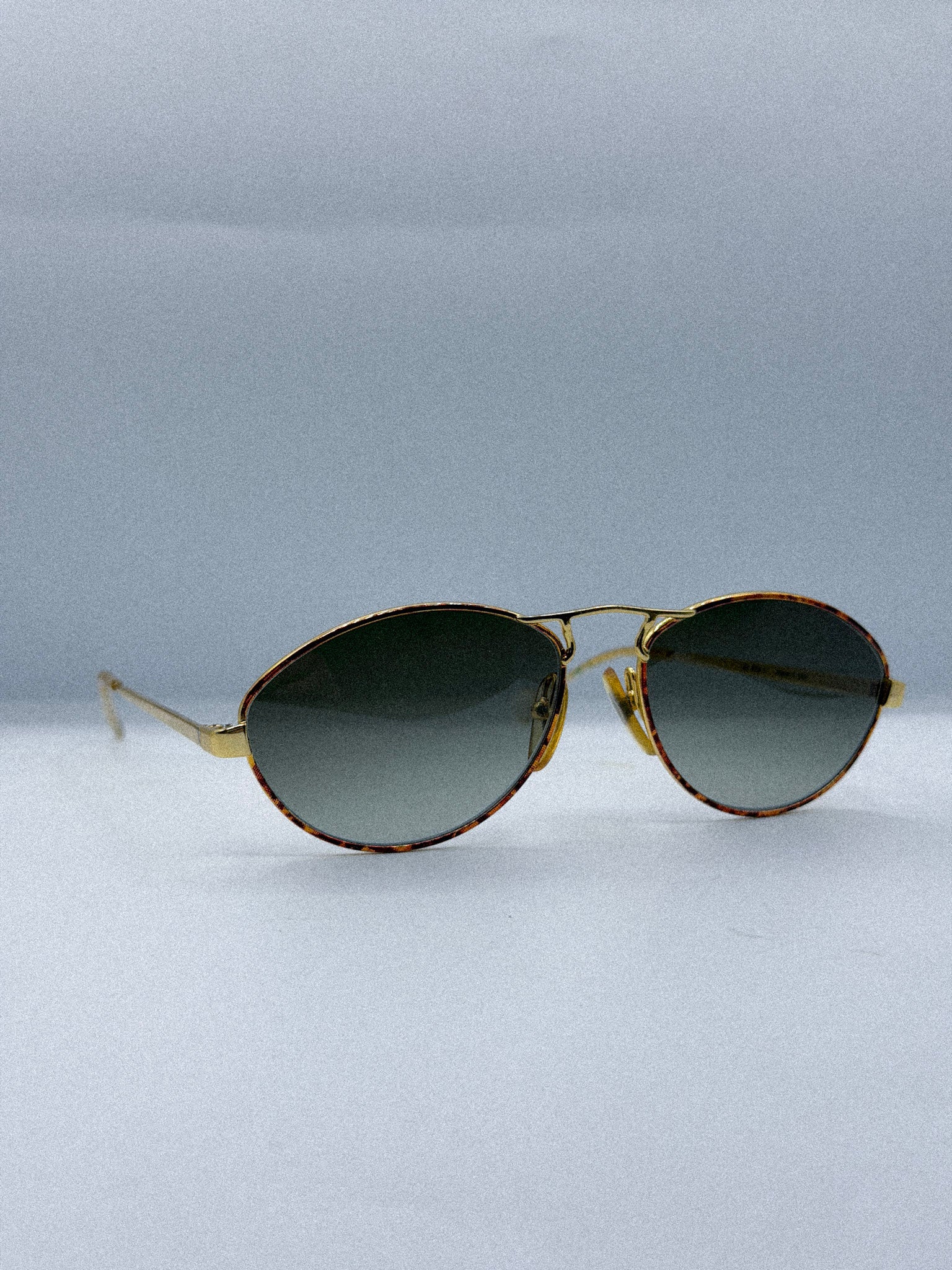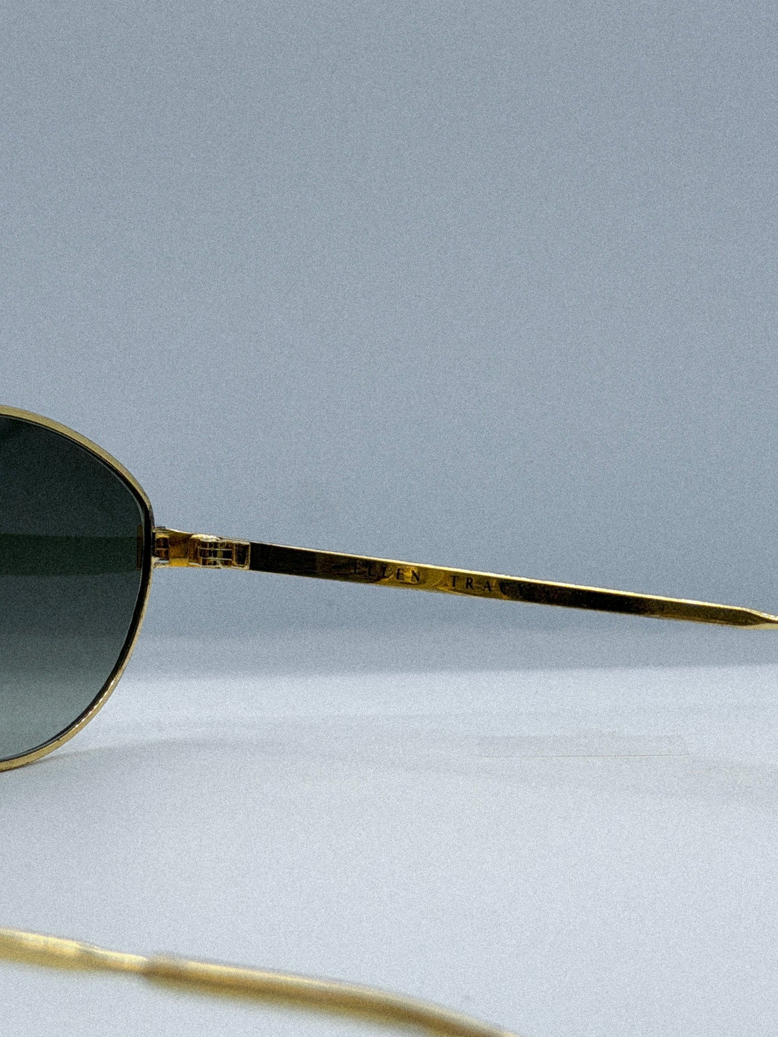 An elegant expression of 1980s Italian refinement, these Ellen Tracy sunglasses soften structure with a gently slouched oval silhouette. The slim gold metal frame traces the lenses with delicate precision, while the new green gradient lenses fade from deep olive to a lighter haze.