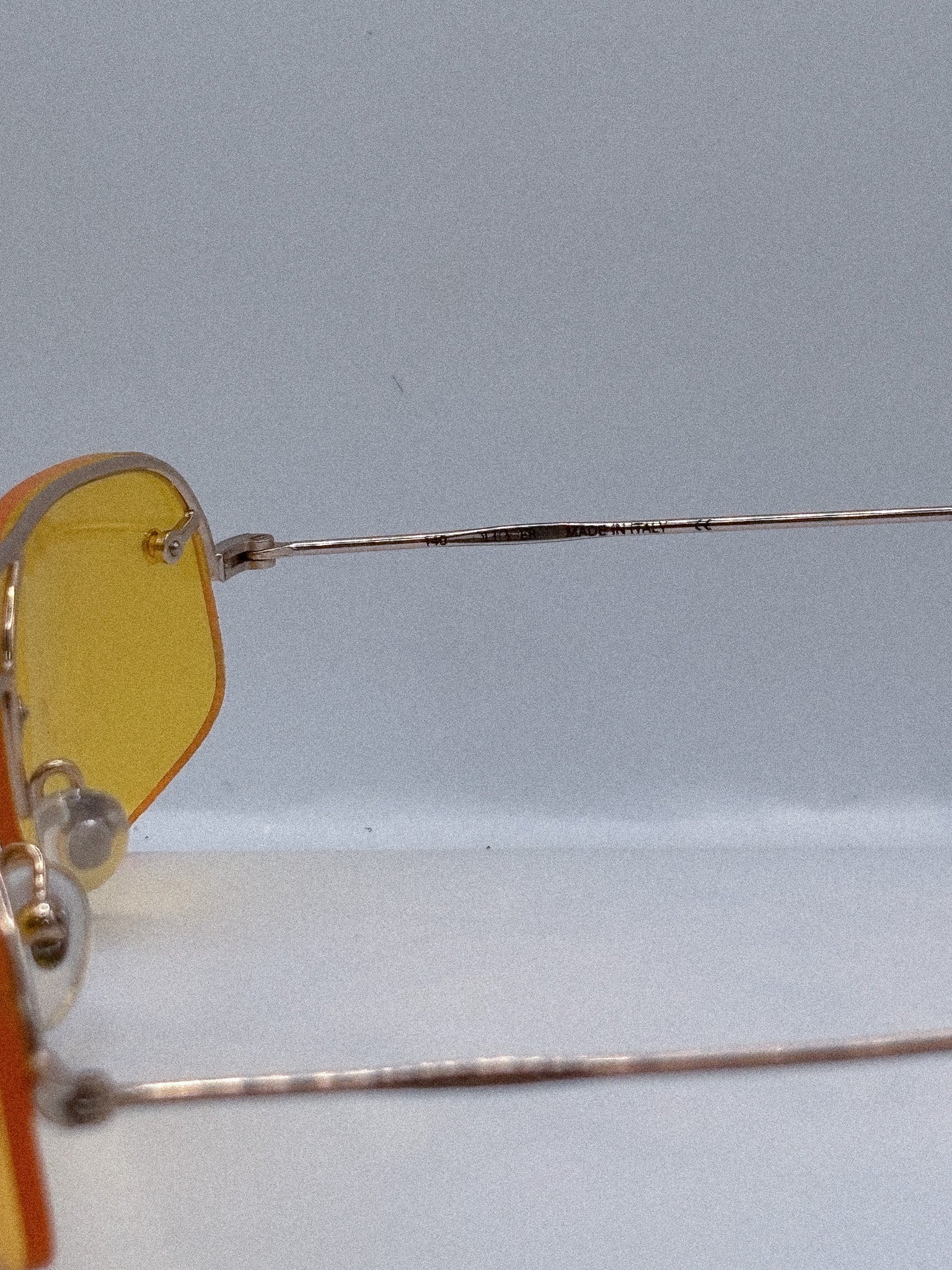 These 1990s Oliver by Valentino rimless frames capture the spirit of minimalist luxury with a hint of futurism. The golden yellow lenses radiate warmth and clarity, while the delicate metal bridge and transparent arms keep the focus on lightness and form. A subtle yet striking expression of 90s refinement.