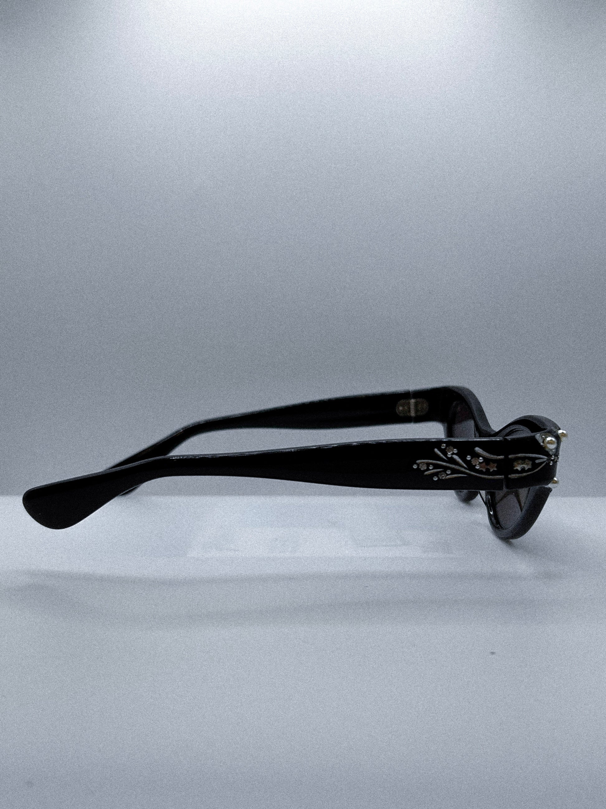 These 1960s sunglasses carry the theatrical glamour of midcentury American style, shaped into a lifted cat eye that feels both coy and confident. The glossy black front is accented with delicate bedazzled flourishes along the brow and temple corners, giving the frame a touch of sparkle reminiscent of vintage stage lights.